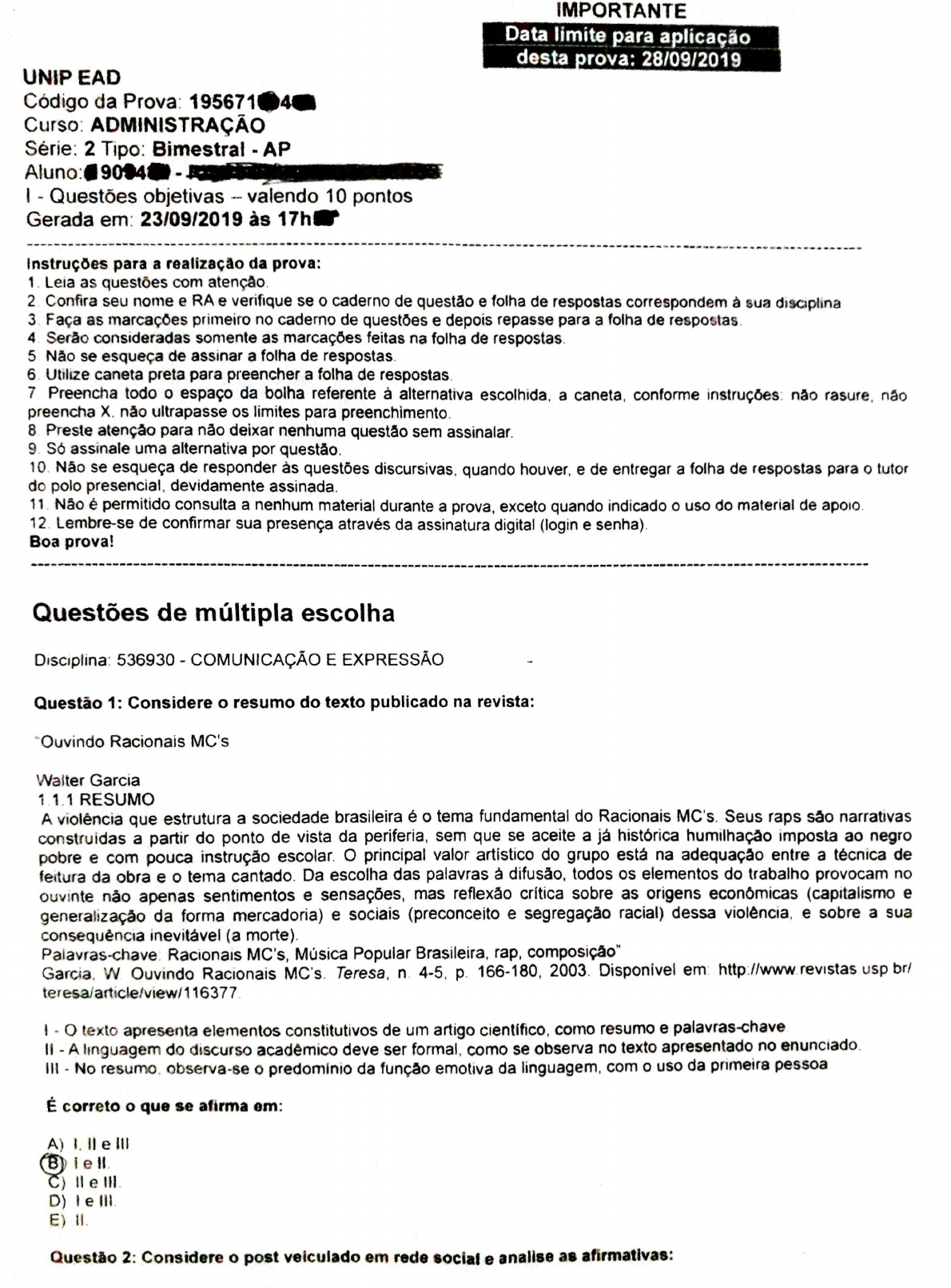 . IMPORTANTE UNIP EAD Código da Prova: 195671.4111 Curso: ADMINISTRAÇÃO Série: 2 Tipo: Bimestral - AP Aluno:.9094•- I - Questões objetivas - valendo 1 O pontos Gerada em: 23/09/2019 às 17hllr Data limite par_a __ aplicação desta rova: 28/09/2019 - -------- -------------------------- --------------------··---- Instruções para a realização da prova: 1 . Leia as questões com atençao. 2 Confira seu nome e RA e verifique se o caderno de questão e folha de respostas correspondem à sua d1saphna 3 . Faça as marcações primeiro no caderno de questões e depois repasse para a folha de respostas _ 4. Serão consideradas somente as marcações feitas na folha de respostas . 5 Não se esqueça de assinar a folha de respostas. 6. Utilize caneta preta para preencher a folha de respostas . 7 Preencha todo o espaço da bolha referente à alternativa escolhida, a caneta , conforme instruções: não rasure. nao preencna X. não ultrapasse os limites para preenchimento. 8 . Preste atenção para não deixar nenhuma questão sem assinalar. 9. Só assinale uma alternativa por questão. 1 O. Não se esqueça de responder às questões discursivas. quando houver, e de entregar a folha de respostas para o tutor do polo presencial , devidamente assinada. l l . Nâo é permitido consulta a nenhum material durante a prova, exceto quando indicado o uso do material de apo,o. 12 . Lembre-se de confirmar sua presença através da assinatura digital (login e senha) . Boa prova! -·------------------------------------------------------------------------------------------------------------------- Questões de múltipla escolha o,sc,plina: 536930 - COMUNICAÇÃO E EXPRESSÃO Questão 1: Considere o resumo do texto publicado na revista: ·ouvindo Racionais MC's Walter Garcia 1 1.1 RESUMO A víolência que estrutura a sociedade brasileira é o tema fundamental do Racionais MC's. Seus raps sao narrativas construidas a partir do ponto de vista da periferia, sem que se aceite a já histórica hum,lhaçao imposta ao negro pobre e com pouca instrução escolar. O principal valor artístico do grupo está na adequaçao entre a técnica de fertura da obra e o tema cantado. Da escolha das palavras à difusão, todos os elementos do trabalho provocam no ouvinte não apenas sentimentos e sensações, mas reflexão crítica sobre as origens econômicas (capitalismo e generalização da forma mercadoria) e sociais (preconceito e segregação racial) dessa violência . e sobre a sua consequência inevitável (a morte). Palavras-chave : Racionais MC's, Música Popular Brasileira, rap, composiçao" Garcia. W Ouvindo Racionais MC's . Teresa, n. 4-5 . p. 166-180, 2003. Disponível em. http://www.rev1stas usp br/ teres.a/articlelview/116377 . 1 - O texto apresenta elementos constitutivos de um artigo cientifico, corno resumo e palavras-chave li - A linguagem do discurso académico deve ser formal , como se observa no texto apresentado no enunciado. Ili - No resumo. observa-se o predominio da função emotiva da linguagem, com o uso da pnmeira pessoa É correto o que se afirma em: A) 1. li e Ili (B)}'l e ll . C) li e Ili. O) 1 e IIL E) ll. Questio 2: Considere o post veiculado em rede social e analiae aa afirmativas: Obrigada ue hora 111 1 - Infere-se que o intertocutor intencionava que "linda" fosse vocativo, mas a moça compreendeu como um predícattvo seu. li - A falta de virgula antes de "linda" na pergunta toma possivel a interpretação da moça. Ili - Trata-se de uma conversa por meio de um aplicativo, marcada pelo uso do nível informal de linguagem É correto o que se afirma em: 0) 1. li e Ili. B) 1 e 11 . C) JI e Ili . D) 1 e Ili . E) Ili. Questão 3: Considere a hipotética redação de um aluno em um processo seletivo e analise as afirmativas: ·0s refugiados Atualmente muitos países recebem muitos refugiados, que vem de lugares onde há guerras, conflitos , desastres naturais ou sem condições para uma vida com qualidade. Eles normalmente procuram países democráticos e desenvolvidos. Por isso, a Europa é o destino de muitos imigrantes. No entanto, a presença de refugiados causam problemas para os países que hospedam eles pois eles disputam empregos e como muitos não dominam o idioma, criam situações de miséria Esse quadro é um reflexo das relações liquidas, como afirma o sociólogo Bauman, pois as pessoas não criam vinculo com seu pais de origem. Antigamente as pessoas eram mais patriotas, agora não tem mais raízes Tratam- se de consequências da globalização. Deveriam haver pollticas públicas para que cada um fique no seu país e ajude a melhorar ele, pois essa situação não é boa nem para os refugiados nem para os demais países. 1 - O texto tem estrutura argumentativa, pois defende um ponto de vista em relação ao tema. f}J· - O texto apresenta erros gramaticais, tais como o problema de concordância verbal em "deveriam have( . no último parágrafo. Ili - O texto apresenta falhas argumentativas. como afirmações sem sustentação e generalizações É correto o que se afirma em: A) 1 e li . B) li e Ili. e) 1 e 111. ~ ") 1 1, 11 e Ili. 'EJ 1. Questão 4: (Enade/Letras - 2014) Os casos de Interpretação ambígua em textos jornalísticos ocorrem muitas vezes porque o leitor só 16 a manchete, não o texto total. Considerando o exposto, avalie as manchetes transcrita• a seguir: 1 - Jovem tenta assaltar PM com arma de brinquedo e é baleado na zona sul de S~o Paulo (http //not,c,as .r7 com ) li - A ONU está à procura de um técnico para ocupar o cargo de diretor daquele centro de estudos sobre a pobreza que vai instalar no Rio (http://pagina20.uol.com.br) . , Ili - Macarrão levou Eliza Samudio para ser morta por amar Bruno. diz advogado do goleiro ihttp '· ---·~- --- (t0t1cias.uo1 com.br) IV · Gove · · · rno inclui vacina contra hepatite A no calendári d . • 0 e vacmaçao do SUS (http //g1 .globo com br) :samale a altematíva correta: ) As afirmativas I e IV estão cor