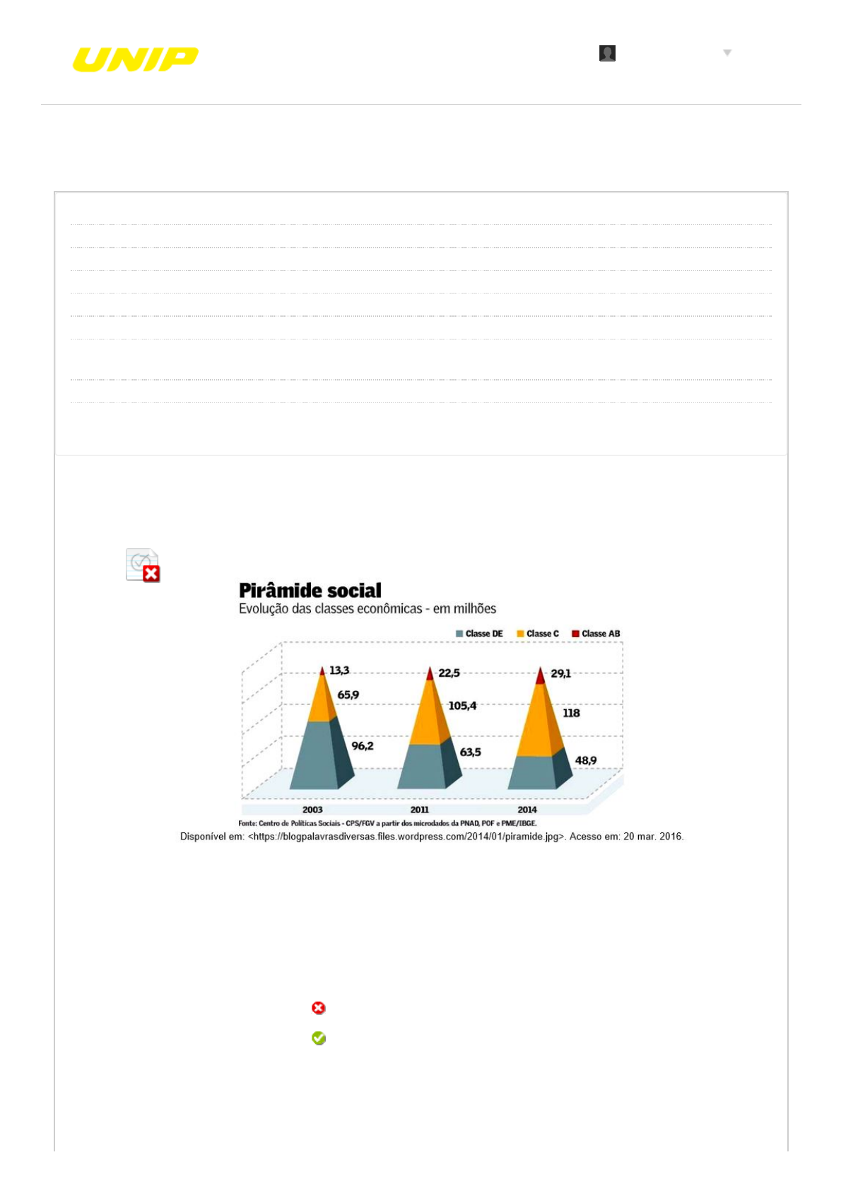 12/02/2020 Revisar envio do teste: QUESTIONÁRIO UNIDADE II – 5366-... https://ava.ead.unip.br/webapps/assessment/review/review.jsp?attempt_id=_29220783_1&course_id=_63594_1&content_id=_885005_1&return… 1/11 Revisar envio do teste: QUESTIONÁRIO UNIDADE II INTERPRETAÇÃO E PRODUÇÃO DE TEXTOS 5366-30_59101_R_20201_01 CONTEÚDO Usuário Itallo Teixeira Borges Curso INTERPRETAÇÃO E PRODUÇÃO DE TEXTOS Teste QUESTIONÁRIO UNIDADE II Iniciado 12/02/20 21:43 Enviado 12/02/20 22:37 Status Completada Resultado da tentativa 2,5 em 5 pontos Tempo decorrido 54 minutos Resultados exibidos Todas as respostas, Respostas enviadas, Respostas corretas, Comentários, Perguntas respondidas incorretamente Pergunta 1 Resposta Selecionada: b. Respostas: a. b. c. d. Analise o grá�co e as a�rmativas a seguir. I. Em 2003, cerca de 55% da população encontravam-se nas classes D/E. II. De 2003 a 2014, observa-se o crescimento da classe C e o encolhimento das classes D/E e A/B. III. Em 2014, as classes mais pobres (D/E) representavam, aproximadamente, um quarto da população. IV. O grá�co sugere melhora na distribuição de renda no Brasil de 2003 a 2014. Está correto o que se a�rma somente em: II e III. I, III e IV. II e III. I e III. I, II e IV. UNIP EAD BIBLIOTECAS MURAL DO ALUNO TUTORIAISCONTEÚDOS ACADÊMICOS 0 em 0,5 pontos Itallo Borges https://ava.ead.unip.br/webapps/blackboard/execute/courseMain?course_id=_63594_1 https://ava.ead.unip.br/webapps/blackboard/content/listContent.jsp?course_id=_63594_1&content_id=_884997_1&mode=reset https://ava.ead.unip.br/webapps/portal/execute/tabs/tabAction?tab_tab_group_id=_10_1 https://ava.ead.unip.br/webapps/portal/execute/tabs/tabAction?tab_tab_group_id=_27_1 https://ava.ead.unip.br/webapps/portal/execute/tabs/tabAction?tab_tab_group_id=_47_1 https://ava.ead.unip.br/webapps/portal/execute/tabs/tabAction?tab_tab_group_id=_29_1 https://ava.ead.unip.br/webapps/portal/execute/tabs/tabAction?tab_tab_group_id=_25_1 https://ava.ead.unip.br/webapps/login/?action=logout 12/02/2020 Revisar envio do teste: QUESTIONÁRIO UNIDADE II – 5366-... https://ava.ead.unip.br/webapps/assessment/review/review.jsp?attempt_id=_29220783_1&course_id=_63594_1&content_id=_885005_1&return… 2/11 e. II, III e IV. Pergunta 2 Resposta Selecionada: c. Respostas: a. b. c. d. e. Feedback da resposta: Considere as duas manchetes e analise as a�rmativas a seguir. I. Os dois títulos relatam com o mesmo efeito de sentido a morte de Fidel Castro, pois obedecem às normas da redação jornalística. II. A escolha de “líder” ou de “ditador” é indiferente, pois as duas palavras servem para se referir ao presidente cubano e não há diferença semântica entre elas. III. O jornal brasileiro constrói para o leitor uma imagem mais negativa do político do que o periódico norte-americano. É correto o que se a�rma somente em: III. I. II. III. I e II. II e III. Alternativa: C Comentário: o efeito de sentido não é o mesmo nos dois títulos, pois “ditador” e “líder” constroem imagens distintas do presidente cubano. O título da Folha de S.Paulo, com o uso da palavra “ditador”, apresenta ao leitor uma imagem negativa de Fidel Castro. Pergunta 3 0,5 em 0,5 pontos 0 em 0,5 pontos 12/02/2020 Revisar envio do teste: QUESTIONÁRIO UNIDADE II – 5366-... https://ava.ead.unip.br/webapps/assessment/review/review.jsp?attempt_id=_29220783_1&course_id=_63594_1&content_id=_885005_1&return… 3/11 Resposta Selecionada: b. Respostas: a. b. c. d. e. Leia a charge a seguir. Com base na leitura, analise as a�rmativas. I. A charge ilustra a evolução histórica da civilização e sugere que a humanidade caminha em direção ao progresso. II. A charge relaciona positivamente o desenvolvimento tecnológico e o bem-estar dos cidadãos. III. A charge indica que o caminho para o progresso exige perseverança e só é possível no ambiente urbano. Assinale a alternativa correta. I é correta. Nenhuma a�rmativa é correta. I é correta. III é correta. I e II são corretas. II é correta. Pergunta 4 Leia o artigo de Mônica Sousa, �lha do desenhista Mauricio de Sousa e inspiradora da personagem Mônica das histórias em quadrinhos. Em seguida, observe a tirinha. Somos todas donas da rua 08/03/2016 “No começo, a Turminha era formada só de meninos: Franjinha, Cebolinha, Chico Bento. Até que começaram a perguntar para o meu pai: ‘Cadê as meninas?’. Mauricio conhecia mais o universo dos garotos. Foi aí que ele começou a olhar em volta e percebeu que poderia se inspirar nas �lhas. Em 1963, Mônica estreou na tirinha do Cebolinha e encantou todo mundo com um jeito que não era considerado exatamente feminino para a época. Ela era forte, decidida, dona da rua. Eu era também. Meu pai sempre me deixou ser do meu jeito, sem me limitar por ser menina. Para ele, minha autenticidade (e de todos nós, seus dez �lhos) sempre foi importante. É só ver, nos gibis, as peculiaridades de cada personagem baseado em nós. Quando uma menina ou mulher é mais, digamos, assertiva, logo leva a fama de mandona. Mas, para mim, o que a Mônica sempre teve foi uma autocon�ança enorme, além de um grande sentimento de responsabilidade em relação a seus amigos. Meninas em todo o Brasil e em vários países do mundo se identi�cam com a dentucinha, cuja força maior não é a física: é a força de quem acredita em seus sonhos e capacidades. Na época em que a personagem nasceu, os anos 1960, as mulheres começavam a ganhar mais espaço no mercado de trabalho. No ano de publicação da primeira tirinha em que a Mônica aparece, a russa Valentina Tereshkova foi a primeira mulher a viajar ao espaço. Mas 0 em 0,5 pontos 12/02/2020 Revisar envio do teste: QUESTIONÁRIO UNIDADE II – 5366-... https://ava.ead.unip.br/webapps/assessment/review/review.jsp?attempt_id=_29220783_1&course_id=_63594_1&content_id=_885005_1&return… 4/11 Resposta Selecionada: e. Respostas: a. b. c. d. e. o caminh