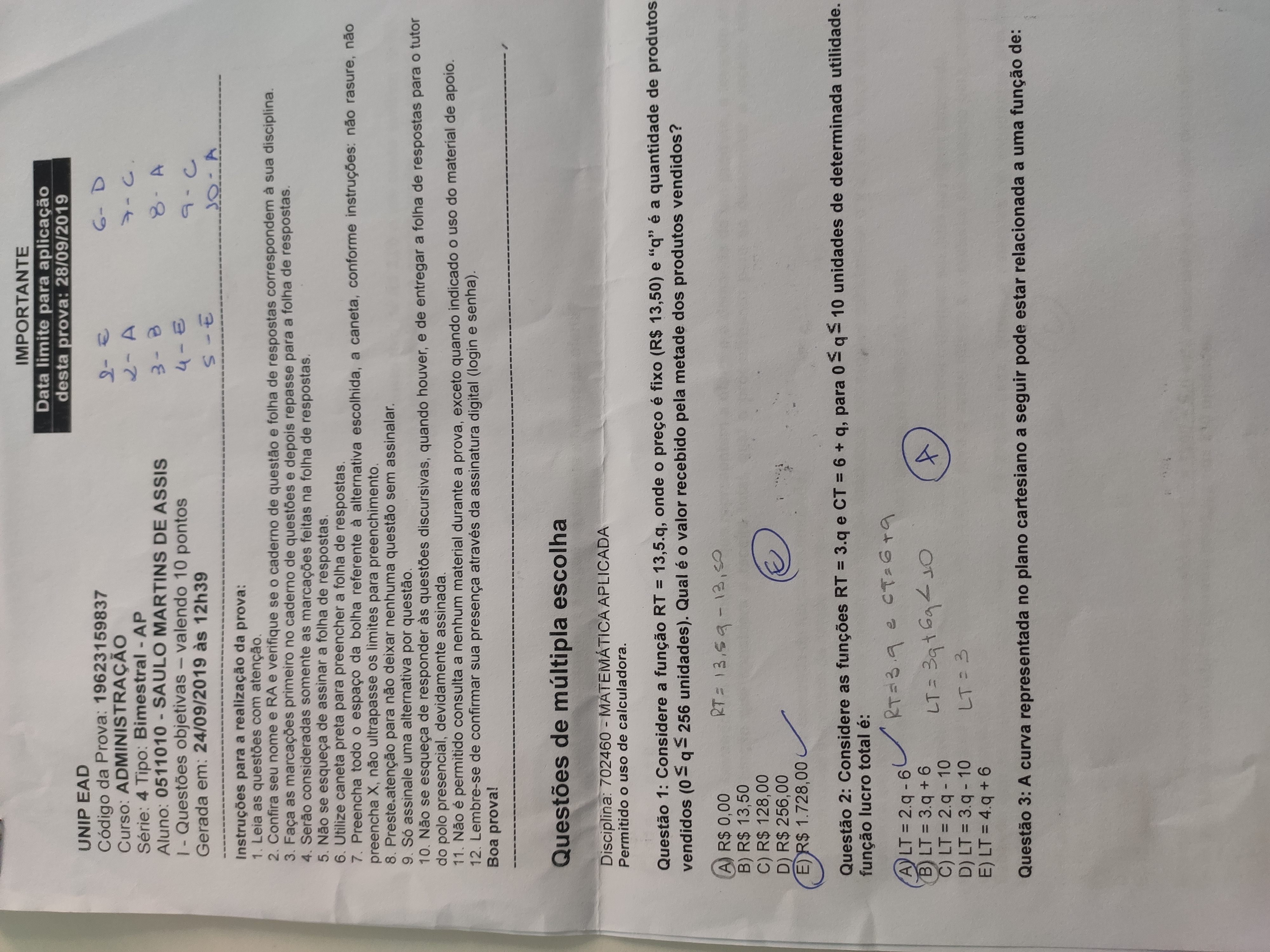 Considere as funcoes RT 3.q e CT 6 + q, para 10 unidades de determinada utilidade. funcao lucro total e: A) LT 2.q 6 B) LT 3.q + 6 LT C) LT - 10 D) LT 3.q - 10 LT E) LT 4.q + 6