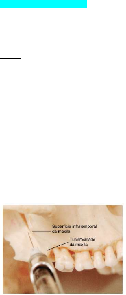 ELVIRA RACHEL QUINDERÉ Técnicas anestésicas - Quando usar anestésico tópico deixá-lo por 1-2 min - Usar gazes estéril e cotonete estéril para levar o anestésico tópico na boca - Bisel da agulha voltado para o osso - Ponto de apoio - Injeção sempre lenta TÉCNICA ANESTESICA EM MAXILA Injeção supraperiosteal: é comumente chamada de infiltração local, é a técnica de anestesia local usada com mais frequência para a obtenção da anestesia pulpar nos dentes superiores. É indicada sempre que os procedimentos odontológicos são confinados a uma área relativamente circunscrita, seja na região dos incisivos maxilares ou mandibulares. Técnica: - Agulha curta - Área de introdução: altura da prega mucovestibular acima do ápice do dente a ser anestesiado - Área alvo: região apical do dente a ser anestesiado - Pontos de referência: prega mucovestibular; coroa do dente; contorno da raiz do dente - 0,6mL de solução é o suficiente (1/3 do tubete) Bloqueio do n. alveolar superoposterior: bloqueio dos dentes 3MS, 2MS, 1MS (exceto a raiz mesiovestibular). Técnica: - Agulha curta - Área de introdução: altura da prega mucovestibular do 2MS - Área alvo: N. alveolar superoposterior Área alvo - Pontos de referência: prega mucovestibular, tuberosidade da maxila e processo zigomático da maxila. ELVIRA RACHEL QUINDERÉ - Boca do paciente parcialmente aberta - A agulha deve ser avançada lentamente para cima, para dentro e para trás – em um só movimento OBS: quando é usada uma agulha longa, ela será introduzida até a metade de seu comprimento no tecido. Caso seja usada uma agulha curta aproximadamente 4mm devem permanecer visíveis ➔ O uso de uma agulha curta reduz o risco de punção do plexo pterigoideo imagem ilustrando o bloqueio do n. asp com uma agulha curta Bloqueio do n. alveolar superior médio: o bloqueio desse nervo está indicado para procedimentos em pré-molares e para raiz mesiovestibular do 1MS Técnica: - Agulha curta - Área de introdução: altura da prega mucovestibular acima do 2PMS - Área alvo: osso maxilar acima do ápice do 2PMS - Ponto de referência: prega mucovestibular acima do 2PMS - é depositado 0,9 a 1,2 mL (de metade a 2/3 da solução – aproximadamente 30-40 seg) Bloqueio do n. infraorbitário: o bloqueio desse n. produz anestesia profunda da polpa e tecidos moles vestibulares, desde o incisivo central superior até pré-molares. - Necessita de menor volume de solução anestésica: 0,9-1,2mL ELVIRA RACHEL QUINDERÉ Nervos anestesiados: alveolar superoanterior, alveolar superior médio, nervo infraorbitário (palpebral inferior, nasal lateral e labial superior) imagem ilustrativa demonstrando áreas anestesiadas pelo bloqueio do n. infraorbitário Técnica: - Agulha longa - Área de inserção: altura da prega mucovestibular diretamente sobre o primeiro pré molar superior OBS: a agulha pode ser introduzida na prega mucovestibular de qualquer dente, desde o 2º pré molar anteriormente até o incisivo central (o 1PMS, geralmente, proporciona o menor trajeto até a área-alvo). - Área alvo: forame infraorbitário - Pontos de referência: prega mucovestibular, incisura infraorbitária, forame infraorbitário - Localizar o forame infraorbitário: • Palpar a incisura infraorbitário • Mover o dedo para baixo da incisura, aplicando pressão suave sobre os tecidos • O osso imediatamente abaixo da incisura é convexo, representando a borda inferior da órbita e o teto do forame infraorbitário • Continuando inferiormente, uma convexidade será palpada = forame infraorbitário - Profundidade da agulha em um adulto será de aproximadamente 16mm - Depositar lentamente 0,9-1,2mL de solução anestésica ELVIRA RACHEL QUINDERÉ Anestesia do palato Etapas de administração atraumática da anestesia de palato: - Produzir anestesia tópica adequada no local de penetração da agulha - Usar anestesia por pressão no local antes e durante a introdução da agulha e a deposição da solução A anestesia tópica adequada no local da injeção pode ser obtida, permitindo-se que o anestésico tópico permaneça em contato com os tecidos moles durante pelo menos 2 minutos. O palato é a única área da boca onde uma haste de algodão deve ser mantida na posição pelo administrador durante todo o tempo. A haste do algodão deve ser pressionada com firmeza suficiente para produzir a isquemia (palidez) dos tecidos normalmente róseos no local de penetração e uma sensação de pressão intensa Agulha curta é recomendada Bloqueio do n. palatino maior: o bloqueio do n. palatino maior é muito útil durante procedimentos odontológicos envolvendo os tecidos moles palatinos distais ao canino. Volumes ELVIRA RACHEL QUINDERÉ mínimos de solução – 0,45 – 0,6mL – produzem anestesia profunda dos tecidos moles e duros do palato Técnica: - Agulha curta - Área alvo: n. palatino maior - Área de introdução: tecidos moles levemente anteriores ao forame palatino maior - Pontos de referência: forame palatino maior, quando passa anteriormente entre tecidos moles e osso do palato duro - Paciente sempre em posição supina - Colocar uma haste de algodão na junção do processo alveolar maxilar com palato duto. - Começar na região do primeiro molar superior e palpar posteriormente pressionando firmemente os tecidos com a haste do algodão - A haste de algodão cairá na depressão formada pelo forame palatino maior ELVIRA RACHEL QUINDERÉ - O forame se localiza mais frequentemente num ponto distal ao segundo molar superior, mas pode se localizar anterior ou posteriormente a sua posição habitual - São 2 minutos de anestésico tópico – e observar a isquemia dos tecidos - A profundidade de penetração da agulha é de aproximadamente 5mm Bloqueio do n. nasopalatino: o bloqueio desse n. gera anestesia na porção anterior do palato duro bilateralmente, desde a face mesial do primeiro pré-molar esquerdo. Técnica: - Agulha curta - Área de 