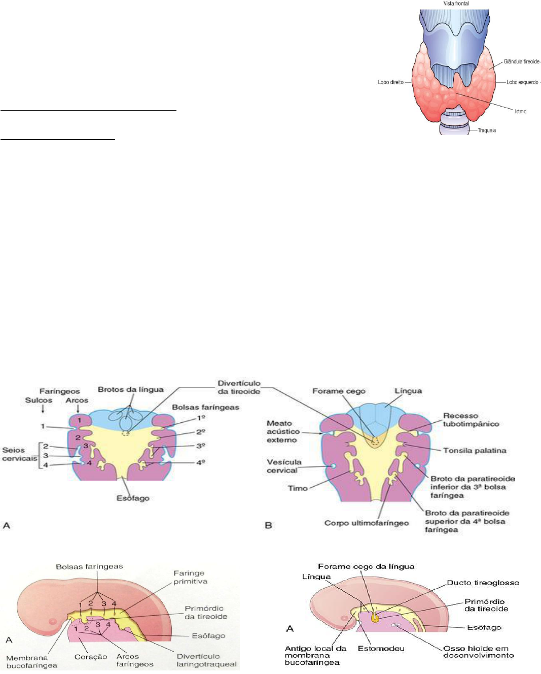 Embriologia Aula 2 – 12/08/2019 Tireoide, Paratireoide e Adrenal TIREOIDE Localizada na região cervical, anterior a laringe, próxima ao início da traqueia. Anatomicamente é constituída por 2 lobos (direito e esquerdo) unidos por um istmo. Histologia: Composta por: Folículos tireoideanos com coloide: sintetizam os hormônios tiroxina (T4) e triiodotironina (T3). Células parafoliculares: então entre os folículos e sintetizam calcitonina que é o hormônio responsável por regular os níveis de cálcio na corrente sanguínea. Desenvolvimento: Se desenvolve na região da faringe primitiva a partir do aparelho faríngeo (composto pelos arcos, bolsas, sucos e membranas faríngeas). Começa no 24° dia, é a primeira glândula a se desenvolver como um espessamento endodérmico no assoalho da faringe primitiva. Esse aglomerado de células é denominado divertículo da tireoide que fica na extremidade do forame cego (estrutura que faz parte da língua). Esse início de desenvolvimento da tireoide ocorre em íntima associação com o desenvolvimento da língua. O 4° par de bolsas faríngeas é responsável por formar o corpo ultimofaringeo. O divertículo da tireoide vai crescendo e se torna uma estrutura alongada. Com o crescimento do embrião e da língua, a tireoide desce pelo pescoço, mas permanece conectado a língua pelo ducto tireoglosso. Na 5° semana, o ducto tireoglosso se degenera. Com isso, a tireoide se divide em 2 lobos conectados por um istmo. Na 7° semana, a tireoide alcança sua posição definitiva. Histogênese: O divertículo da tireoide é oco. O divertículo deixa de ser oco formando uma massa compacta de células endodérmicas. Ocorre uma invasão do mesênquima vascular nessa massa de células. Com isso a massa compacta de células se transforma em uma rede de cordões epiteliais. Por volta da 10° semana os cordões começam a se dividir em grupos de células. Cada um desses grupos começa a apresentar uma luz. As células se organizam em uma camada única ao redor da célula. Na 11° semana, aparece coloide na luz, formando os folículos tireoidianos. A partir dos folículos os hormônios tireoidianos são sintetizados. Por volta da 20° semana, esses níveis hormonais aumentam. Por volta da 35° semana, esses níveis hormonais já se assemelham aos níveis adultos. O epitélio da porção ventral do 4° par de bolsas faríngeas da origem ao corpo ultimofaríngeo que se desprende da bolsa e se junta à tireoide, sendo englobado por ela e dando origem as células parafoliculares ou células C. PARATIREOIDE Localizadas na face posterior da tireoide. Fica disposta em 2 pares, um superior e um inferior. Histologia: É formada por: Células principais: secretam o paratormônio, que é responsável pelo controle de cálcio e fosfato sanguíneo. Oxífilas: sua função é desconhecida. Desenvolvimento: Derivada totalmente das bolsas faríngeas (3° e 4°). A partir da 3° forma-se o par inferior. A partir da 4° forma-se o par superior. Histogênese: O epitélio das porções dorsais da 3° e 4° bolsas faríngeas se proliferam formando pequenos nódulos na face dorsal de cada bolsa. Há invasão do mesênquima vascular nos nódulos, ocorrendo a diferenciação das células em células principais (período embrionário) e células oxífilas (5 a 7 anos após o nascimento). ADRENAL/SUPRARRENAIS São 2 glândulas com formato achatado, tem forma de meia lua e se situam no polo superior do rim. Sintetizam os mineralocorticoides, glicocorticoides, andrógenos e catecolaminas. Histologicamente: Dividida em: Córtex: -Zona glomerulosa. -Zona fasciculada. -Zona reticulada. Medula: no centro. Desenvolvimento: O córtex origina-se a partir do mesênquima. A medula origina-se a partir de um gânglio simpático formado por células que vieram da crista neural. As adrenais se formam na região onde as glândulas estão se formando. Na 6° semana forma-se um córtex embrionário formado a partir de mesênquima. Logo em seguida um aglomerado de células da crista neural é formado. Aos poucos o aglomerado células da crista é englobado pelo córtex. Ao mesmo tempo, o córtex permanente se desenvolve externamente. Isso segue até o nascimento. No nascimento temos medula, grande porção do córtex fetal e 2 zonas diferenciadas. A partir de 1 ano, o córtex fetal começa diminuir. Somente com 1 ano é que o córtex fetal está totalmente desaparecido e ficam 2 zonas de córtex permanente. No adulto temos as 3 zonas do córtex permanentemente. As glândulas suprarrenais do feto são de a 10 a 20 vezes maiores que as glândulas dos adultos porque elas produzem precursores esteroides usados pela placenta para a síntese de estrógeno.