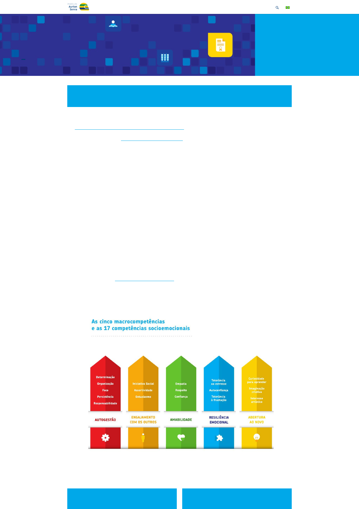 BNCC: construindo um currículo de educação integral Ao destacar o compromisso com o desenvolvimento pleno dos estudantes em suas diversas dimensões (intelectual, física, afetiva, social, ética, moral e simbólica), a BNCC retoma orientações presentes na Lei de Diretrizes e Bases (LDB) de 1996 e nas Diretrizes Curriculares Nacionais da Educação Básica (DCNs), apresentando uma visão de educação integral que propõe a superação da divisão e hierarquização entre o desenvolvimento intelectual e o desenvolvimento emocional. Sendo assim, cada uma das 10 competências gerais da BNCC integra aspectos cognitivos e socioemocionais, tais como: comunicação, criatividade, pensamento crítico e científico, empatia, comunicação e autoconhecimento. Para a promoção de um campo analítico e crítico a respeito do estudante que se quer formar, é fundamental conhecer mais profundamente os aspectos socioemocionais presentes nessas competências. Assim, vale a pergunta: o que são competências socioemocionais? Nos estudos sobre o tema realizados na área da Psicologia, competências socioemocionais são entendidas como influenciadoras do modo como uma pessoa pensa, sente, decide e age em determinada situação ou contexto. Hoje, sabe-se que elas não são fixas, ou seja, são flexíveis e maleáveis, manifestando-se com intensidade e modos diferentes de acordo com os elementos sociais e culturais que atravessam a história de cada pessoa, e sendo, assim, possíveis de serem desenvolvidas ao longo da vida. Modelo das cinco macrocompetências Existem diferentes modelos científicos que visam a organizar os estudos das competências socioemocionais. Os pesquisadores do Instituto Ayrton Senna adotam um que organiza a ampla variação de competências socioemocionais em cinco macrocompetências. São elas: abertura ao novo, autogestão, engajamento com os outros, amabilidade e resiliência emocional. Esse modelo foi escolhido porque organiza as competências socioemocionais de forma abrangente e, ao mesmo tempo, específica, a partir de estudos sobre competências socioemocionais identificadas e validadas cientificamente por meio de experiências práticas em diversos contextos, localidades e culturas. Além disso, há uma quantidade expressiva e significativa de evidências científicas no Brasil e no mundo que validam a importância desse modelo para diversos resultados alcançados ao longo da vida. No contexto brasileiro, as cinco macrocompetências foram desdobradas em 17 competências socioemocionais identificadas como importantes de serem consideradas e desenvolvidas nas escolas do país. São elas: determinação; foco; organização; persistência; responsabilidade; empatia; respeito; confiança tolerância ao estresse; autoconfiança; tolerância à frustração; iniciativa social; assertividade; entusiasmo; curiosidade para aprender; imaginação criativa e interesse artístico. Essas 17 competências socioemocionais não abarcam todas as existentes, mas compreendem os aspectos socioemocionais que estão explicitados nas 10 competências gerais da BNCC. Confira, na imagem abaixo, a relação entre as cinco macrocompetências e as 17 competências socioemocionais mencionadas. A seguir, leia as definições das cinco macrocompetências, as competências socioemocionais relacionadas a cada uma delas e o que dizem as evidências científicas sobre a importância de seu desenvolvimento no contexto escolar e na vida adulta. Desenvolvimento pleno Abertura ao novo Amabilidade QUEM SOMOS A CAUSA COMO ATUAMOS CONTEÚDOS APOIE https://institutoayrtonsenna.org.br/ https://institutoayrtonsenna.org.br/pt-br/quem-somos.html https://institutoayrtonsenna.org.br/pt-br/a-causa.html https://institutoayrtonsenna.org.br/pt-br/como-atuamos.html https://institutoayrtonsenna.org.br/pt-br/conteudos.html https://institutoayrtonsenna.org.br/pt-br/apoie.html https://institutoayrtonsenna.org.br/pt-br/BNCC/desenvolvimento.html# https://institutoayrtonsenna.org.br/pt-br/BNCC/desenvolvimento.html# http://institutoayrtonsenna.org.br/pt-br/BNCC.html Veja abaixo: Diz respeito à capacidade de uma pessoa ser flexível, apreciativa diante de situações desafiadoras, incertas e complexas. Tem relação com a disposição para novas experiências estéticas, culturais e intelectuais. O que as evidências dizem: estudos relacionam o desenvolvimento das competências socioemocionais curiosidade para aprender, imaginação criativa e interesse artístico com: menor número de faltas na escola, avanço na escolaridade, aceleração do desenvolvimento de habilidades cognitivas, aumento de notas escolares e aumento do desempenho acadêmico nos componentes curriculares de Língua Portuguesa, História, Geografia, Física e Biologia. O desenvolvimento dessas competências socioemoecionais também está relacionado à realização de metas na futura vida profissional dos estudantes. Autogestão Veja abaixo: Diz respeito à capacidade de ter foco, responsabilidade, precisão, organização e perseverança com relação a compromissos, tarefas e objetivos estabelecidos para a vida. Também está relacionada à capacidade de autorregulação. O que as evidências dizem: estudos relacionam o desenvolvimento das competências socioemocionais determinação, foco, organização, persistência e responsabilidade com: o avanço na escolaridade, o aumento de notas escolares e em avaliações externas, o aumento do nível de conhecimento e desempenho acadêmico em leitura, escrita e nos componentes curriculares de Matemática e Química. O desenvolvimento dessas competências socioemoecionais também está relacionado à realização de metas na futura vida profisisonal dos estudantes. Resiliência emocional Veja abaixo: Diz respeito à capacidade de aprender com situações adversas e lidar com sentimentos como raiva, ansiedade e medo. O que as evidências dizem: estudos relacionam o desenvolvimento das competências socioemocionais 