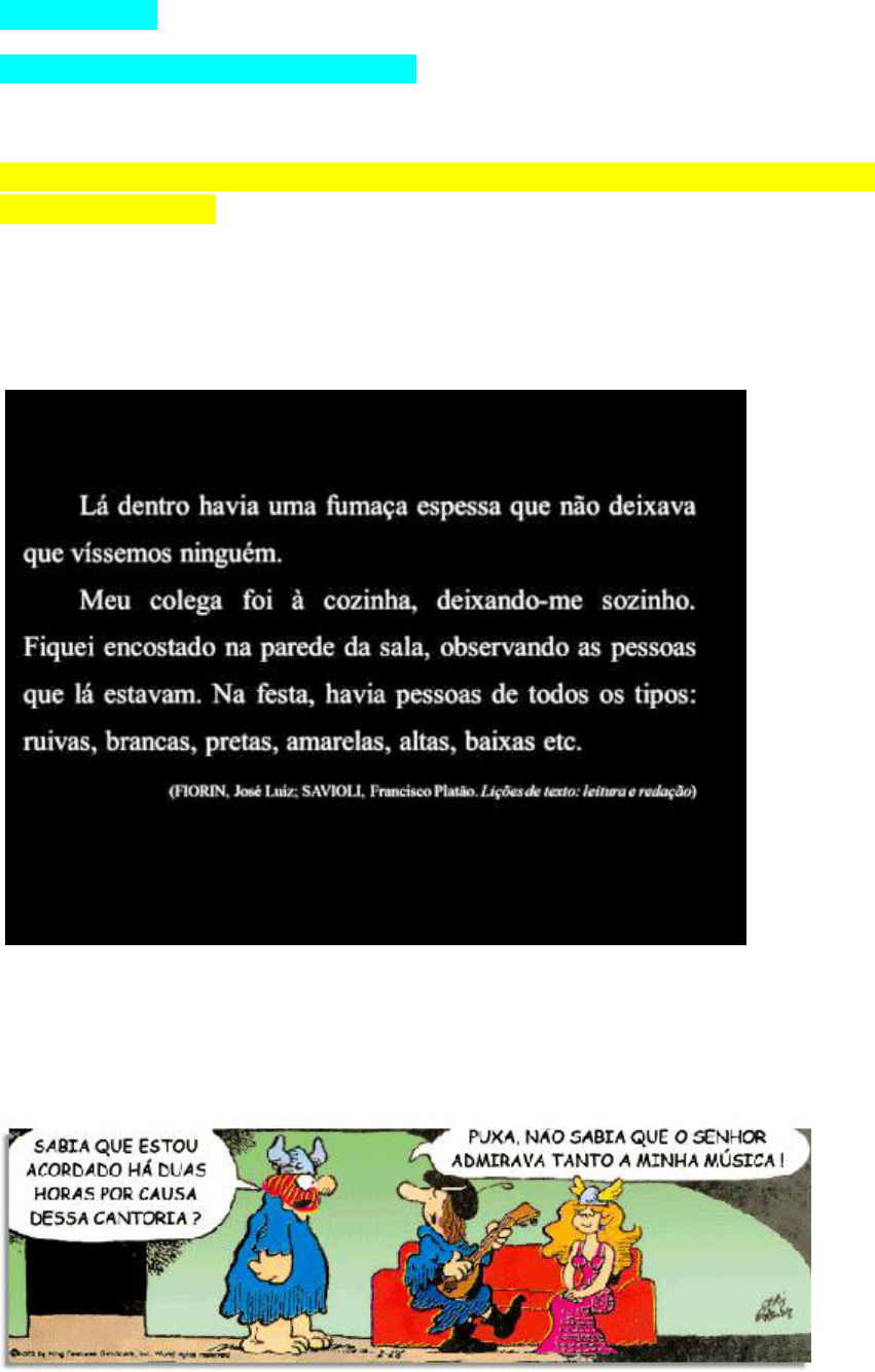 At 3 LA 2018-2 Atividade 3 a ser postada no portfólio 3 . Obrigatoriamente antes de elaborar suas atividades leia critérios avaliativos para elaborar textos I e II. 1-Leia atentamente os textos que seguem e explique a incoerência presente em cada um deles l: a- R: A incoerência está no fato de que o sujeito diz que na festa há pessoas ruivas, brancas, pretas , amarelas, etc, porém num primeiro momento ele fala que não enxergavam ninguém devido a fumaça. Como é possível, não ver ninguém e mesmo assim falar características físicas das mesmas, bem incoerente mesmo. b- R: Quando o primeiro personagem indaga que está acordado a duas horas pela cantoria, reparamos que sua expressão facial não é positiva, porém o tocador acha que ele esta acordado por que achava a musica boa, a incoerência é essa, pois houve um duplo sentido para acordado que na verdade pela expressão queria dizer incomodado. c- R: A incoerência ocorre na fala e na imagem, que gera um duplo sentido também, pela imagem já se sabe que é pra ser, a corda( um objeto) mas pela fala Zé Lelé entende que é acorda (do verbo acordar) . d- R: A incoerência esta no fato de que colocam não acreditamos em propagandas mas isso esta em um outdoor que é um objeto usado para esses fins, a propagandas. 2- Pesquise sobre Coesão e Coerência textual e responda: a- O que são cada uma delas. b- Qual a importância do pedagogo saber sobre esses conceitos da Linguística Textual? Coesão é os termos da gramática que usamos dentro de um texto, os elos coesivos (e, mas, porém, etc), são pequenas palavras da gramática que fazer parte do texto e dão uma sequenciação textual. Coerência não tem haver com gramática , ela tem haver com o sentido, aquele momento em que o texto é lido e compreendido,com uma sequência lógica. É de suma importância o pedagogo dominar esses dois conceitos (coerência e coesão), tanto para pode se comunicar de forma clara, compreensível, a ser entendido pelo aluno, assim como para ensinar os mesmos a usa-las de forma correta em seus variados contextos, não basta dominar a língua, tem que saber usa-la adequadamente em suas diversas situações afim do entendimento. Referência: http://plataformaead.unigran.br/app/videos acessado em 17 setembro 2018. 3- Explique o que compreendeu da citação que segue: OBJETIVOS DE UMA PEDAGOGIA LINGUÍSTICA O objetivo geral de uma Pedagogia Linguística consiste em desenvolver na escola condições que criem no aluno, no professor e na administração da escola a liberdade para o uso expressivo e funcional do seu idioma, de forma a assumir sua cultura linguística onde quer que esteja, sem embaraços de ordem ideológica, como forma de instituir o pleno domínio da própria cidadania. Nesses termos, o Projeto se define ao objetivar pôr em prática um saber desenvolvido pela Linguística, que contrapõe a discriminação de usos linguísticos não padrão própria da Gramática Ideológica (ou Tradicional) à liberdade que devem ter os falantes de dispor de sua própria língua em consonância com sua identidade e herança Linguísticas. Somos um país de muitas culturas espalhadas e diversificadas pelos quatro cantos do país, então desde que a criança nasce ela é inserida em seu primeiro grupo social, a família, sendo assim no seu crescimento ela vai adquirindo sua identidade através das primeiras interações sociais com seu familiares isso vai até que ela entre na educação infantil que é onde ela vai ter que socializar com seu segundo grupo social, vivenciando assim a diversidade. Para o professor isso é mais complexo, pois é o dever dele, auxiliar na formação gramatical e de ensino aprendizagem dos seu alunos mas, sem deixar de dar espaço e respeitando suas formas de comunicação que eles enraizaram no seu seio familiar. Visando usar a linguística para o enriquecimento de conhecimento do aluno, para que eles saibam usar de forma coerente, a fala e a escrita. A liberdade de expressão é um direito de qualquer cidadão, e isso deve ser ensinado desde aos mais pequenos até os jovens, e isso se dá principalmente pela escola já que ela vai estar presente desde a infância até a maturidade. Não faça parágrafos com menos de 4linhas!Use times 12 , cor preta e nunca apenas 1 parágrafo. Lembre-se de não usar a primeira pessoa do singular e leia os critérios avaliativos!! Número máximo de linhas: 12
