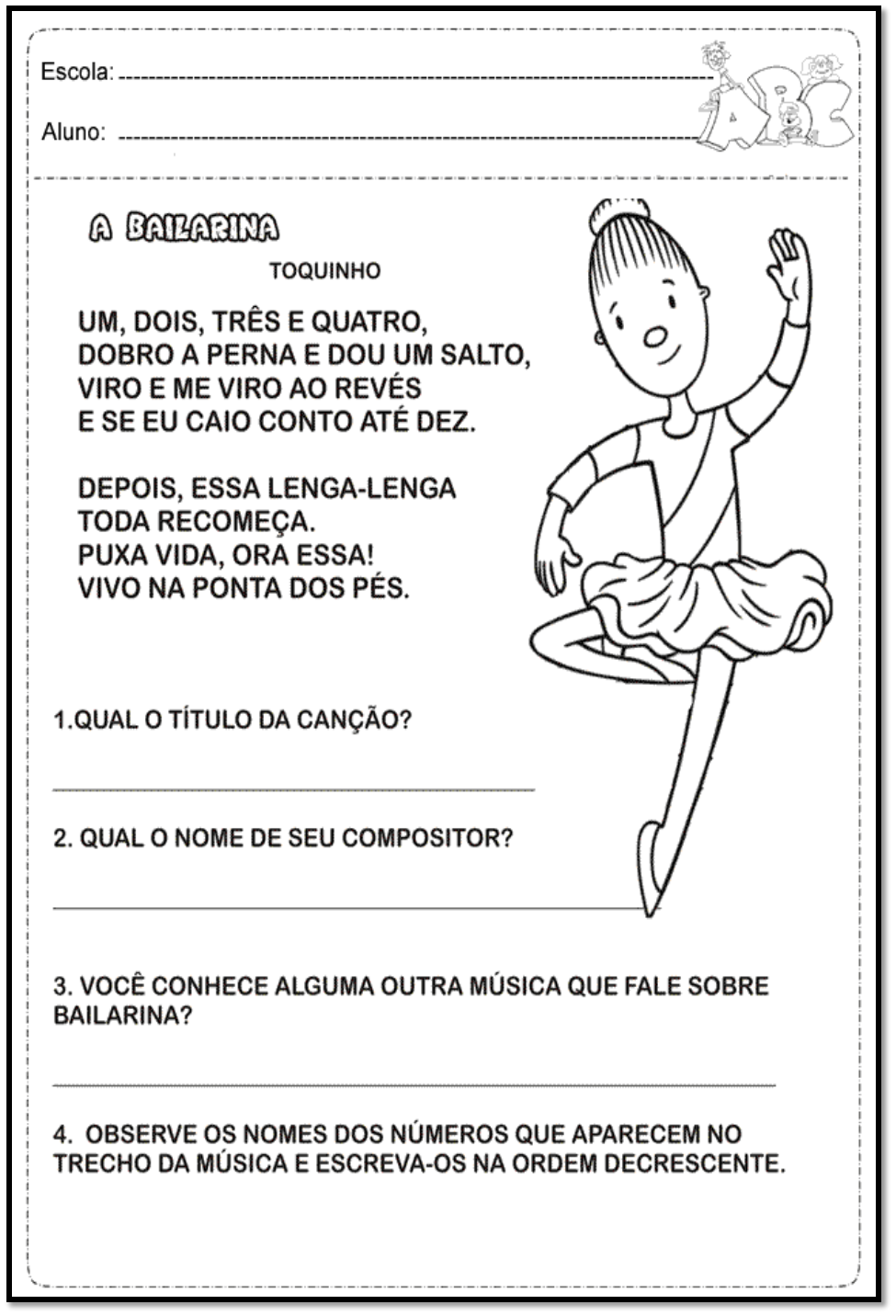 MÚSICA NOME__________________________________TURMA_____DATA____/____/________ MÚSICA MÚSICA MÚSICA 2 1- COMPLETE A MÚSICA: CARANGUEIRO NÃO É ______________ / ____________________ PEIXE É. CARANGUEIJO SÓ É PEIXE NA_________________DA_________________. PALMA,_____________, PALMA, PÉ, PÉ,PÉ______________________RODA, RODA, _________________________PEIXE É.