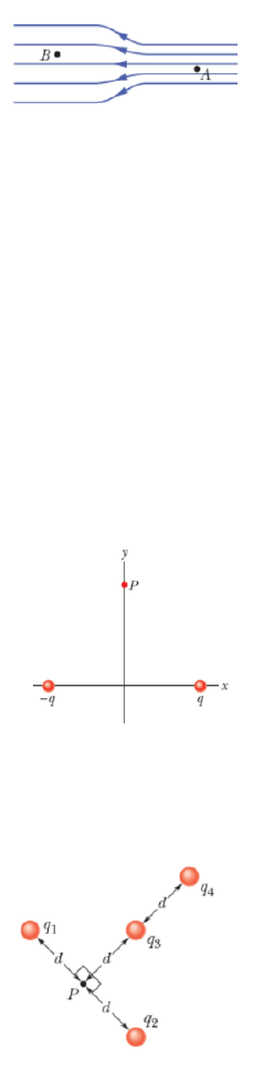 UNIVERSIDADE FEDERAL FRONTEIRA SUL - CAMPUS DE REALEZA CURSO DE LICENCIATURA EM QUÍMICA CCR FÍSICA III LISTA II 1) Na figura abaixo, as linhas de campo elétrico do lado esquerdo têm uma separação duas vezes maior que as linhas do lado direito. (a) Se o módulo do campo elétrico no ponto A é 40 N/C, qual é o módulo da força a que é submetido um próton no ponto A? (b) Qual é o módulo do campo elétrico no ponto B? 2) Duas cargas, cada uma de +4 µC, são posicionadas sobre o eixo x, uma na origem e outra em x = 8 m. Determine o campo elétrico no eixo x em: (a) x = −2 m; (b) x = 2 m; (c) x = 6 m; (d) x = 10 m; (e) Em que ponto do eixo x o campo elétrico é nulo? (f) Esquematize a função Ex versus x. 3) Duas cargas positivas com intensidades q1 = q2 = 6,0 nC são posicionadas sobre o eixo y em y1 = +3 cm e y2 = −3 cm. Quais são a intensidade e a orientação do campo elétrico no eixo x em x = 4 cm? (b) Qual é a força exercida sobre uma terceira carga q0 = 2 nC quando é colocada sobre o eixo x em x = 4 cm? 4) Uma carga puntiforme de 5,0 µC está localizada em x =−3 cm, e uma segunda carga puntiforme de −8,0µC está localizada em x = 4 cm. Qual deve ser a localização de uma terceira carga de 6 µC de modo que o campo elétrico seja nulo em x = 0? 5) A figura abaixo mostra duas part́ıculas carregadas mantidas fixas no eixo x: −q = −3, 20 × 10−19C, no ponto x= −3,0m e q = 3, 20× 10−19C, no ponto x = +3,0 m. Determine (a) o módulo e (b) a orientação (em relação ao semieixo x positivo) do campo elétrico no ponto P, para o qual y = 4,00 m. 6) Na figura abaixo, as quatro part́ıculas são mantidas fixas e têm cargas q1 = q2 = +5e, q3 = +3e e q4 = –12 e. A distância d = 5,0 µm. Qual é o módulo do campo elétrico no ponto P? 7) Feixes de prótons de alta energia podem ser produzidos por “canhões” que usam campos elétricos para acelerar os prótons. (a) Qual é a aceleração experimentada por um próton em um campo elétrico de 2,0×104 N/C? (b) Qual é a velocidade adquirida pelo próton depois de percorrer uma distância de 1,0 cm na presença desse campo? 8) Em determinado instante, as componentes da velocidade de um elétron que se move entre duas placas paralelas carregadas são vx = 1,5×105 m/s e vy = 3,0×103 m/s. O campo elétrico entre as placas é E⃗ = (120 1 N/C) ĵ. Determine, na notação dos vetores unitários, (a) a aceleração do elétron e (b) a velocidade do elétron no instante em que sua coordenada x variou de 2,0 cm. 9) Duas cargas puntiformes, q1 = 2,0 pC e q2 = −2,0 pC, são separadas por 4,0 µm. (a) Qual é o momento de dipolo desse par de cargas? (b) Esquematize o par de cargas e mostre a orientação do momento de dipolo. 10) Um dipolo com momento de 0,5e·nm é colocado em um campo elétrico uniforme com intensidade de 4,0×104N/C. Qual é a intensidade do torque resultante no dipolo quando (a) o dipolo estiver paralelo ao campo elétrico; (b) o dipolo for perpendicular ao campo elétrico e (c) o dipolo fizer um ângulo de 30o com o campo elétrico? (d) Deternine a energia potencial do campo elétrico em cada um dos casos. 2