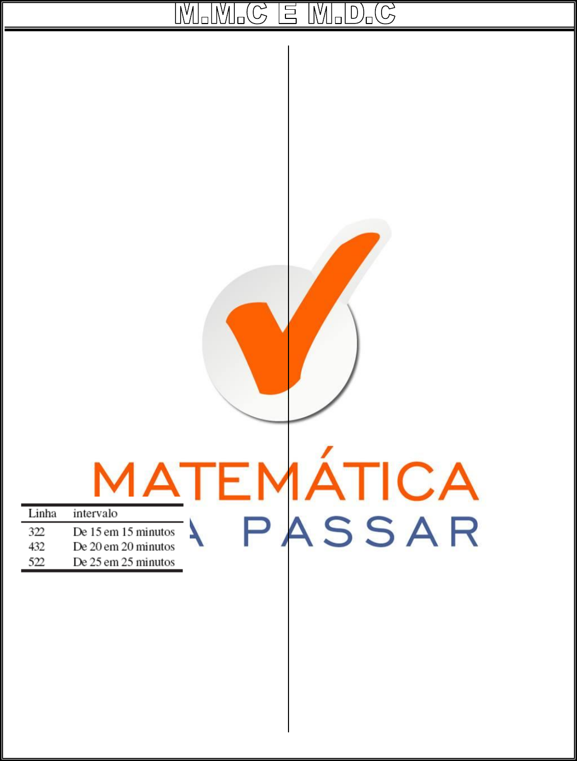 Renato Oliveira e Marcos Antônio www.matematicaprapassar.com.br 1) (FCC) Sistematicamente, dois amigos almoçam no restaurante Lírio do Campo: Ferdinando, a cada 12 dias e Cacilda, a cada 10 dias, inclusive aos sábados, domingos e feriados. Se em 23/06/2006 ambos estiveram almoçando em tal restaurante, então uma outra coincidência de datas em que os dois lá estiveram para almoçar ocorreu em (A) 22/08/2006 (B) 23/08/2006 (C) 21/09/2006 (D) 22/09/2006 (E) 23/09/2006 2) Três ciclistas partem de um mesmo ponto e no mesmo sentido, numa pista fechada. O primeiro dá uma volta à pista em 20 minutos; o segundo, em 24 minutos; e o terceiro, em 30 minutos. Após a largada, qual o número mínimo de minutos para que eles voltem a se encontrar no ponto de partida? A) 115 minutos B) 140 minutos C) 120 minutos D) 130 minutos E) 135 minutos 3) Um mecânico faz revisão nos freios dos veículos dos três diretores de uma empresa, um a cada 10 dias, outro a cada 12 dias e o terceiro a cada 15 dias, inclusive aos sábados, domingos e feriados. Se hoje ele fizer a revisão nos três veículos, daqui a quantos dias será a próxima vez em que fará a revisão dos três em um mesmo dia? (A) 37 (B) 40 (C) 45 (D) 48 (E))60 4) Maria e Ana se encontram de três em três dias, Maria e Joana se encontram de cinco em cinco dias e Maria e Carla se encontram de dez em dez dias. Hoje as quatro amigas se encontraram. A próxima vez que todas irão se encontrar novamente será daqui a: (A) 15 dias (B) 18 dias (C) 28 dias (D) 30 dias (E) 50 dias 5) O policiamento em torno de um estádio se faz com dois policiais montados a cavalo. Um deles percorre o contorno do estádio em 30 min e o outro em 40 min. Depois que começaram a ronda, partindo do mesmo ponto às 8h, e deslocando-se no mesmo sentido, voltarão a se encontrar, pela segunda vez, às: A) 10 h. B) 11 h. C) 12 h. D) 13 h. 6) Numa casa existe um único computador, que é usado por Bianca e Débora. Bianca usa o computador de três em três dias, enquanto Débora usa de quatro em quatro. Se no dia 5 de dezembro as duas usaram o computador, isso voltou a acontecer nos seguintes dias do mesmo mês: A) 11 e 23 B) 11 e 29 C) 17 e 29 D) 17 e 23 7) (NCE – UFRJ) Em um ponto de ônibus, passam três linhas de ônibus (322, 432, 522), em intervalos regulares de tempo, conforme descrito na tabela abaixo: Sabendo que eles acabaram de passar juntos neste ponto, a próxima vez que eles passarão juntos novamente no ponto será daqui a: (A) 60 minutos; (B) 200 minutos; (C) 300 minutos; (D) 7500 minutos; (E) 9500 minutos. 8) (FCC) Suponha que, sistematicamente, três grandes instituições − X , Y e Z − realizam concursos para preenchimento de vagas: X de 1,5 em 1,5 anos, Y de 2 em 2 anos e Z de 3 em 3 anos. Considerando que em janeiro de 2006 as três realizaram concursos, é correto concluir que uma nova coincidência ocorrerá em (A) julho de 2015. (B) junho de 2014. (C) julho de 2013. (D) janeiro de 2012. (E) fevereiro de 2011. 9) (FCC) Sistematicamente, dois técnicos em segurança cumprem plantões na empresa onde trabalham: um, a cada 6 dias, e o outro, a cada 9 dias. Se em 20 de outubro de 2003 ambos estiveram de plantão, em qual das datas seguintes houve nova coincidência de seus plantões? (A) 06/11/2003 (B) 10/11/2003 (C) 19/11/2003 (D) 21/11/2003 (E)) 25/11/2003 10) Três amigos André, Andrey e Adriano abastecem seus carros sempre no mesmo posto de combustíveis. André abastece a cada 8 dias, Andrey abastece a cada 9 dias e Adriano abastece a cada 12 dias. Se no dia 23 de abril de 2013 os três abastecerem seus carros, então voltarão a abastecer no mesmo dia de novo pela primeira vez no dia: (A) 29 de maio; (B) 12 de junho; (C) 15 de maio; (D) 30 de abril; (E) 01 de junho. 11) (FUNRIO) Num saco de bolinhas de gude, Fernando notou que elas poderiam ser divididas em grupos de 2, ou em grupos de 3, ou em grupos de 4, ou, ainda, em grupos de 5, sem que houvesse sobras em nenhum desses tipos de divisão. Esse saco pode conter um número de bolinhas igual a A) 120 B) 132 C) 144 D) 150 E) 160 12) (FCC) No almoxarifado de certa empresa havia dois tipos de canetas esferográficas: 224 com tinta azul e 160 com tinta vermelha. Um funcionário foi incumbido de empacotar todas essas canetas de modo que cada pacote contenha apenas canetas com tinta de uma mesma cor. Se todos os pacotes devem conter igual número de canetas, a menor quantidade de pacotes que ele poderá obter é (A) 8 (B) 10 (C))12 (D) 14 (E) 16 13) (FCC) Todos os funcionários de um Tribunal devem assistir a uma palestra sobre "Qualidade de vida no trabalho", que será apresentada várias vezes, cada vez para um grupo distinto. Um técnico foi incumbido de formar os grupos, obedecendo aos seguintes critérios: − todos os grupos devem ter igual número de funcionários; − em cada grupo, as pessoas devem ser do mesmo sexo; − o total de grupos deve ser o menor possível. Se o total de funcionários é composto de 225 homens e 125 mulheres, o número de palestras que deve ser programado é (A) 10 (B) 12 (C))14 (D) 18 (E) 25 14) (FCC) Suponha que 60 funcionários do Banco do Brasil − 60% dos quais lotados em certa Agência de Florianópolis e, os demais, em determinada Agência de Chapecó − serão divididos em grupos, a fim de participar de um curso sobre Desenvolvimento Pessoal. Considerando que todos os grupos deverão conter a mesma quantidade de funcionários e que todos os funcionários de cada grupo deverão pertencer à mesma Agência, então a menor quantidade de grupos que poderão ser formados é um número (A) menor que 4. (B) primo. (C) divisível por 3. (D) par. (E) maior que 8. 15) (FCC) Dispõe-se de dois lotes de boletins informativos distintos: um, com 336 unidades, e outro, com 432 unidades. Um técnico judiciário foi incumbido de empacotar todos os boletins dos lotes, obedecendo as seguintes instruções: − todos os pacotes devem conter a mesma quantidade de boletin