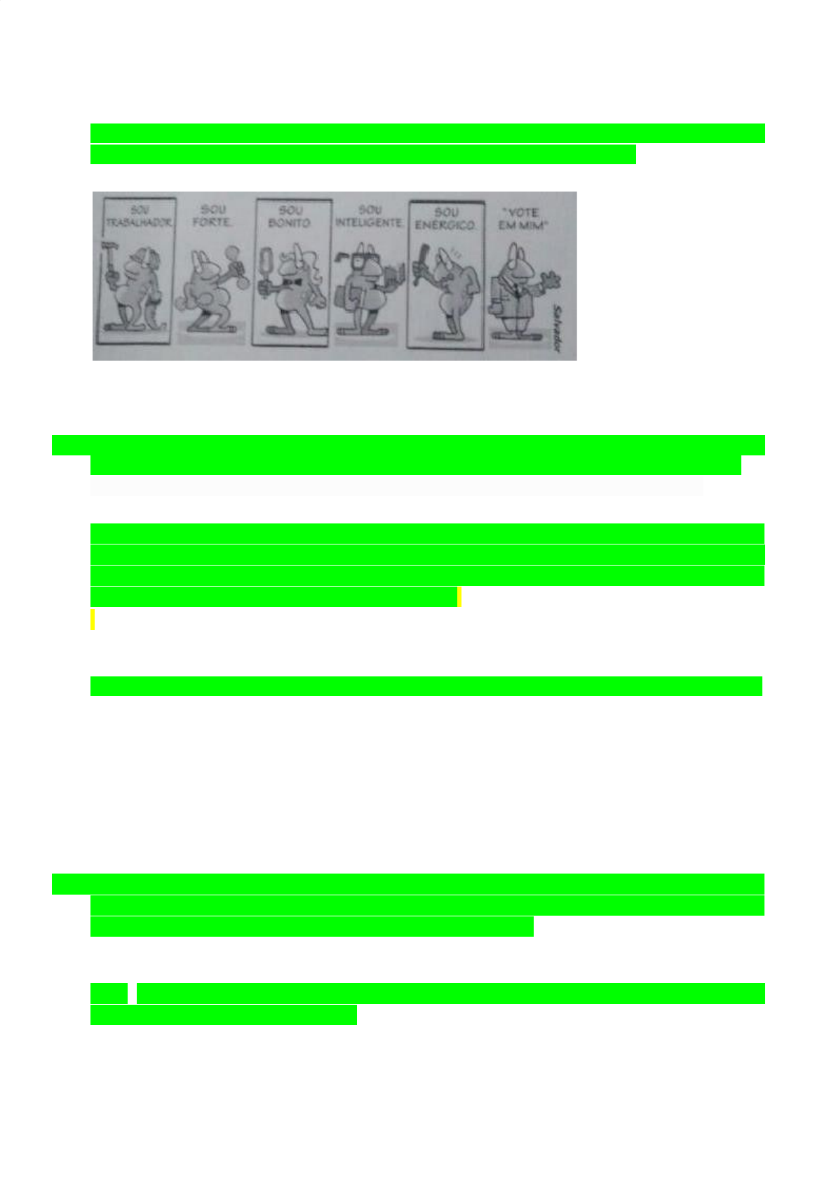Interpretação e Produção de Textos **1– A tira abaixo é do famoso Ran, personagem que aparece em situações engraçadas e muitas vezes críticas. Após a leitura, concluímos que: D) Ran é um candidato e usa as descrições de si mesmo como argumento para adesão de votos. *2– Leia o trecho poético de Analfabeto politico, de Berthold Brecht: “O analfabeto politico É tão burro que se orgulha e estufa o peito dizendo que odeia a politica. A função do “que” é: D) Substituir o termo burro no segundo verso e ligar duas orações no ultimo verso **#3-O enunciado seguinte constitui-se de duas frases sem conectivo: “O discurso político está inserido numa dinâmica social. O discurso político constantemente se ajusta a novas circunstâncias.” Indique a reconstrução com conector que dá sentido de causa-efeito ao enunciado original. A) O discurso político está inserido numa dinâmica social, por isso constantemente se ajusta a novas circunstâncias. 4– Em uma das charges de Maitena, temos o seguinte diálogo entre duas mulheres: - Mas não seja ridícula! Como você sabe que não vai voltar a vê-lo nunca mais? O que ele te disse? “Vou virar padre?” “Vou para a China?” “Vou me casar?” - Não, muito pior... “Te ligo”. O leitor da charge consegue entender o texto, porque: B) A coerência acontece quando “Te ligo”, dentro das relações amorosas, é interpretado como indício de desinteresse. *5 – O texto tem coerência a partir da coesão, que, por sua vez, estabelece um contexto. Desse modo, no trecho: “O homem comeu a toda comida por oferecida eles, pois a bicicleta estava sem as rodas.” NÃO é um texto porque: A) Não há elementos de coerência. **6 - Leia a letra da música “Enquanto o seu lobo não vem”, de Caetano Veloso, e assinale a alternativa INCORRETA: Vamos passear na floresta escondida, meu amor Vamos passear na avenida Vamos passear nas veredas, no alto meu amor Há uma cordilheira sob o asfalto (Os clarins da banda militar…) A Estação Primeira da Mangueira passa em ruas largas (Os clarins da banda militar…) Passa por debaixo da Avenida Presidente Vargas (Os clarins da banda militar…) Presidente Vargas, Presidente Vargas, Presidente Vargas (Os clarins da banda militar…) Vamos passear nos Estados Unidos do Brasil Vamos passear escondidos Vamos desfilar pela rua onde Mangueira passou Vamos por debaixo das ruas (Os clarins da banda militar…) Debaixo das bombas, das bandeiras (Os clarins da banda militar…) Debaixo das botas (Os clarins da banda militar…) Debaixo das rosas, dos jardins (Os clarins da banda militar…) Debaixo da lama (Os clarins da banda militar…) Debaixo da cama E) Segundo o critério conhecimento de mundo e conhecimento partilhado, apenas os leitos que viveram/vivenciaram o regime militar brasileiro podem dar sentido à letra de Caetano Veloso 7 – Ao digitar a expressão “daí então” no Google, é verificado que: D) A expressão será encontrada em textos escritos próximo da oralidade. *8-.Vários fatores determinam a variedade linguística. Podemos reconhecer alguns deles como: B) Diferença regional, nível social e diferença individual. #**9-Complete a oração com os elementos coesivos adequados, respectivamente. “O sonho é um elemento essencial para a vida (1) pois é ele que nos projeta para além dos limites estreitos darealidade. (2) Ainda que _não possamos viver apenas de sonhos, (3) certamente são eles que nos alimentam o espírito (4) e nos dão força para enfrentarmos as adversidades.” C) (1) pois; (2) Ainda que; (3) certamente; (4) e. *10– Leia a lista de palavras abaixo e as afirmativas sobre ela: “feijão Pão de forma Sabonete Dove Absorvente Sabão em pó...” I – A lista acima pode ser considerada texto, pois adquire sentido ao ser vista como uma lista de compra de mercado. II – A lista acima tem coerência, constituindo, portanto, um texto. Assinale a alternativa que contém as afirmativas corretas. B) Apenas I e III estão corretas. ****1 – Aponte a oração que utiliza elementos catafóricos. B) Não temos mais paciência. Eu e seu pai vamos coloca-lo de castigo! ****2-Dadas as frases, assinale a alternativa que indica corretamente o uso dos “porquês”. I - Paulo não foi ao teatro porque não havia mais ingresso. II – É um drama por que muitos estão passando. A) (I) porque; (II) por que. ****3- “A leitura é um processo que se movimenta entre o que se reconhece no texto e o que se expropria dele, revelando estratégias dinâmicas de produção de sentido que possibilitam as várias condições de interação entre o sujeito e linguagem” (artigo .maria jesus ornelas valle.pdf) Assim diante de um um título, que estratégia de leitura é provocada? B) O leitor levanta hipótese sobre o assunto do texto ***4 - Na sentença “Quando chegou na casa a Rui viu um carro estacionado em frente a sua casa. Ficou intrigado, pois o veículo não era familiar. O elemento coesivo usado foi: A) Hiperônimo ***5 - Definimos linguagem como: C) Um sistema de sinais convencionais elaborado por práticas sociais de uma determinada cultura. ***6 -O banco do Brasil, por exemplo, distribui p/ seus clientes um folder sobre aplicação p/ a família toda. Levando em conta q folder é um texto e, portanto, é mais uma ferramenta p/ a comunicação, podemos considerar que: A) possui um leitor especifico, ou seja, não é para qualquer pessoa que adentre o banco. ***7 -- Estão relacionadas a uma boa qualidade de texto. C) Coerência, coesão, clareza, e correção gramatical ***8– Veja o texto a seguir, retirado da pesquisa “Tendências atuais das políticas de recursos humanos: um estudo de caso numa empresa têxtil da Paraíba”. Em que consiste o texto? Gráfico: Nível Médio de Concordância da Política de Treinamento e Desenvolvimento E) O texto é unicamente não verbal, uma vez que o gráfico não precisa de esclarecimentos por meio da lí