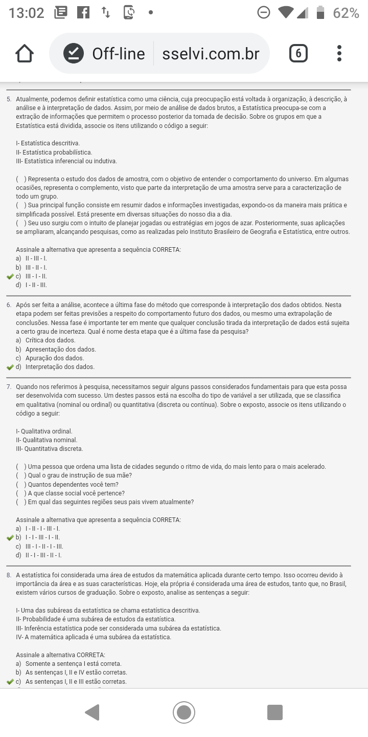 A estatistica foi considerada uma area de estudos da matematica aplicada durante certo tempo. Isso ocorreu devido a importancia da area e as suas caracteristicas. Hoje, ela propria e considerada uma area de estudos, tanto que, no Brasil, existem varios cursos de graduacao. Assinale a alternativa CORRETA: Uma das subareas da estatistica se chama estatistica descritiva. II- Probabilidade e uma subarea de estudos da estatistica. Inferencia estatistica pode ser considerada uma subarea da estatistica. IV- A matematica aplicada e uma subarea da estatistica. a) Somente a sentenca I esta correta. b) As sentencas I, II e IV estao corretas. c) As sentencas II e III estao corretas.