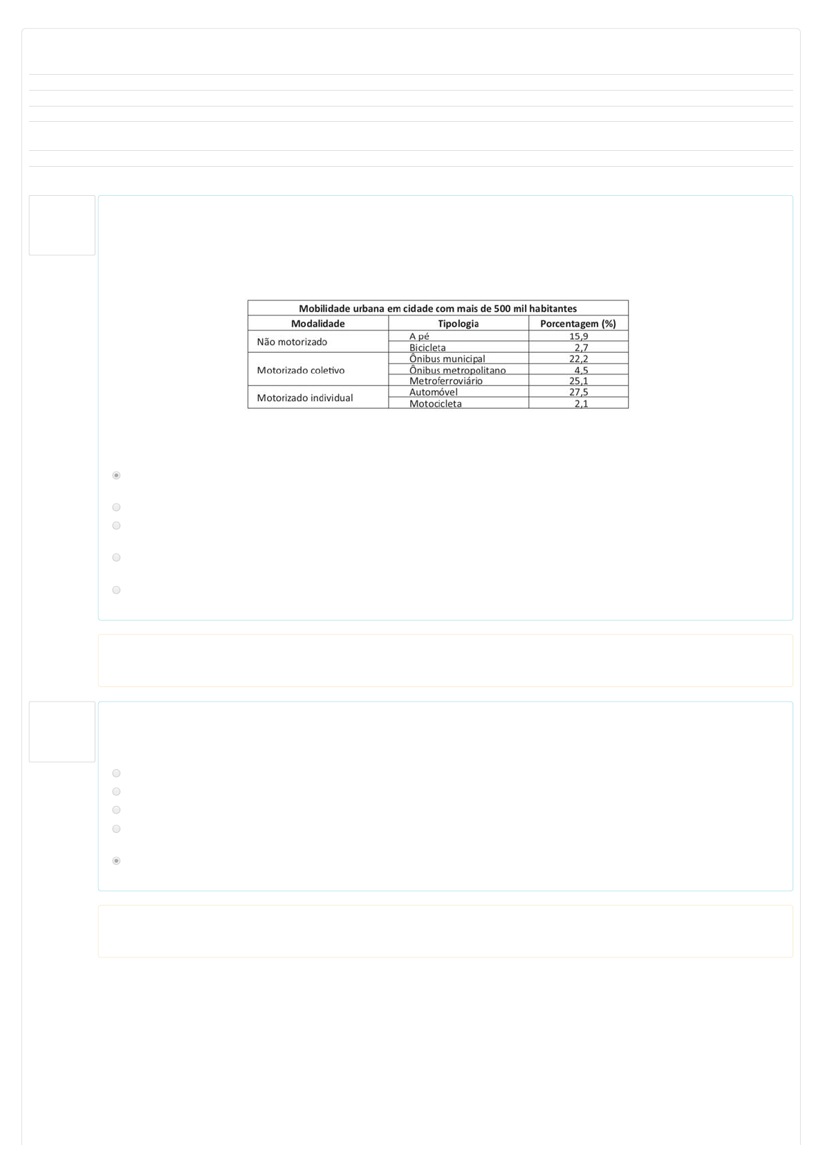 / Questão 1 Correto Atingiu 1,00 de 1,00 Questão 2 Correto Atingiu 1,00 de 1,00 Iniciado em Saturday, 19 Oct 2019, 17:56 Estado Finalizada Concluída em Saturday, 19 Oct 2019, 21:55 Tempo empregado 3 horas 59 minutos Notas 32,00/40,00 Avaliar 8,00 de um máximo de 10,00(80%) Os desafios da mobilidade urbana associam-se à necessidade de desenvolvimento urbano sustentável. A ONU define esse desenvolvimento como aquele que assegura qualidade de vida, incluídos os componentes ecológicos, culturais, políticos, institucionais, sociais e econômicos que não comprometam a qualidade de vida das futuras gerações. O espaço urbano brasileiro é marcado por inúmeros problemas cotidianos e por várias contradições. Uma das grandes questões em debate diz respeito à mobilidade urbana, uma vez que o momento é de motorização dos deslocamentos da população, por meio de transporte coletivo e individual. Considere os dados do segundo quadro: Considerando o texto e o quadro de mobilidade urbana apresentados, assinale a alternativa correta: Escolha uma: a. O percentual de pessoas que utilizam o transporte motorizado coletivo é maior ao de pessoas que utilizam o transporte motorizado individual nas cidades com mais de 500 mil habitantes. b. O transporte motorizado coletivo atende a 41,8% da população brasileira em cidades com mais de 500 mil habitantes. c. O percentual de pessoas que utilizam automóveis para se deslocar nas cidades com mais de 500 mil habitantes é menor ao de pessoas que utilizam o transporte metroferroviário. d. O percentual de pessoas que utilizam o transporte não motorizado corresponde a 17,6% da população das cidades com mais de 500 mil habitantes. e. Observa-se que o total de pessoas que utilizam o transporte não motorizado supera o de pessoas que utilizam o transporte motorizado individual. Sua resposta está correta. A resposta correta é: O percentual de pessoas que utilizam o transporte motorizado coletivo é maior ao de pessoas que utilizam o transporte motorizado individual nas cidades com mais de 500 mil habitantes.. Aranha (2006) lembra que se a filosofia é uma reflexão radical, rigorosa e de conjunto o exercício se dá a partir dos problemas propostos pelo nosso existir e é inevitável que entre esses problemas estejam os que se referem à educação. Notamos que o processo do ensinar e do aprender se torna como algo necessário e comum na sociedade. Sendo assim, podemos pensar que: Escolha uma: a. É necessário ensinar para que as crianças aprendam qual é o sentido da vida e saibam obedecer sem questionar. b. A sociedade necessita de ensino de qualidade para o mundo do trabalho sem intervenções filosóficas. c. As disciplinas do ensino fundamental I são autônomas e contribuem para o pensar interdisciplinar. d. A sociedade necessita de homens trabalhando para o crescimento econômico e o progresso e não de pessoas questionando sobre a realidade em que vive. e. A educação e a pedagogia estão no mesmo espaço e o profissional da educação contribui no processo do pensar e do agir para a valorização das diversas áreas do saber. Sua resposta está correta. A resposta correta é: A educação e a pedagogia estão no mesmo espaço e o profissional da educação contribui no processo do pensar e do agir para a valorização das diversas áreas do saber.. Construindo Resultados - Pedagogia - EAD / Questão 3 Correto Atingiu 1,00 de 1,00 Questão 4 Correto Atingiu 1,00 de 1,00 Questão 5 Correto Atingiu 1,00 de 1,00 É correto afirmar que os parâmetros de mãos da Língua Brasileira de Sinais: Escolha uma: a. Configuração de mãos, ponto de articulação, tronco, orientação e expressão facial b. Configuração de mãos, ponto de articulação, orientação, movimento e expressão facial c. Configuração de mãos, ponto de articulação, movimento, articulação e expressão facial d. Cabeça, tronco, mãos, pernas e expressão facial e. Cabeça, movimento, configuração de mãos, ponto de orientação e pernas Sua resposta está correta. A resposta correta é: Configuração de mãos, ponto de articulação, orientação, movimento e expressão facial. No século XVIII, as preocupações de reis, pensadores e políticos estão voltadas para as questões educacionais. Duas figuras sobressaem-se: _______________ e Johann Heinrich. O mesmo processo ocorre com a figura dos revolucionários de 1789, representada por Condorcet e Lepelletier. Estes, durante a Revolução Francesa, apresentaram planos para a organização de um sistema nacional de educação. A partir desse momento, desenvolve-se a educação pública estatal e inicia-se a educação nacional. No Brasil, as reformas empreendidas pelo _________________________, a partir de 1759, representam uma tentativa frustrada na mesma direção. Do ponto de vista pedagógico são destacados os princípios da educação sensorialista e racionalista, do naturalismo e do idealismo na educação, bem como da educação individual e da educação nacional. Fonte: https://acervodigital.unesp.br/bitstream/unesp/337931/1/caderno-formacao-pedagogia_3.pdf Completam os espaços acima corretamente: Escolha uma: a. Adam Smith e Padre José de Anchieta b. Jean Jacques Rousseau e Marquês de Pombal c. Montesquieu e Padre Antonio Vieira d. Jean Jacques Rousseau e Padre José de Anchieta e. Voltaire e Marquês de Pombal Sua resposta está correta. A resposta correta é: Jean Jacques Rousseau e Marquês de Pombal. O liberalismo, como foi conhecido, estabeleceu-se como um sistema de ideias elaboradas por pensadores ingleses e franceses no contexto das lutas de classe da burguesia contra a aristocracia. Foi um sistema de crenças e convicções, ou seja, uma ideologia. Os principais valores da doutrina liberal eram (in: http://nead.uesc.br/arquivos/pedagogia/politicas-publicas/PEDAGOGI-MOD-5-VOL-6-politicas-publicas-da-educacao.pdf): Escolha uma: a. Coletivismo, liberdade, propriedade, igualdade e democrac