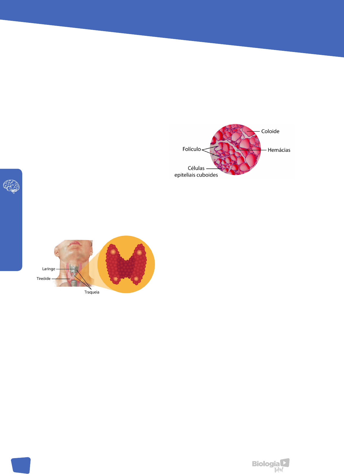 184 FIS IO LO GI A HU MA NA FUNÇÕES DA TIREOIDE E PARATIREOIDE A glândula tireoide fica localizada abaixo da laringe, nos dois lados da traqueia e na sua parte frontal. Essa glândula secreta dois hormônios extremamente importantes: a tiroxina e a triiodotironina, popularmente conhecidos como T4 e T3. Esses hormônios exercem diversos efeitos no metabolismo. Além disso, a tireoide também secreta a calcitonina, que é um hormônio que atua no metabolismo do cálcio. Na ausência de secreção dos hormônios tireoidianos, ocorre queda de cerca de 40%, no metabolismo basal. Já o excesso de secreção, pode causar um aumento no metabolismo basal de 60 a 100%. Em princípio, a secreção da tireoide é controlada pelo hormônio tireoestimulante (TSH), que é secretado pelo lobo anterior da hipófise. HORMÔNIOS TIREOIDIANOS Os hormônios secretados pela glândula tireoide, constituem cerca de 90% de tiroxina, e 10% de triiodotironina. Mas a maior parte da tiroxina é convertida em triiodotironina nos tecidos. Suas funções são qualitativamente as mesmas, porém diferem na rapidez e intensidade de ação, já que a triiodotironina pode ser considerada mais potente que a tiroxina. Apesar disso, ela ocorre em quantidades menores na circulação do sangue e dura menos tempo que a tiroxina. ANATOMIA DA GLÂNDULA TIREOIDE A glândula tireoide é constituída por numerosos folículos fechados, que estão repletos de uma substância secretora, o coloide. Os folículos são revestidos por células epitelioides cúbicas, responsáveis pela secreção de seus produtos no interior dos mesmos. O coloide é composto principalmente por uma grande glicoproteína, a tireoglobulina, que abriga os hormônios tireoidianos em sua molécula. Depois que a secreção alcança o interior do folículo, ela precisa ser reabsorvida pelo epitélio folicular. O fluxo sanguíneo na tireoide promove um suprimento muito rico, quando comparado a outras áreas do organismo, com exceção do córtex suprarrenal. IODO NA FORMAÇÃO DE TIROXINA O iodo é uma substância essencial para a síntese de quantidades normais de tiroxina. Para se ter uma ideia, são necessários cerca de 50 mg de iodo por ano em um organismo, na forma de iodetos. Esse iodo é obtido a partir da alimentação. Por esse motivo, o sal comum que consumimos é iodado. Para isso, é adicionado uma parte de iodeto de sódio para cada 100.000 partes de cloreto de sódio, evitando assim a deficiência dessa substância. Os iodetos que foram ingeridos, são absorvidos pelo tubo gastrointestinal, passando para o sangue praticamente da mesma forma que os cloretos. Porém, sua maior parte é logo em seguida excretada pelos rins, e apenas uma pequena parte é removida da circulação pela tireoide. 185www.biologiatotal.com.br FIS IO LO GI A HU MA NA TIREOGLOBULINA, TIROXINA E TRIIODOTIRONINA FORMAÇÃO E SECREÇÃO DA TIREOGLOBULINA As células da tireoide são células glandulares secretoras de proteínas. A tireoglobulina secretada, contém resíduos de tirosina em sua molécula. Esses resíduos são os principais substratos que se combinam com o iodo para formar os hormônios da tiroide, os quais são formados no interior da molécula de tireoglobulina. Dessa forma, a tiroxina e a triiodotironina que são formadas a partir do aminoácido tirosina, permanecem como parte da molécula de tireoglobulina durante a síntese dos hormônios da tiroide. Além disso, as células glandulares também processam o iodo e fornecem enzimas e outras substâncias para que possa ocorrer a síntese dos hormônios da tireoide. SÍNTESE DOS HORMÔNIOS DA TIREOIDE Durante a síntese dos hormônios tireoidianos, a primeira etapa é a conversão dos íons iodeto em uma forma oxidada de iodo, iodo nascente (Iº) ou como I3-, que pode se combinar diretamente com a tirosina. A oxidação é promovida pela enzima peroxidase e seu peróxido de hidrogênio, constituindo um poderoso sistema para oxidar os iodetos. A organificação da tireoglobulina é o processo em que ocorre a ligação do iodo à molécula de tireoglobulina. O iodo oxidado, liga- se de modo direto à tirosina, pela ação de enzimas. Primeiramente, a tirosina é iodetada a monoiodotirosina e depois a diiodotirosina. Depois, quantidades cada vez maiores de resíduos de diiodotirosina se acoplam, formando a molécula de tiroxina, que constitui parte da molécula de tireoglobulina. Uma molécula de monoiodotirosina se une a uma molécula de diiodotirosina e forma a triiodotironina. Para cada dez moléculas de tiroxina, cada molécula de tireoglobulina tem de uma a três moléculas de tiroxina e cerca de uma molécula de triiodotironina. Dessa forma, os hormônios da tireoide são armazenados nos folículos, por um período de dois a três meses, em quantidades necessárias para atender a demanda do organismo. SECREÇÃO DE TIROXINA E TRIIODOTIRONINA Como foi mencionado, a tiroxina e a triiodotironina são inicialmente clivadas da molécula de tireoglobulina, e somente em seguida os hormônios livres são liberados. Porém, cerca de 75% da tirosina iodetada na tireoglobulina nunca irá se transformar em hormônios da tireoide, permanecendo na forma de monoiodotirosina ou diiodotirosina. O iodo utilizado para a síntese dos hormônios, é clivado por uma enzima, deixando sua maior parte disponível para reciclagem no interior da glândula, possibilitando a síntese de quantidades adicionais desses hormônios. Durante o processo em que esses hormônios entram em contato com os tecidos alvo do organismo, grande parte do iodo presente na tiroxina é retirado para formar quantidades adicionais de triiodotironina. Por isso, o hormônio que é liberado e utilizado pelos tecidos é principalmente a triiodotironina. Praticamente quase toda tiroxina e a triiodotironina que são liberadas no sangue, combinam-se com várias proteínas plasmáticas, como a globulina, a pré-albumina e a albumina. A quantidade de globulina de ligação