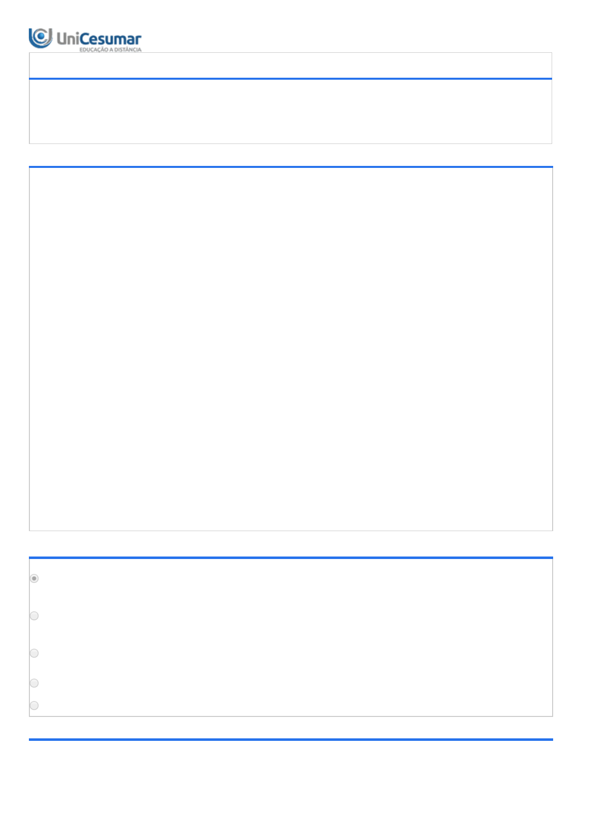 01/03/2020 Unicesumar - Ensino a Distância 1/7 ATIVIDADE 3 - ENG SOFT - ADMINISTRAÇÃO DE CONFLITOS E RELACIONAMENTOS - 2019A1.2 Período:18/03/2019 08:00 a 02/04/2019 23:59 (Horário de Brasília) Status:ENCERRADO Nota máxima:0,50 Gabarito:Gabarito será liberado no dia 03/04/2019 00:00 (Horário de Brasília) Nota obtida:0,50 1ª QUESTÃO Como vimos em nosso material didático, existem diferentes variáveis que influenciam no comportamento organizacional: variáveis independentes, variáveis dependentes, variáveis intermediárias e variáveis resultantes. FILIPPIN, M.; SILVA, P. R. da; KOYAMA, R. E. Administração de Conflitos e Relacionamentos. UniCesumar: Maringá. 2018. Sendo assim, associe as duas colunas relacionando a variável com as características correspondentes: (1) Variáveis resultantes. (2) Variáveis dependentes. (3) Variáveis intermediárias. (4) Variáveis independentes. ( ) São resultantes das variáveis dependentes e independentes do comportamento organizacional. ( ) Podem ser classificadas com variáveis no nível do sistema organizacional, no nível do grupo e no nível individual. ( ) São frutos que resultaram das variáveis intermediárias do comportamento organizacional. ( ) Alguns exemplos dessas variáveis são a rotação de funcionários, o absenteísmo e a satisfação no trabalho. A sequência correta dessa classificação é: ALTERNATIVAS (3), (4), (1), (2). (1), (2), (3), (4). (2), (3), (1), (4). (4), (3), (1), (2). (3), (1), (4), (2). 2ª QUESTÃO 01/03/2020 Unicesumar - Ensino a Distância 2/7 No decorrer da formação profissional de um indivíduo este absorve informações relevantes a atividade que pretende desempenhar, porém não é apenas no ambiente acadêmico que este fato ocorre, as vivências e experiências que teve no decorrer da vida tem um grau considerável de relevância. A unificação dessas informações caracteriza o conhecimento que este indivíduo possui, ou seja, por mais que duas pessoas tenha a mesma formação, seu diferencial para seus possíveis empregadores será suas vivências e as particularidades de seus conhecimentos, pois antes as empresas priorizavam apenas o investimento na produção, hoje o foco se divide com pessoas que possibilitem melhores resultados produtivos de acordo com suas aptidões. FILLIPIN, Marcelo; SILVA, Patrícia Rodrigues da; KOYAMA, Renata Emy. Administração de Conflitos e Relacionamentos. Maringá – PR.: UniCesumar, 2018. Diante deste cenário e também no conceito de sociedade do conhecimento trabalhado na disciplina, analise as alternativas abaixo e em seguida assinale aquela que melhor condiz com o texto apresentado. ALTERNATIVAS Capital Social. Capital Humano. Investimentos Humanos. Valores de conhecimentos. Desenvolvimento intelectual. Atenção! Questão anulada. ALTERNATIVAS (4), (2), (3), (1). (4), (3), (2), (1). (3), (4), (1), (2). (1), (4), (3), (2). (2), (3), (1), (4). 4ª QUESTÃO O líder, na verdade, não é o super-homem ou a mulher maravilha que muitos imaginam ou querem demonstrar ser. Esse é um mito criado para atender as expectativas da sociedade, que são especialmente fortes nos países onde a cultura enaltece o fazer, a agressividade, a ousadia e as relações de poder. O autor Maximiano (2004), destaca que a liderança precisa ser vista como um processo social no qual interage um conjunto de variáveis, que compõem o ambiente organizacional. Disponível em: <httpss://goo.gl/vVA5vH>. Acesso em: 19 fev. 2018. Sendo assim, diante do que foi estudado sobre a liderança, para conduzir a organização é necessário: ALTERNATIVAS 01/03/2020 Unicesumar - Ensino a Distância 3/7 O exercício da liderança em seu sentido completo, para que dessa forma se conduza a empresa de acordo com os seus objetivos e a sua missão. Somente o exercício da liderança orientada para as pessoas, já que dessa forma garante-se os bons relacionamentos e os conflitos são eliminados. Que o líder seja somente orientado para a tarefa, pois, garantirá que o trabalho seja realizado sem que aspirações pessoais atrapalhem o processo. A plenitude do exercício da liderança diretiva, concentrando todo o poder de decisão no liderar, ou seja, sem a participação de qualquer outra pessoa. Trocar frequentemente os membros das equipes de trabalho, visto que com o tempo as pessoas passam a atrapalhar o desempenho do líder dentro da organização. 5ª QUESTÃO Dentre os elementos presentes na dinâmica organizacional, um deles torna-se essencial, principalmente no que diz respeito à gestão de pessoas: a necessidade de aprimorar as competências dos colaboradores. É necessário aprimorar o conhecimento técnico, o talento, as habilidades comportamentais, como também a capacidade de inovação dos indivíduos. FILIPIN, Marcelo; SILVA, Patrícia Rodrigues da; KOYAMA, Renata Emy. Administração de Conflitos e Relacionamentos. Maringá-Pr. Unicesumar, 2018. (Adaptado) Considerando este elemento, leia as afirmações abaixo. I. O treinamento e o desenvolvimento das pessoas são processos utilizados para aprimorar suas capacidades de trabalho dentro e fora dos ambientes organizacionais. II. O treinamento pode ser caracterizado como um processo orientado para questões que visem o desempenho no curto prazo. III. O processo de desenvolvimento de pessoas, quando possível, deve ser evitado pelas organizações, pois, corre-se o risco de apenas preparar talentos para a concorrência. IV. Desenvolver pessoas é principalmente dar-lhes formação básica para o crescimento pessoal não apenas para o cargo presente, mas também para a carreira fora da empresa. É correto o que se afirma em: ALTERNATIVAS I e II apenas. II e III apenas. I, II e IV apenas. I, III e IV apenas. I, II, III e IV. 6ª QUESTÃO 01/03/2020 Unicesumar - Ensino a Distância 4/7 O __________________ é resultado da Administração Científica que foi desenvolvida em meio a um processo de transformação gerado pela segunda Revolu