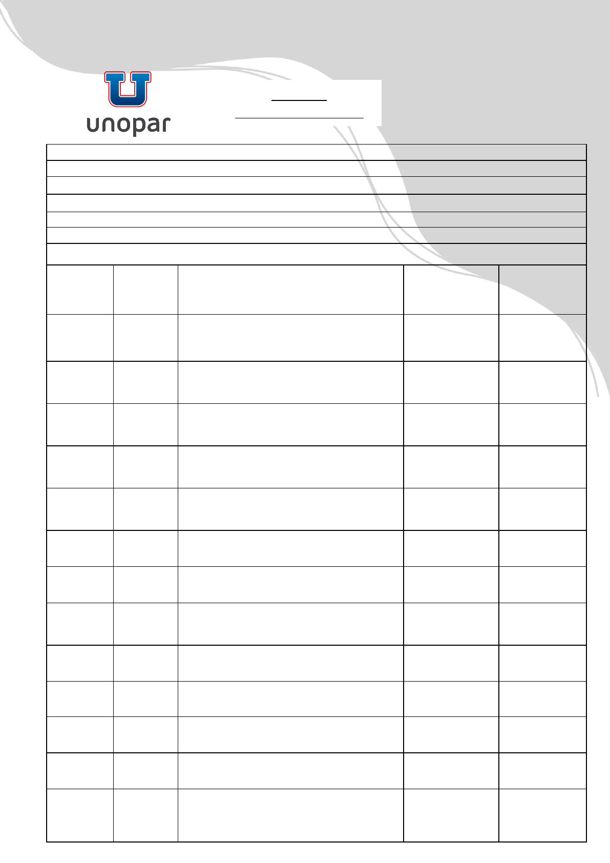 FICHA DE ACOMPANHAMENTO ALUNO(A): EAD: SEMESTRE: POLO: TUTOR PRESENCIAL: TUTOR A DISTÂNCIA: SUPERVISOR DE CAMPO: ESCOLA: ENDEREÇO DA ESCOLA: DATA HORAS REALIZADAS DESCRIÇÃO DA ATIVIDADE ASSINATURA SUPERVISOR DE CAMPO ASSINATURA TUTOR PRESENCIAL 04 Horas Ativividade 1: Leitura do Manual de Estágio 04 Horas Atividade 2: Visita a escola para Apresentação do Academico- estágiario 04 Horas Atividade 3: Observação do Espaço Escolar e da Atuação do Pedagogo 04 Horas Atividade 3: Observação do Espaço Escolar e da Atuação do Pedagogo 04 Horas Atividade 3: Observação do Espaço Escolar e da Atuação do Pedagogo 04 Horas Atividade 3: Observação do Espaço Escolar e da Atuação do Pedagogo 04 Horas Atividade 3: Observação do Espaço Escolar e da Atuação do Pedagogo 04 Horas Atividade 4: Análise do Projeto Político Pedagógico e Entrevista com o Pedagogo 04 Horas Atividade 4: Análise do Projeto Político Pedagógico e Entrevista com o Pedagogo 04 Horas Atividade 4: Análise do Projeto Político Pedagógico e Entrevista com o Pedagogo 04 Horas Atividade 4: Análise do Projeto Político Pedagógico e Entrevista com o Pedagogo 04 Horas Atividade 4: Análise do Projeto Político Pedagógico e Entrevista com o Pedagogo 04 horas Atividade 5: Elaboração do Plano de Ação do Pedagogo 04 horas Atividade 5: Elaboração do Plano de Ação do Pedagogo 04 horas Atividade 5: Elaboração do Plano de Ação do Pedagogo 04 horas Atividade 5: Elaboração do Plano de Ação do Pedagogo 04 horas Atividade 5: Elaboração do Plano de Ação do Pedagogo 04 Horas Atividade 6: Apresentação do Plano de Ação do Pedagogo na escola 04 Horas Atividade 6: Apresentação do Plano de Ação do Pedagogo na escola 04 Horas Atividade 7: Elaboração do Relatório Final de Estágio 04 Horas Atividade 7: Elaboração do Relatório Final de Estágio 04 Horas Atividade 7: Elaboração do Relatório Final de Estágio 04 Horas Atividade 7: Elaboração do Relatório Final de Estágio 04 Horas Atividade 7: Elaboração do Relatório Final de Estágio 04 Horas Atividade 7: Elaboração do Relatório Final de Estágio Total: 100 horas Assinatura do Tutor Presencial Assinatura do Diretor da Escola Carimbo da Escola