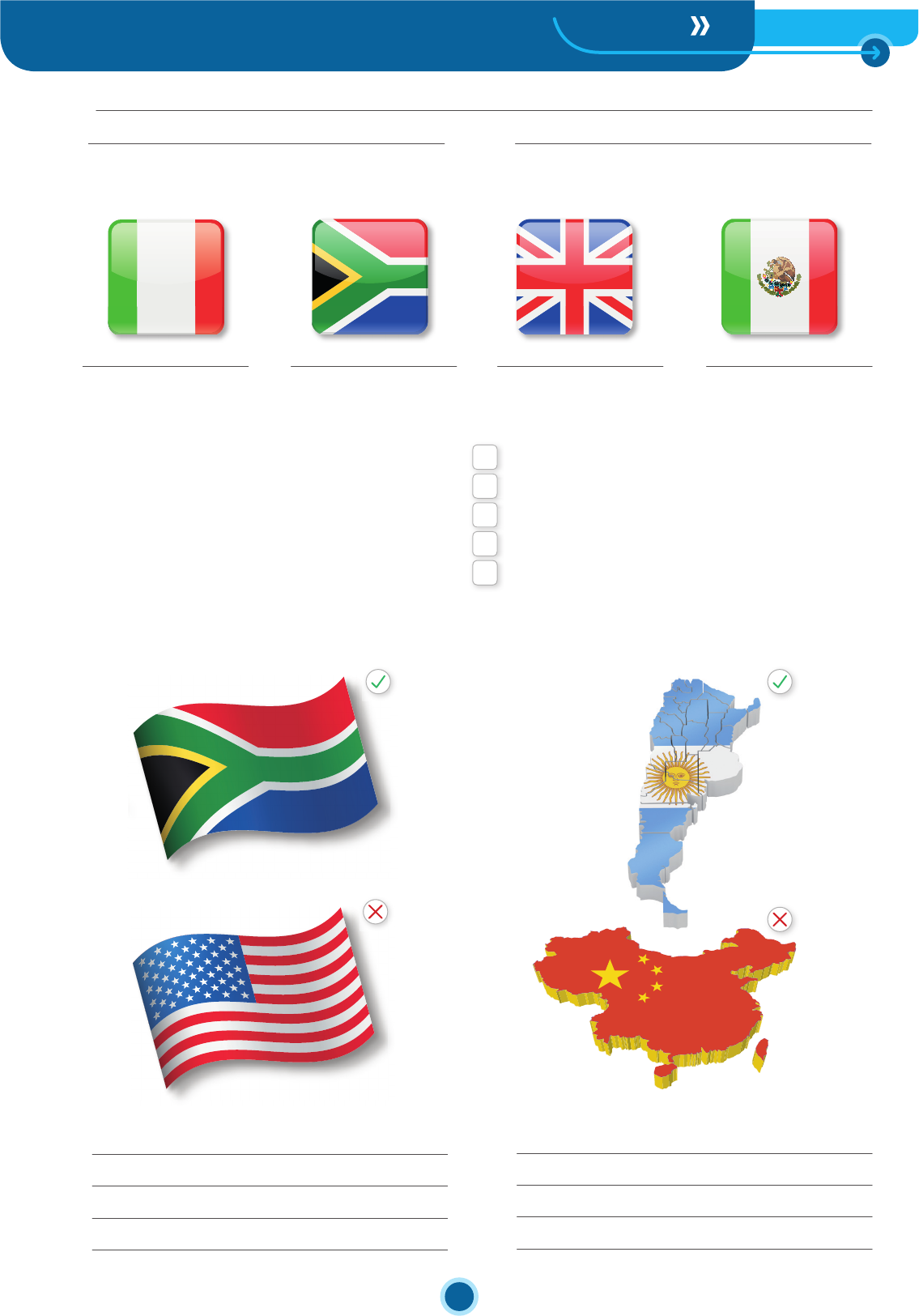 Name: Date: Grade: New iLearn 1Aunit 2 test PR IN TA BL E - IL EA RN N EW © Pe ars on Ed uc ati on do Br asi l, 2 01 8 The world at your fingertips! 1. Look at the flags and write the names of the countries. (2 marks) 2. Match the questions with the answers. (2 marks) 3. Write questions and answers about the people below. (2 marks) a. a. David – American / South African b. Lorena and Juan – Chinese/ Argentinian a. What’s your name? b. Where are you from? c. Are you from Mexico? d. Is your teacher from the United States? e. Are your parents from China? c. b. d. I’m from India. Yes, they are. My name’s Gustavo. No, I am not. I’m from Argentina. Yes, she is. She is from New York. 1 New iLearn 1Aunit 2 test PR IN TA BL E - IL EA RN N EW © Pe ars on Ed uc ati on do Br asi l, 2 01 8 4. Circle the correct alternatives. (2 marks) c. Tandeka – Italy / China d. you – Indian / Brazilian a. Nice to meet you / your. What’s your / you name? b. My / I first name is Marina and my / I last name is Santos. c. Camila and Carina are sisters. Their / They are in the same class. d. We are from Rio de Janeiro, but our / we parents are from Salvador. 5. Unscramble the questions. (2 marks) a. name / first / What / your / is ? b. What / middle / is / name / your ? c. your / name / is / What / last ? d. you / old / How / are ? 2 Name: Date: Grade: New iLearn 1unit 2 test PR IN TA BL E - IL EA RN N EW © Pe ars on Ed uc ati on do Br asi l, 2 01 8 BThe world at your fingertips! 1. Unscramble the letters to find the names of the countries. (2 marks) a. N A C D A A b. Y L I T A c. L Z R B A I d. L A I A T R S U A 2. Circle the correct answer. (1.6 marks) American, Chinese, British, Canadian, Argentinian, South African, and Nigerian are… a. countries. b. people. c. nationalities. d. possessive adjectives. 3. Complete the conversation with the words and phrases in the box. (2.4 marks) A: are you from? B: from Brazil, but my parents are Argentina. And you? A: My and I from . B: That’s cool! 4. Match the questions with the answers. (2 marks) family are Where I am Canada from a. Are you from Argentina? b. Who is that man? c. Is your mother from the United States? d. Where are you from? Yes, she is. She is from Los Angeles. No, I am not. I’m from Mexico. I am from Londrina, in Brazil. He is my English teacher. 5. Order the dialogue a-e. (2 marks) She is a famous Canadian singer. Cool! Alessa is a beautiful name. What is her name? Her full name is Alessia Cara. Who is she? 1 Name: Date: Grade: New iLearn 1unit 2 test PR IN TA BL E - IL EA RN N EW © Pe ars on Ed uc ati on do Br asi l, 2 01 8 C 1. Circle the correct alternatives. (2 marks) The world at your fingertips! a. Where is Aline from? a. She is from Nigeria. b. She from Nigeria. b. Is your teacher from the United Kingdom? a. Yes, she’s. b. No, she isn’t. c. Where are your parents from? a. They’re from Italy. b. I am from Italy. d. Are you from Brazil? a. Yes, I am. b. Yes, I from Brazil. 2. Look at the flags. Then write sentences about the countries and nationalities. (2 marks) a. b. c. d. 1 New iLearn 1unit 2 test PR IN TA BL E - IL EA RN N EW © Pe ars on Ed uc ati on do Br asi l, 2 01 8 C 4. Unscramble the sentences. (2 marks) a. classmates / are / Melissa and Gabriel / my b. English / my / Mr. Rudolph / is / teacher c. math / in / Pedro / class / my / is d. Larissa / student / is / the new 5. Complete the sentences with possessive adjectives. (2 marks) a. Where is teacher from? b. She is a student. first name is Catarina. c. Daniel is my best friend. birthday is today. d. We are sisters. names are Sophia and Laura. 3. Complete the conversation with the words in the box. (2 marks) student are from Brazil your A: Hi! My name is Matheus Rodrigues. What is name? B: Hello! I am Caio Montenegro. I am a new here. A: you Argentina, Caio? B: No, I’m not. I’m from . . 2