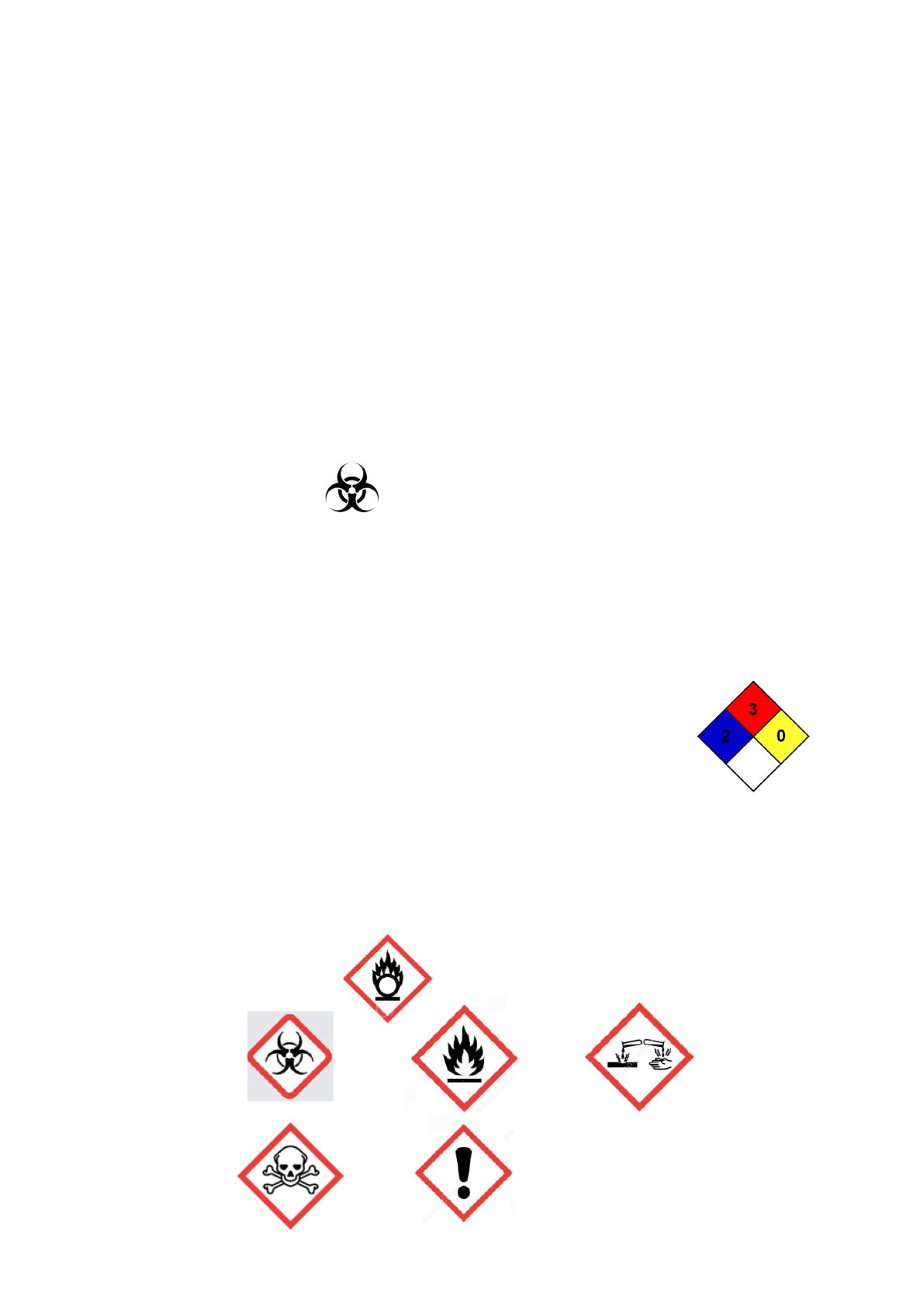 Exercício sobre Simbologia, sinalização de aviso e rotulagem Individual Entregar 05/03 Utilizar o material sobre Simbologia, sinalização de aviso e rotulagem em PDF que está no e-mail. 1. Um recipiente contendo um produto químico foi encontrado num depósito quase sem identificação. O único dado disponível foi um rótulo com o diamante de Hommel, contendo a seguinte informação: azul = 0, vermelho = 0, amarelo = 3, branco = uma letra W cortada. Qual o significado desta informação? A. Não é possível avaliar, já que o rótulo não contém o nome do produto B. o produto é letal e inflamável C. o produto é inflamável e não pode ser exposto à fontes de calor D. o produto não oferece risco e pode ser exposto a água E. o produto é altamente reativo e não pode ser exposto a água 2. Um container com o símbolo ! estampado em sua lateral foi encontrado num depósito abandonado. Qual o perigo apresentado nesta situação? A. o container contém produtos com contaminação biológica B. o container possui substâncias radioativas C. o container possui produtos químicos tóxicos D. o container não representa um perigo E. o container contém lixo comum 3. Se você encontrar um produto com essa identificação, qual deve ser o seu cuidado? A. usar máscaras, luvas e manter-se longe de fontes de calor B. usar máscara e luvas e manter-se longe de água C. manter-se longe de fontes de calor e de água D. não provocar atrito e manter-se longe de água E. o produto não apresenta riscos 4. Um produto com este símbolo não pode ser armazenado perto de qual destes produtos? disciplina de biossegurança Profa Lirna Salvioni a) b) c) d) e) 5. observe o rótulo de risco apresentado na figura ao lado. este rótulo é um indicativo de A. perigo de explosão B. perigo de vida C. produto nocivo D. produto corrosivo E. produto comburente 6. Em relação a sinalização utilizada em Biossegurança, podemos afirmar que: I- a sinalização de perigo é representada por símbolo na forma triangular e cor vermelha II- a sinalização de emergência é representada pelo símbolo na forma retangular e fundo verde. III- o extintor de incêndio deve ser sinalizado através de figura na cor branca e fundo vermelho, no formato retangular. IV- A sinalização de proibição é sempre representada por uma figura e uma faixa na diagonal. Estão corretas as que se afirmam em: A. I e IV B. II e III C. I, II e III D. II, III e IV E. Todas as alternativas estão corretas disciplina de biossegurança Profa Lirna Salvioni