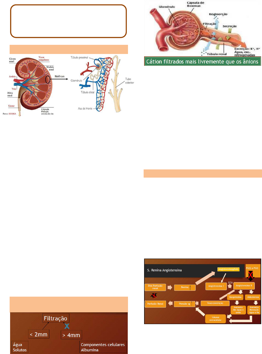 8. AVALIAÇÃO DA FUNÇÃO RENAL NÉFRON - Quando se fala que está avaliando rim, está na verdade avaliando o nefron e a capacidade dele de filtrar, a integridade dos glomérulos e dos túbulos - Está avaliando a integridade de toda a atividade funcional - Podendo ter lesão em uma parte ou em toda a unidade funcional - Semelhante ao que viu no pâncreas ou no fígado, quando se vê nos testes, já é um pouco tarde - Está se procurando testes para avaliar cada vez mais cedo - Funções do rim: - Filtrar o sangue - Absorver e reabsorver o que o organismo precisa - Excretar os metabólitos - Além dessas funções, ainda tem a função hotmonal, produção de eritropoietina - Metabolsimo do cálcio sofre interferência das lesões renais (ativação da vitamina D) BARREIRA DA FILTRAÇÃO GLOMERULAR 2 motivos que não passam proteínas (mesmo a albumina) - Diâmetro - Carga elétrica da capsula é negativa, e a albumina também é negativa (repulsão) Por isso que os cátions são mais filtrados que os ânions Nem toda vez que tem proteína na urina vai ter lesão renal - NÃO Ex: quando tem febre, vai ter vasodilatação e a frouxidão vai deixar proteínas passarem Tem que avaliar mais de um critério RITMO DA FILTRAÇÃO GLOMERULAR · Relativamente constante · S. renina Angiotensina Aldosterona · Controle resistência das arteríolas aferente e eferente - Reflexo miogênico - Retroalimentação tubuloglomerular - O organismo tende a deixar o ritmo mais constante - Usa o sistema Renina Angiotensiona – aldosterona - Angiotensina 2 ao mesmo tempo fez vsoconstrição e aumentou aldosterona para aumentar teor de sódio - Tudo isso para manter a taxa de filtração sempre CONSTANTE - Chega um momento em que isso não vai conseguir se manter - Paciente chega em anúria (sem como manter a taxa de filtração) - Tentando voltar a perfusão normal e para o sistema de vasoconstrição periférica/renal PRINCIPAL FUNÇÃO DO SISTEMA URINÁRIO: EXCRETAR CREATININA (secretada pelo rim, e nada reabsorvida) E NITROGÊNIO UREICO (ureia é reabsorvida, metabolizada e excretada, de origem hepática- se tem lesão hepática, diminuição circulação ureica, e diminui ureia na urina A URINA É UM ULTRAFILTRADO DO SANGUE NITROGÊNIO UREICO Chama de ureia – pode vir do TGI (do metabolismo das bactérias intestinais, casos de desnutrição, pode diminuir a ureia) – animais com diurese (dilui a ureia), e no hipertireoidismo, pode ocorrer pelo aumento de catabolismo e taxa de filtração glomerular; desidratação pode aumentar a ureia, pois a taxa de filtração diminui e fica circulando mais tempo UREIA · Origem hepática · Metabolismo amônia e bicabornato DIMINUIÇÃO · Insuficiência hepática · Shunt porto sistêmico · Desnutrição · Diurese · Hipertireoidismo - Aumenta catabolismo e aumenta a Taxa de Filtração Glomerular - Caquexia – diminuição da creatinina <TAXA FILTRAÇÃO > ABSORÇÃO UREIA - Durante todo o trajeto, vai ter a reabsorção da ureia, sendo 50% uma redução passiva da ureia no ... e 10% uma reabsorção ativa da ureia no ... · Desidratação pequenos animais · Razão UN:Cr (Ureia:creatinina) > 30 - Quando tem muito aumento da ureia e não da creatinina, pode não ser renal, pode ser do TGI · Normal < 20 RUMINANTES - Tantos os ruminantes quanto os equinos tem metabolismo intestinal diferente (TOMAR CUIDADO) – as bactérias tem capacidade de fermentar, e aumenta ureia (pode ser alterada pelo tipo de alimentação – ELIMINAR ESSES FATORES QUE NÃO DE ORIGEM RENAL, e sim rumenal ou intestinal) · Microbiota ruminal – degradação ureia – PTN · Ureia TGI · Não pode ser avaliada a função renal pela relação - NU, creatinina e densidade urinária · Aumento do NU (nitrogênio ureico) sem aumento creatinina - Estase ruminal, sangramento TGI Tem que pensar se tem estase ruminal, sangramento TGI pois vai aumentar o valor de referência EQUINOS · Apesentam NU no TGI · Podem ser utilizadas as relações para avaliação renal - NU junto da creatinna e da densidade CREATININA · Origem muscular - Conversão enzima creatina quinase em fosfato de creatina no mm · Produção constante 2% ao dia, depende massa muscular · Fonte de energia para a produção de ATP · Aumento pós-prandial por altas ingestão de carne = mínima reduz em 2 h · Aumento pré-renal, renal e pós-renal · Animais de alto nível esportivo, tem creatinina alta (relação com a taxa de musculatura) ANIMAL NORMAL · NU E Creatinina: altas concentrações urinárias · Creat +/- 300 mg/dL na urina (pois é secretada) · Baixas concentrações sanguíneas – creatinina 1 mg/dL (pois é secretada e não reabsorvida) INSUFICIÊNCIA · Diminuição creatinina urinária <100mg/dL não secreta · Aumento plasma > 4mg/dL – fica presa no sangue circulante EQUINOS COM CÓLICA · Aumento creatinina por aumento de outros cromógenos (alteram o exame pela cor) - Cetona, vitamina A, glicose e carotenos, piruvato, ácido úrico, ácido ascórbico Acontece alteração da reação de cor (ex: sangue hemolizado, lipemico, cromógenos) Em ruminantes tem alteração principalmente por corpos cetonicos circulantes NITROGÊNIO UREICO E CREATININA AZOTEMIA · Aumento SÉRICO ureia e creatinina SEM SINTOMA CLÍNICO · + 75% néfrons afuncionais - Animais fazem azotemia quando tem + de 75% néfrons afuncionais – É uma prova TARDIA · Não detectam precocemente as alterações renais PRÉ RENAL: · Hipovolemia leve · Desidratação moderada · Choque com desidratação acima de 12% IMPORTANTE HIDRATAR ANTES DE FAZER O EXAME RENAL: · Glomérulo · Túbulos · Interstício · Pelve renal · Vasos Sanguíneos PÓS RENAL: · Obstrução qualquer local após o néfron · Ruptura de estruturas do sistema urinário FAZ O EXAME SEM HIDRATAR, pois, pode romper a bexiga FATORES NÃO RENAIS AUMENTAM NU E CREATININA NU e CREATININA: · Desidratação · Hipovolemia · Choque NU: · Hemorragia TGI CREATININA: · C