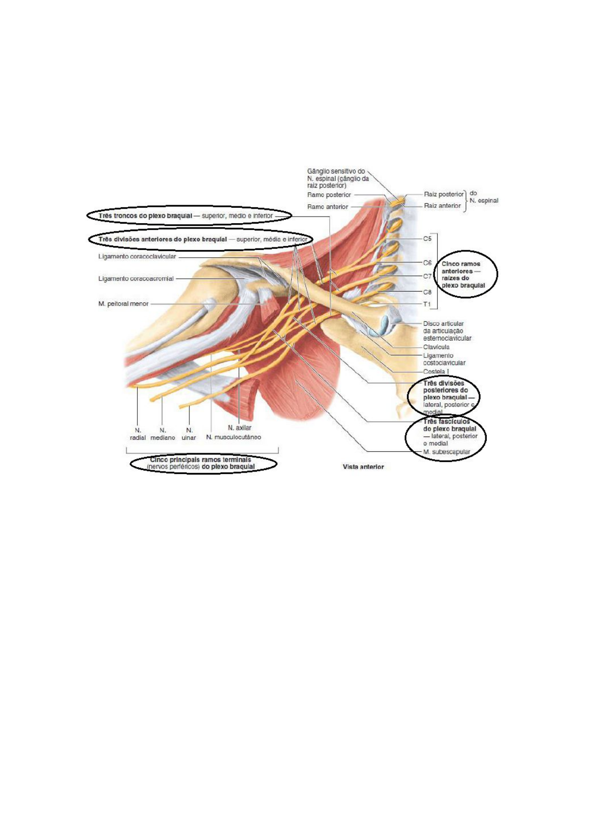 Larissa Ribeiro Plexo Braquial ➢ O membro superior é inervado pelo plexo braquial situado no pescoço e na axila, formado por ramos anteriores dos quatro nervos espinhais cervicais inferiores (C5,C6,C7,C8) e do primeiro torácico (T1). O plexo braquial tem localização lateral à coluna cervical e situa-se entre os músculos escalenos anterior e médio, posterior e lateralmente ao músculo esternocleidomastoideo. /~; ➢ Os ramos ventrais do quinto e do sexto nervos cervicais (C5-C6) formam o tronco superior; o ramo anterior do sétimo nervo cervical(C7) forma o tronco médio; e os ramos anteriores do oitavo nervo cervical e do primeiro nervo torácico (C8-T1) formam o tronco inferior. ➢ Os três troncos, localizados na fossa supraclavicular, dividem-se em dois ramos, um anterior e um posterior, que formam os fascículos, situados em torno da artéria axilar. ➢ Os ramos anteriores dos troncos superior e médio formam o fascículo lateral; o ramo anterior do tronco inferior forma0 ➢ ➢ o fascículo medial; e os ramos posteriores dos três troncos formam o fascículo posterior. Na borda inferior e lateral do músculo peitoral menor, os fascículos se subdividem nos ramos terminais do plexo braquial. ➢ Os ramos do plexo braquial podem ser descritos como supra-claviculares e infra-claviculares. ➢ O plexo passa posteriormente à clavícula e acompanha a artéria axilar sob o músculo peitoral maior. Ramos Supra-claviculares: Nervos para os Músculos Escalenos e Longo do Pescoço – originam-se dos ramos ventrais dos nervos cervicais inferiores (C5,C6,C7 e C8), próximo de sua saída dos forames intervertebrais. Nervo Frênico – anteriormente ao músculo escaleno anterior, o nervo frênico associa-se com um ramo proveniente do quinto nervo cervical (C5). Mais detalhes do nervo frênico em Plexo Cervical. Nervo Dorsal da Escápula – proveniente do ramo ventral de C5, inerva o levantador da escápula e o músculo romboide. Nervo Torácico Longo – é formado pelos ramos de C5, C6 e c7 e inerva o músculo serrátil anterior. Nervo do Músculo Subclávio – origina-se próximo à junção dos ramos ventrais do quinto e sexto nervos cervicais (C5 e C6) e geralmente comunica-se com o nervo frênico e inerva o músculo subclávio. Nervo Supra-escapular – originado do tronco superior (C5 e C6), inerva os músculos supra-espinhoso e infra-espinhoso. Ramos Infra-claviculares: Estes se ramificam a partir dos fascículos, mas suas fibras podem ser seguidas para trás até os nervos espinhais. Do Fascículo Lateral saem os seguintes nervos: Peitoral Lateral – proveniente dos ramos do quinto ao sétimo nervos cervicais (C5, C6 e C7). Inerva a face profunda do músculo peitoral maior; Nervo Musculocutâneo – derivado dos ramos ventrais do quinto ao sétimo nervos cervicais (C5, C6 e C7). Inerva os músculos braquial anterior, bíceps braquial e coracobraquial; Raiz Lateral do Nervo Mediano – derivado dos ramos ventrais do quinto ao sétimo nervos cervicais (C5, C6 e C7). Inerva os músculos da região anterior do antebraço e curtos do polegar, assim como a pele do lado lateral da mão. Do Fascículo Medial saem os seguintes nervos: Peitoral Medial – derivado dos ramos ventrais do oitavo nervo cervical e primeiro nervo torácico (C8 e T1). Inerva os músculos peitorais maior e menor; Nervo Cutâneo Medial do Antebraço – derivado dos ramos ventrais do oitavo nervo cervical e primeiro nervo torácico (C8 e T1). Inerva a pele sobre o bíceps até perto do cotovelo e dirige-se em direção ao lado ulnar do antebraço até o pulso; Raiz Medial do Nervo Mediano – originada dos ramos ventrais do oitavo nervo cervical e primeiro nervo torácico (C8 e T1). Inerva os músculos da região anterior do antebraço e curtos do polegar, assim como a pele do lado lateral da mão. Do fascículo Posterior saem os seguintes nervos: Subescapular Superior – originado dos ramos do quinto e sexto nervos cervicais (C5 e C6). Inerva o músculo subscapular; Nervo Toracodorsal – originado dos ramos do sexto ao oitavo nervos cervicais (C6, C7 e C8). Inerva o músculo latíssimo do dorso; Nervo Subescapular Inferior – originado dos ramos do quinto e sexto nervos cervicais (C5 e C6). Inerva os músculos subscapular e redondo maior; Nervo Axilar – originado dos ramos do quinto e sexto nervos cervicais (C5 e C6). Inerva os músculos deltoide e redondo menor; Nervo Radial – originado dos ramos do quinto ao oitavo nervos cervicais e primeiro nervo torácico (C5, C6, C7, C8 e T1). Inerva os músculos tríceps braquial, braquiorradial, extensor radial longo e curto do carpo, supinador e todos músculos da região posterior do antebraço. AULA DE ANATOMIA. Plexo braquial. Disponível em: <https://www.auladeanatomia.com/novosite/sistemas/sistema-nervoso/sn-periferico/ nervos-espinhais/plexo-braquial/>. Acesso em: 16 mai. 2018. MÚSCULOS INERVAÇÕES AÇÃO M. Peitoral maior Nn. Peitorais (C5, C6, C7) Adução e rotação medial do úmero M. Peitoral menor N. Peitoral medial (C8, T1) Estabiliza a escápula M. Serrátil anterior N. Torácico longo (C6, C7) Potrai a escápula M. Trapézio XI Eleva, deprime e retrai a escápula M. Grande dorsal N. Toracodorsal (C6, C7) Estende, aduz, e gira medial o úmero Mm. Romboides N. Dorsal da escápula (C5) Retração da escápula M. Deltoide N. Axilar (C5) Abdução do braço M. Supraespinal N. Supraescapular (C5) Abdução do braço M. Infraespinal N. Supraescapular (C5) Rotação lateral do braço M. Redondo menor N. Axilar (C5) Rotação lateral do braço M. Redondo Maior N. Subescapular inferior (C6) Aduz e roda medial o braço M. Subescapular Nn. Subescapular inferior e superior (C6) Rotação medial do braço ➢ A fáscia do peitoral maior e a axilar, são contínuas com a fáscia do braço. ➢ A fáscia profunda do braço é contínua com o peitoral e com a fáscia do antebraço. ➢ Quando a fáscia passa perto do úmero, ele forma um septo medial e lat