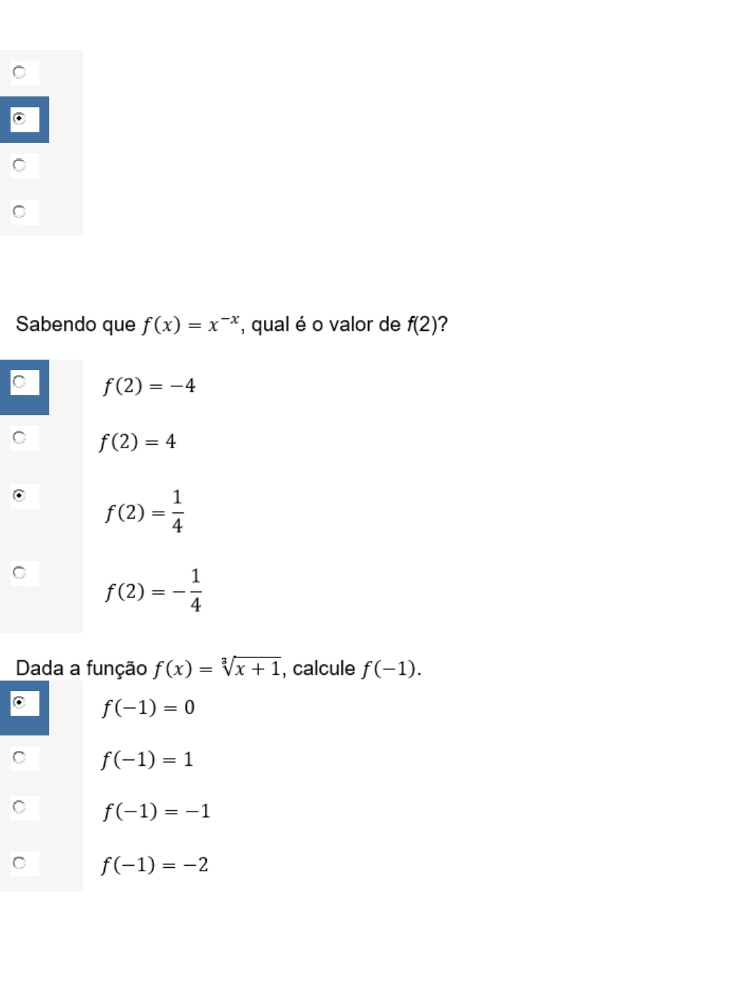 Questão 1/10 - Pré - Cálculo Sendo f(x) = x + 1. Calcule f(1). A f(1) = 0 B f(1) = 2 C f(1) = 0 D f(1) = -2 Questão 2/10 - Pré - Cálculo A B C D Questão 3/10 - Pré - Cálculo A B C D Questão 4/10 - Pré - Cálculo Sendo f(x) = 3x - 1. Calcule f(3). A f(3) = 9 B f(3) = 4 C f(3) = 6 D f(3) = 8 Questão 5/10 - Pré - Cálculo Qual é o domínio da função: A B C D Questão 6/10 - Pré - Cálculo A B C D Questão 7/10 - Pré - Cálculo Sendo f(x) = 3x + 1. Calcule f(2). A f(2) = 4 B f(2) = 6 C f(2) = 3 D f(2) = 7 Questão 8/10 - Pré - Cálculo Selecione a alternativa que corresponde ao domínio da seguinte expressão fracionária: A B C D Questão 9/10 - Pré - Cálculo A B C D Questão 10/10 - Pré - Cálculo A g(f(x)) = 2x B g(f(x)) = 2x - 1 C g(f(x)) = x D g(f(x)) = 2x + 2