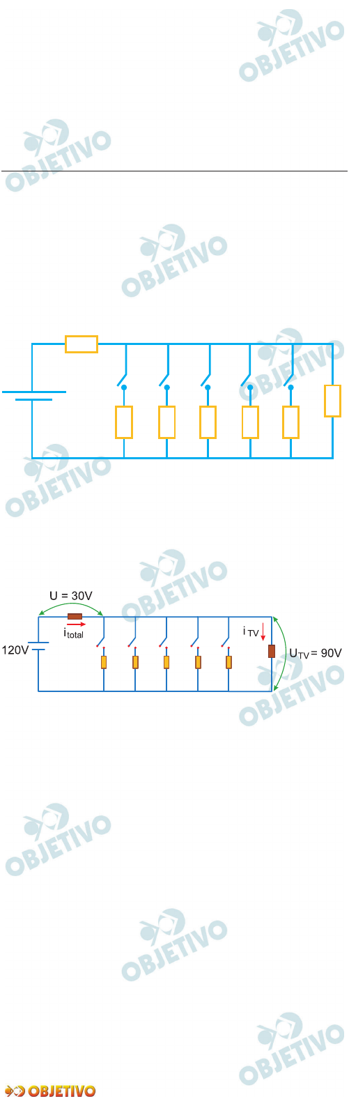 CCIIÊÊNNCCIIAASS DDAA NNAATTUURREEZZAA EE SSUUAASS TTEECCNNOOLLOOGGIIAASS 91 Uma casa tem um cabo elétrico mal dimensionado, de resistência igual a 10�, que a conecta à rede elétrica de 120V. Nessa casa, cinco lâmpadas, de resistência igual a 200�, estão conectadas ao mesmo circuito que uma televisão de resistência igual a 50�, conforme ilustrado no esquema. A televisão funciona apenas com tensão entre 90V e 130V. O número máximo de lâmpadas que podem ser ligadas sem que a televisão pare de funcionar é: a) 1. b) 2. c) 3. d) 4. e) 5. Resolução No circuito fornecido, temos: A menor tensão no televisor deve ser de 90V. Para uma ddp de 90V no televisor, a tensão elétrica no resistor de 10� será igual a 30V, assim: Televisão: UTV = RTV . iTV 90 = 50 iTV iTV = 1,8A Resistor de 10�: U = R itotal 30 = 10 itotal itotal = 3,0A Cada lâmpada que for conectada ao circuito será per - corrida por uma corrente elétrica dada por: 120V 10� 2 0 0 � 2 0 0 � 2 0 0 � 2 0 0 � 2 0 0 � 5 0 � EENNEEMM -- NNOOVVEEMMBBRROO//22001199 Ulâmp = Rlâmp . ilâmp 90 = 200 ilâmp ilâmp = 0,45A A corrente elétrica I que poderá acionar as lâmpadas será dada por: I = itotal – iTV I = 3,0 – 1,8 (A) I = 1,2A Finalmente: I = n . ilâmp 1,2 = n 0,45 n � 2,67 Assim, o número máximo de lâmpadas é: Observação: A tensão máxima no circuito é 120V. Mes mo com as lâmpadas desligadas, ligando-se o televisor, este não corre o risco de ser danificado. Resposta: BB nmáx = 2 EENNEEMM -- NNOOVVEEMMBBRROO//22001199 92 O 2,4-dinitrofenol (DNP) é conhecido como desacoplador da cadeia de elétrons na mitocôndria e apresenta um efeito emagrecedor. Contudo, por ser perigoso e pela ocorrência de casos letais, seu uso como medicamento é proibido em diversos países, inclusive no Brasil. Na mitocôndria, essa substância captura, no espaço intermembranas, prótons (H+) provenientes da atividade das proteínas da cadeia respiratória, retornando-os à matriz mitocondrial. Assim, esses prótons não passam pelo transporte enzimático, na membrana interna. GRUNDLINGH, J. et. al. 2,4-Dinitrophenol (DNP): a Weight Loss Agent with Significant Acute Toxicity and Risk of Death. Journal of Medical Toxicology, v. 7, 2011 (adaptado). O efeito emagrecedor desse composto está relacionado ao(à) a) obstrução da cadeia respiratória, resultando em maior consumo celular de ácidos graxos. b) bloqueio das reações do ciclo de Krebs, resultando em maior gasto celular de energia. c) diminuição da produção de acetil CoA, resultando em maior gasto celular de piruvato. d) inibição da glicólise de ATP, resultando em maior gasto celular de nutrientes. e) redução da produção de ATP, resultando em maior gasto celular de nutrientes. Resolução O DNP ao desacoplar a cadeia respiratória acaba alterando o gradiente de concentração de prótons. Nesta alteração, os prótons deixam de atravessar o ATP síntase, diminuindo consideravelmente a produção de ATP. Com a redução do ATP, a célula deverá gastar mais nutrientes para conseguir a quantidade de ATP necessária a suas atividades, daí o efeito emagrecedor do composto DNP. Resposta: EE EENNEEMM -- NNOOVVEEMMBBRROO//22001199 93 Em 1808, Dalton publicou o seu famoso livro o intitulado Um novo sistema de filosofia química (do original A New System of Chemical Philosophy), no qual continha os cinco postulados que serviam como alicerce da primeira teoria atômica da matéria fundamentada no método científico. Esses postulados são numerados a seguir: 1. A matéria é constituída de átomos indivisíveis. 2. Todos os átomos de um dado elemento químico são idênticos em massa e em todas as outras propriedades. 3. Diferentes elementos químicos têm diferentes tipos de átomos; em particular, seus átomos têm diferentes massas. 4. Os átomos são indestrutíveis e nas reações químicas mantêm suas identidades. 5. Átomos de elementos combinam com átomos de outros elementos em proporções de números inteiros pequenos para formar compostos. Após o modelo de Dalton, outros modelos baseados em outros dados experimentais evidenciaram, entre outras coisas, a natureza elétrica da matéria, a composição e organização do átomo e a quantização da energia no modelo atômico. OXTOBY, D.W.; GILLIS, H. P.; BUTLER, L. J. Principles of Modern Chemistry. Boston: Cengage Learning, 2012 (adaptado). Com base no modelo atual que descreve o átomo, qual dos postulados de Dalton ainda é considerado correto? a) 1 b) 2 c) 3 d) 4 e) 5 Resolução Dalton enunciou 5 postulados que serviam como alicerces da primeira teoria atômica da matéria fundamentada no método científico. Com base no modelo atual que descreve o átomo, o postulado que é considerado correto é o 5. 1. Atualmente os átomos são divisíveis e não indivi - síveis como na teoria de Dalton. 2. Atualmente existe o conceito de isótopos. 3. Diferentes elementos podem ser isóbaros. 4. Os átomos podem ser divididos e numa reação química os átomos se transformam em íons (cátions, ânions) e podem formar moléculas. 5. Átomos de elementos combinam com átomos de outros elementos em proporção de números inteiros pequenos para formar compostos. Esse postulado ainda é válido. Resposta: EE EENNEEMM -- NNOOVVEEMMBBRROO//22001199 94 Para realizar o desentupimento de tubulações de esgotos residenciais, é utilizada uma mistura sólida comercial que contém hidróxido de sódio (NaOH) e outra espécie química pulverizada. Quando é adicionada água a essa mistura, ocorre uma reação que libera gás hidrogênio e energia na forma de calor, aumentando a eficiência do processo de desentupimento. Considere os potenciais padrão de redução (E0) da água e de outras espécies em meio básico, expresso no quadro. Qual é a outra espécie que está presente na composição da mistura sólida comercial para aumentar sua eficiência? a) Al b) Co c) Cu(OH)2 d) Fe(OH)2 e