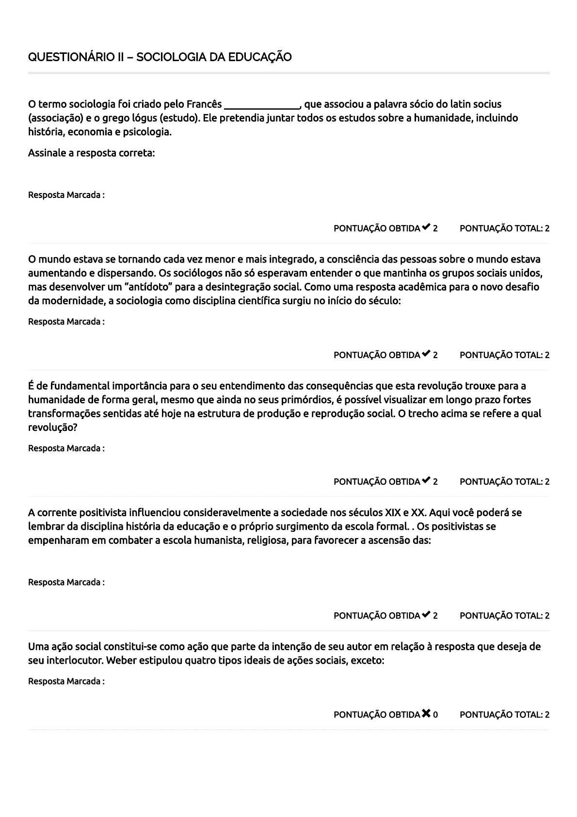 08/03/2020 Course Status – Centro Universitário Faveni https://ava.unifaveni.com.br/course-status/ 1/2 QUESTIONÁRIO II – SOCIOLOGIA DA EDUCAÇÃO PONTUAÇÃO TOTAL: 2PONTUAÇÃO OBTIDA 2 O termo sociologia foi criado pelo Francês _______________, que associou a palavra sócio do latin socius (associação) e o grego lógus (estudo). Ele pretendia juntar todos os estudos sobre a humanidade, incluindo história, economia e psicologia. Assinale a resposta correta: Resposta Marcada : Auguste Comte PONTUAÇÃO TOTAL: 2PONTUAÇÃO OBTIDA 2 O mundo estava se tornando cada vez menor e mais integrado, a consciência das pessoas sobre o mundo estava aumentando e dispersando. Os sociólogos não só esperavam entender o que mantinha os grupos sociais unidos, mas desenvolver um “antídoto” para a desintegração social. Como uma resposta acadêmica para o novo desa�o da modernidade, a sociologia como disciplina cientí�ca surgiu no início do século: Resposta Marcada : Século XIX. PONTUAÇÃO TOTAL: 2PONTUAÇÃO OBTIDA 2 É de fundamental importância para o seu entendimento das consequências que esta revolução trouxe para a humanidade de forma geral, mesmo que ainda no seus primórdios, é possível visualizar em longo prazo fortes transformações sentidas até hoje na estrutura de produção e reprodução social. O trecho acima se refere a qual revolução? Resposta Marcada : Revolução Industrial. PONTUAÇÃO TOTAL: 2PONTUAÇÃO OBTIDA 2 A corrente positivista in�uenciou consideravelmente a sociedade nos séculos XIX e XX. Aqui você poderá se lembrar da disciplina história da educação e o próprio surgimento da escola formal. . Os positivistas se empenharam em combater a escola humanista, religiosa, para favorecer a ascensão das: Resposta Marcada : Ciências exatas. PONTUAÇÃO TOTAL: 2PONTUAÇÃO OBTIDA 0 Uma ação social constitui-se como ação que parte da intenção de seu autor em relação à resposta que deseja de seu interlocutor. Weber estipulou quatro tipos ideais de ações sociais, exceto: Resposta Marcada : A ação afetiva e, ação tradicional. 08/03/2020 Course Status – Centro Universitário Faveni https://ava.unifaveni.com.br/course-status/ 2/2 16 / 20 PONTUAÇÃO TOTAL: 2PONTUAÇÃO OBTIDA 2 O único bem que o trabalhador possui devido a não ser proprietário de meios de produção é a sua força de trabalho, a sua capacidade de trabalhar, sendo por isso que o trabalhador é obrigado a vender sua força de trabalho ao capital. Ao contrário de sociedades pré-capitalistas como o feudalismo e a escravidão, no capitalismo o trabalhador entrega sua capacidade de trabalhar por um tempo determinado através de um contrato de trabalho. Qual sociólogo defendia esse pensamento? Resposta Marcada : Karl Marx. PONTUAÇÃO TOTAL: 2PONTUAÇÃO OBTIDA 2 Para Weber existem diferentes tipos ideais de educação. Pode-se apresentar os tipos ideais de educação de Max Weber da seguinte forma, exceto: Resposta Marcada : O ideal da educação não é aprender ao máximo, maximizar os resultados, mas é antes de tudo aprender a aprender, é aprender a se desenvolver e aprender a continuar a se desenvolver depois da escola. PONTUAÇÃO TOTAL: 2PONTUAÇÃO OBTIDA 2 A análise da vida cotidiana é a grande contribuição de Gilberto Freyre. Teria sido ele, então, um dos primeiros a pensar em “patrimônio imaterial”. Ele foi o precursor do conceito de patrimônio imaterial, conceito este que se concretizou com enorme sucesso. O que é patrimônio imaterial? Resposta Marcada : Todas as alternativas estão corretas. PONTUAÇÃO TOTAL: 2PONTUAÇÃO OBTIDA 0 Para Max Weber, uma ação social constitui-se como a ação que parte da intenção de seu autor em relação à resposta que deseja de seu interlocutor. Então Weber estipulou quatro tipos ideais de ações sociais: Exceto: Resposta Marcada : A ação afetiva. PONTUAÇÃO TOTAL: 2PONTUAÇÃO OBTIDA 2 O termo Globalização signi�ca internacionalização das relações econômicas, sociais e políticas capitalistas. A queda do muro de Berlin signi�cou uma ____________________e a expansão do capitalismo em que a globalização é a maior referência, ou seja, o capitalismo se expandido para todos os cantos da sociedade ocidental. Resposta Marcada : Queda do socialismo. Total