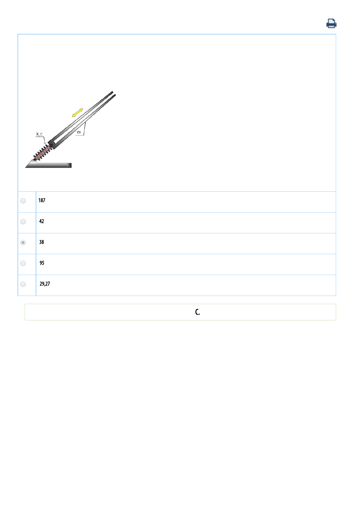 09/03/2020 Universidade Paulista - UNIP : Disciplina On-line. https://www.unip.br/presencial/central/Interna.aspx 1/1 O dispositivo ilustrado representa o cano (tubo) de um canhão com massa m = 800 kg, que pode deslizar sob ação de um sistema freio recuperador com rigidez k = 80 kN/m e amortecedor de ação simples (só age no retorno) com coe�ciente da força viscosa c. Após o disparo, o cano sofre recuo d = 1,0 m; a partir desse instante (t=0), tem início a recuperação (retorno à posição normal de tiro). Considerando que a precisão de usinagem do conjunto seja de centésimo de milímetro, a máxima cadência de tiro, ou seja o número de vezes em o cano recua de 1,0 m e retorne à sua posição de disparo, por unidade de tempo, expresso em tiro/min, é aproximadamente: A 187 B 42 C 38 D 95 E 29,27 Você já respondeu e acertou esse exercício. A resposta correta é: C.