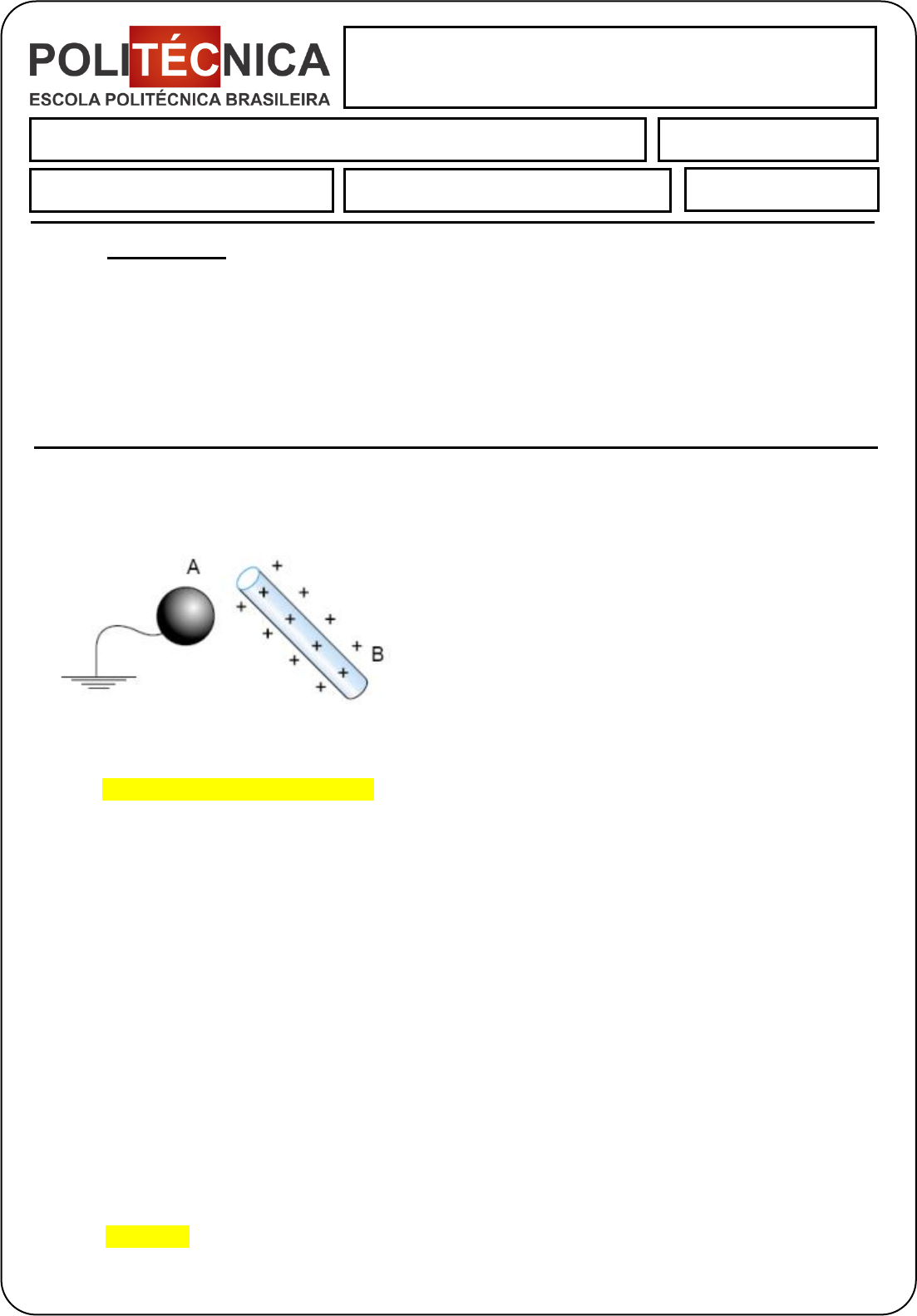 AVALIAÇÃO FINAL 1. A figura abaixo representa um condutor A, eletricamente neutro, ligado à Terra. Aproxima-se de A um corpo B carregado positivamente. Pode-se afirmar que: a) os elétrons da Terra são atraídos para A. b) os elétrons de A escoam para a Terra. c) os prótons de A escoam para a Terra. d) os prótons da Terra são atraídos para A. e) há troca de prótons e elétrons entre A e B. 2. (FGV-2005) Com respeito à eletrodinâmica, analise: I. Tomando-se a mesma carga elétrica, isolada de outra qualquer, entre os módulos do campo elétrico e do potencial elétrico em um mesmo ponto do espaço, o primeiro sofre uma diminuição mais rápida que o segundo, conforme se aumenta a distância até a carga. II. Comparativamente, a estrutura matemática do cálculo da força elétrica e da força gravitacional são idênticas. Assim como as cargas elétricas estão para as massas, o campo elétrico está para a aceleração da gravidade. III. Uma diferença entre os conceitos de campo elétrico resultante e potencial elétrico resultante é que o primeiro se obtém vetorialmente, enquanto o segundo é obtido por uma soma aritmética de escalares. É correto o contido em: a) I, apenas. b) II, apenas. c) I e III, apenas. d) II e III, apenas. e) I, II e III Revisão de Física Aluno (a): MATEUS DA SILVA Data: 09 / 03 /2020 Avaliação Final NOTA: INSTRUÇÕES: ❖ Esta Atividade contém 06 questões, totalizando 10 (dez) pontos. ❖ Você deve preencher dos dados no Cabeçalho para sua identificação o Nome / Data de entrega ❖ Utilize o espaço abaixo destinado para realizar a atividade. ❖ Ao terminar grave o arquivo com o nome Avaliação Final (nome do aluno). ❖ Só será corrigida as questões que apresentarem o desenvolvimento referente aos cálculos. ❖ Envie o arquivo pelo sistema. ❖ AVALIAÇÃO FINAL 3. (UPE) Considere a Terra como uma esfera condutora, carregada uniformemente, cuja carga total é 6,0 μC, e a distância entre o centro da Terra e um ponto P na superfície da Lua é de aproximadamente 4x108 m. A constante eletrostática no vácuo é de aproximadamente 9x109 Nm²/C². É CORRETO afirmar que a ordem de grandeza do potencial elétrico nesse ponto P, na superfície da Lua vale, em volts: a) 10-2 b) 10-4 V = K. Q c) 10-3 9 x 10 ^- 9 x 6 x 10 ^- 6 = 1, 35 x 10 ^- 4 d) 10-5 4 x 10 ^ 8 e) 10-12 4. Um resistor de 10 é ligado a uma bateria de 10 V por meio de um fio. Se o raio do fio é de 3 mm, a quantidade de carga elétrica que atravessa uma secção do fio por unidade de tempo e por unidade de área em (C/s*cm²) é aproximadamente: a) 35,40 b) 354,00 c) 3,54 d) 3540,00 e) 0,354 Fio 3mm = 3x 10^-1 cm A = pi x r² A = 0,2826 cm² I = V/ R = 10v /10 ohm = 1C/ s 1 Ampe r 1c/s = 3,53 C/s. cm² 0,2 826 cm² 5. (FATEC-SP/2012) Atualmente, a maioria das pessoas tem substituído, em suas residências, lâmpadas incandescentes por lâmpadas fluorescentes, visando a uma maior economia. Sabendo-se que a luminosidade da lâmpada fluorescente de 15 W equivale à da lâmpada incandescente de 60 W, o efeito da substituição de uma lâmpada incandescente que funcione em média 6 horas por dia por outra fluorescente será uma economia mensal, em kWh, de: a) 4,5. 60W x 6h x 30di as = 10800w = 10,8 KW/h mensal b) 10,2. 15w x 6h x 30 di as = 2700w = 2,7 KW/h mensal c) 13,5. ECONOMIA = 10, 8 – 2 7 = 8,1 KW/h mês d) 8,1. e) 15,0. 6. (UFOP-MG) O cíclotron é um acelerador em que partículas carregadas executam movimento circular em um plano perpendicular a um campo magnético uniforme de módulo B. Se o campo magnético for o único campo aplicado, a velocidade angular do movimento circular resultante depende somente da razão carga/massa e de B. Em um acelerador típico, o valor de B é de 1 tesla e as partículas percorrem uma trajetória de raio de 50 cm. AVALIAÇÃO FINAL Qual a ordem de grandeza da velocidade da partícula (dados: carga igual a 1,6*10-19C e massa igual 1,67*10-27 kg)? a) 107 m/s b) 10³ m/s c) 105 m/s d) 109 m/s e) 104 m/s B = 1 T r = 50cm = 0,5 m Q = 1, 6 x 10 ^- 19 m = 1,6 7 x 10^- 27 kg W = QB = 9,58 x 10^ 7 Velocidade = W x r V= 9,58 x 10 ^7 x 0,5 = 4,79 x 10 ^7 m /s ORDEM DE GRANDEZA = 10^7