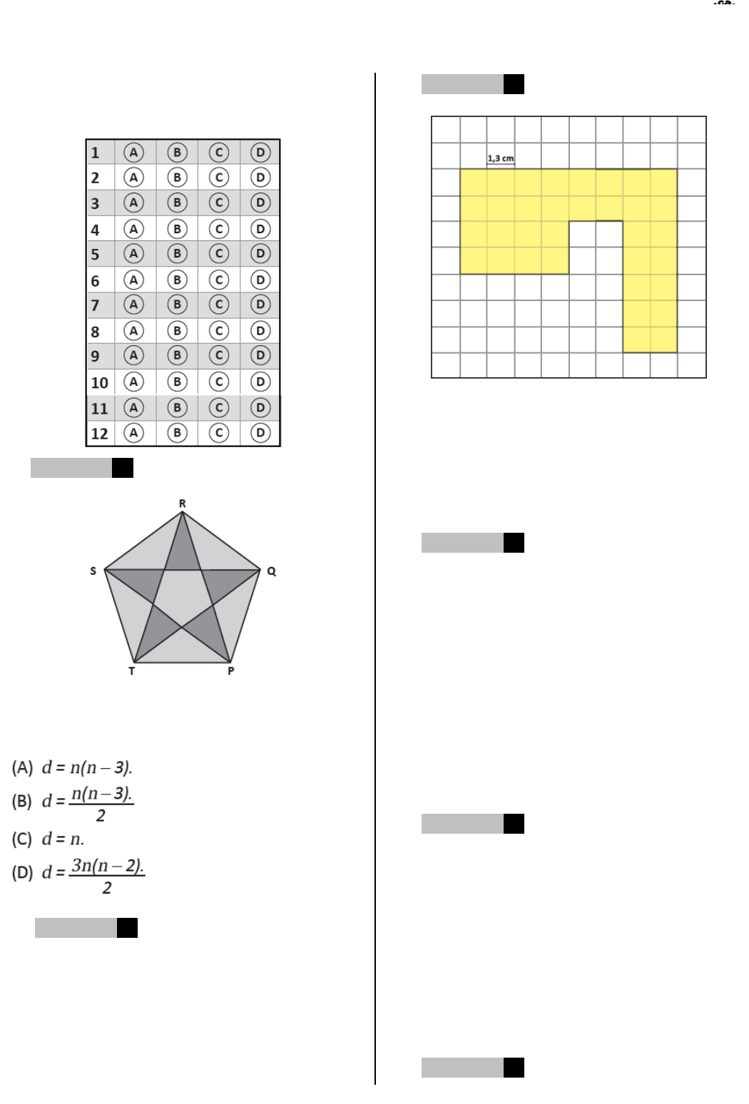 2ª Prova Diagnóstica – 2019 – 8º Ano SEDUCE-GO – Matemática ESCOLA: ________________________ Prof.:____________________________ Nome: ___________________________ D8 Questão 1 –––––––––––––––––––––––––––◊ Observe a figura a seguir: Considere d como o número de diagonais e n o número de lados. Assinale a opção que representa a fórmula para o cálculo do número de diagonais do polígono PQRST. D28 Questão 2 –––––––––––––––––––––––––––◊ Uma calça jeans foi vendida com 20% de desconto. Esse desconto equivale a R$ 30,00. Assinale a opção que corresponde ao valor total dessa calça. (A) R$ 10. (B) R$ 50. (C) R$ 60. (D) R$ 150. D12 Questão 3 –––––––––––––––––––––––––––◊ Observe o polígono na malha quadriculada a seguir: O perímetro deste polígono representado na figura é igual a (A) 34 cm. (B) 34 cm². (C) 44,2 cm. (D) 44,2 cm². D29 Questão 4 –––––––––––––––––––––––––––◊ Um motociclista, com velocidade média de 40km/h, vai de uma cidade a outra em 2h. Se a velocidade média fosse de 80km/h, o tempo que iria gastar para fazer o mesmo trajeto seria de 1h. Segundo essas informações, a velocidade e o tempo (A) não são proporcionais. (B) são grandezas diretamente proporcionais. (C) são grandezas inversamente proporcionais. (D) não são grandezas. D28 Questão 5 –––––––––––––––––––––––––––◊ Alexandra comprou um televisor com 15% de desconto. Sabe-se que este televisor custava R$ 2 500. O valor do desconto que Alexandra teve foi de (A) R$ 37,50. (B) R$ 375. (C) R$ 1 500. (D) R$ 2 125. D13 Questão 6 –––––––––––––––––––––––––––◊ Observe a figura a seguir: Essa figura é composta por um retângulo e um triângulo isósceles. A fórmula que representa o cálculo da área desse polígono é igual a D29 Questão 7 –––––––––––––––––––––––––––◊ Um carro gasta 40 minutos da cidade A até a cidade B com uma velocidade média de 80 km/h. Com uma velocidade média de 50 km/h, o tempo gasto neste mesmo percurso é igual a (A) 10 minutos. (B) 25 minutos. (C) 30 minutos. (D) 64 minutos. D8 Questão 8 –––––––––––––––––––––––––––◊ Alan construiu todas as diagonais do polígono a seguir: O número de diagonais desse polígono é igual a (A) 8. (B) 20. (C) 40. (D) 52. D29 Questão 9 –––––––––––––––––––––––––––◊ Os números x, y e 32 são diretamente proporcionais, nessa ordem, aos números escritos na lousa a seguir. Os valores de x e y são respectivamente iguais a (A) 10 e 18. (B) 8 e 40. (C) 40 e 288. (D) 88 e 96. D28 Questão 10 –––––––––––––––––––––––––◊ Observe o anúncio a seguir: O preço desse skate à vista é um valor (A) maior que R$ 88. (B) entre R$ 75 e R$ 79. (C) entre R$ 71 e R$ 75. (D) menor que R$ 71. D12 Questão 11 –––––––––––––––––––––––––◊ A figura a seguir é composta por quadrados. Assinale a opção que representa o perímetro dessa figura. (A) 50 cm (B) 52,5 cm (C) 56,25 cm (D) 70 cm D13 Questão 12 –––––––––––––––––––––––––◊ Um terreno foi dividido em quatro partes, como mostra a figura a seguir. Sabe-se que a área destinada à casa e ao churrasco são quadrados de lados medindo 10m e 5m, respectivamente. A área total desse terreno é igual a (A) 60 m². (B) 125 m². (C) 150 m². (D) 225 m². 3