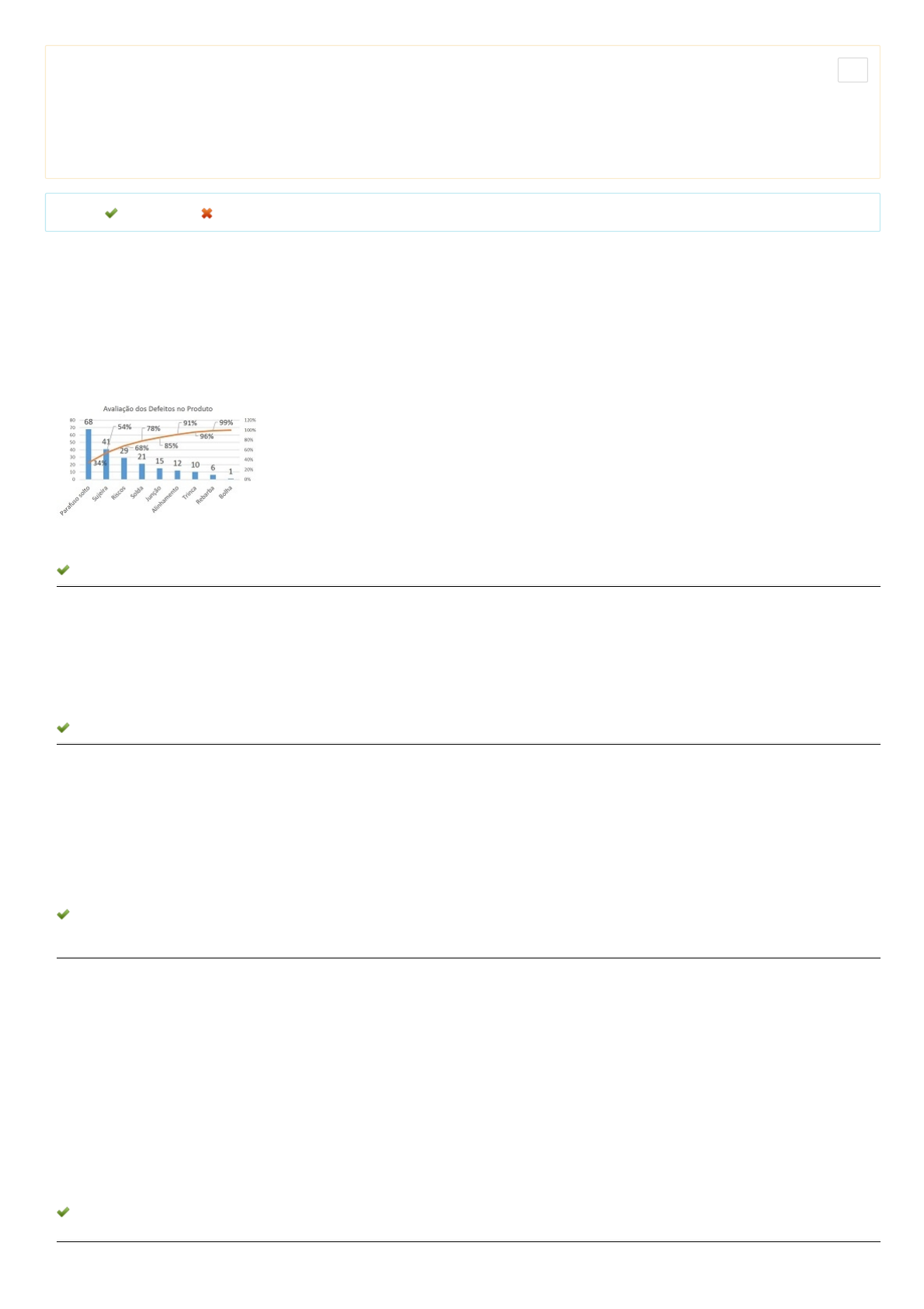 11/03/2020 UNIASSELVI - Centro Universitário Leonardo Da Vinci - Portal do Aluno - Portal do Aluno - Grupo UNIASSELVI https://portaldoalunoead.uniasselvi.com.br/ava/avaliacao/avaliacao_lista.php 1/3 Acadêmico: Gislaine Cassia Barbosa (1189058) Disciplina: Gestão da Qualidade de Produtos e Processos (EPR10) Avaliação: Avaliação I - Individual FLEX ( Cod.:455740) ( peso.:1,50) Prova: 14001389 Nota da Prova: 9,00 Legenda: Resposta Certa Sua Resposta Errada 1. Uma das formas de estratificar os problemas identificando os mais importantes e os menos importantes é por meio da análise de Pareto. Este método foi aplicado na área da qualida Juran. Este pesquisador conseguiu demonstrar que poucos problemas são vitais, diferenciando-os dos muitos que são triviais. Com base no gráfico apresentado, analise as afirmati I- Para os problemas investigados, o mais adequado seria priorizar os defeitos parafuso solto e em seguida sujeira, pois reduzem 54% das não conformidades. II- Somados as não conformidades sujeira e riscos totalizam 70 defeitos, maior que parafuso solto com 68 defeitos, portanto, devem ser analisados e resolvidos por primeiro. III- Não existe possibilidade de priorizar as não conformidades, pois as quantidades de defeitos são proporcionais entre si, por isso devem ser resolvidos conjuntamente. IV- Através da aplicação de Pareto, é admissível averiguar a quantidade de defeitos por não conformidade do produto e o seu percentual acumulado. Assinale a alternativa CORRETA: FONTE: SOUZA, Felipe Pires de. Engenharia da Qualidade. Centro Universitário Leonardo da Vinci - Indaial: Grupo UNIASSELVI, 2010. a) As afirmativas III e IV estão corretas. b) As afirmativas I e II estão corretas. c) As afirmativas I, II e IV estão corretas. d) As afirmativas I e IV estão corretas. 2. De acordo com Calarge e Davanso (2004), o erro humano constitui um objeto de grande preocupação nos processos de fabricação, pois afeta desde a concepção dos sistemas pro parte operacional. Tendo como base essa observação, é interessante e importante a criação e utilização de dispositivos à prova de erros, o que envolve a aplicação da técnica Poka dos gurus da qualidade foi o responsável pela criação desse método? FONTE: CALARGE, F. A. et. al. Conceito de Dispositivo à Prova de Erros Utilizados na Meta do Zero Defeito em Processos de Manufatura. Revista de Ciência e Tecnologia. Piracica 21, p. 7-18, Abr. 2004. a) Josepf Juran. b) Kaoru Ishikawa. c) Willian Deming. d) Shigeo Shingo. 3. O controle de processo é exercido por meio do Ciclo PDCA, que é um método utilizado para promover a melhoria contínua através de quatro etapas sequenciais: Planejar, Executar Atuar Corretivamente. Sua finalidade principal é facilitar a análise dos processos de gestão da empresa, buscando torná-los mais claros e objetivos, alcançando melhoria nos resulta sistema de gestão do negócio. Analise as quatro etapas de um processo de melhoria: I- Confrontar os resultados obtidos com as metas estabelecidas; essencial o treinamento no trabalho, decorrente da fase de planejamento. II- Definir a meta e os métodos a serem aplicados; estabelecer a melhor forma de alcançar as metas; fase de estabelecer as diretrizes. III- Corrigir, prevenir ou melhorar, após detectados os desvios, agir no sentido de fazer as correções definitivas, de tal modo que o problema não volte mais a acontecer. IV- Treinar colaboradores, executar a tarefa e coletar dados; a partir dos dados coletados, compara-se o resultado alcançado com a meta planejada. Agora, assinale a alternativa CORRETA que apresenta a sequência do ciclo PDCA: a) I - II - III - IV. b) II - IV - I - III. c) III - I - IV - II. d) IV - III - II - I. 4. O método PDCA pode ser utilizado com elemento base para a melhoria dos processos, tendo elementos apoiadores das ferramentas da qualidade como gráfico de pareto, diagrama efeito, 5W2H, entre outros. Todas essas ferramentas em conjunto com o PDCA possibilitam que as soluções dos problemas sejam organizadas e ordenadas de forma lógica. A aplic PDCA é baseada em quatro etapas que proporcionam sua própria denominação, isto é, "P-D-C-A". Sobre as etapas e suas características, associe os itens, utilizando o código a se I- (Plan) Planejar. II- (Do) Executar. III- (Check) Checar. IV- (Action) Padronizar. ( ) Com a eliminação das principais causas das não conformidades, são desenvolvidos padrões para sustentar as melhorias. ( ) Constitui em aplicar o plano de ações e obter os dados para serem avaliados. ( ) São analisadas as soluções e as modificações de processo provenientes das ações realizadas por meio de relatórios. ( ) São definidas as metas e avaliados os dados e aspectos associados com as não conformidades. Assinale a alternativa que apresenta a sequência CORRETA: a) III - II - I - IV. b) II - IV - I - III. c) IV - II - III - I. d) III - I - IV - II. 11/03/2020 UNIASSELVI - Centro Universitário Leonardo Da Vinci - Portal do Aluno - Portal do Aluno - Grupo UNIASSELVI https://portaldoalunoead.uniasselvi.com.br/ava/avaliacao/avaliacao_lista.php 2/3 5. A definição de qualidade compreende as características de um produto que satisfaçam às necessidades de um cliente e que promovam os resultados esperados. Logo, alta qualidad geralmente, maiores custos; através de uma análise de custos, a qualidade é a ausência de defeitos ou erros de fabricação. É muito importante para qualquer organização buscar constantemente a satisfação dos clientes, através da melhoria contínua nos seus processos para que resultem em um produto e/ou um serviço que satisfaça às necessidades do co Sobre os principais benefícios da qualidade, analise as sentenças a seguir: I- Aumento da satisfação dos clientes, através da melhoria nos seus processos e, como consequência, nos produtos. II- Diminuir o índice de erros e retrabalho. III- Planejar a qualidade envolve identificar as ne