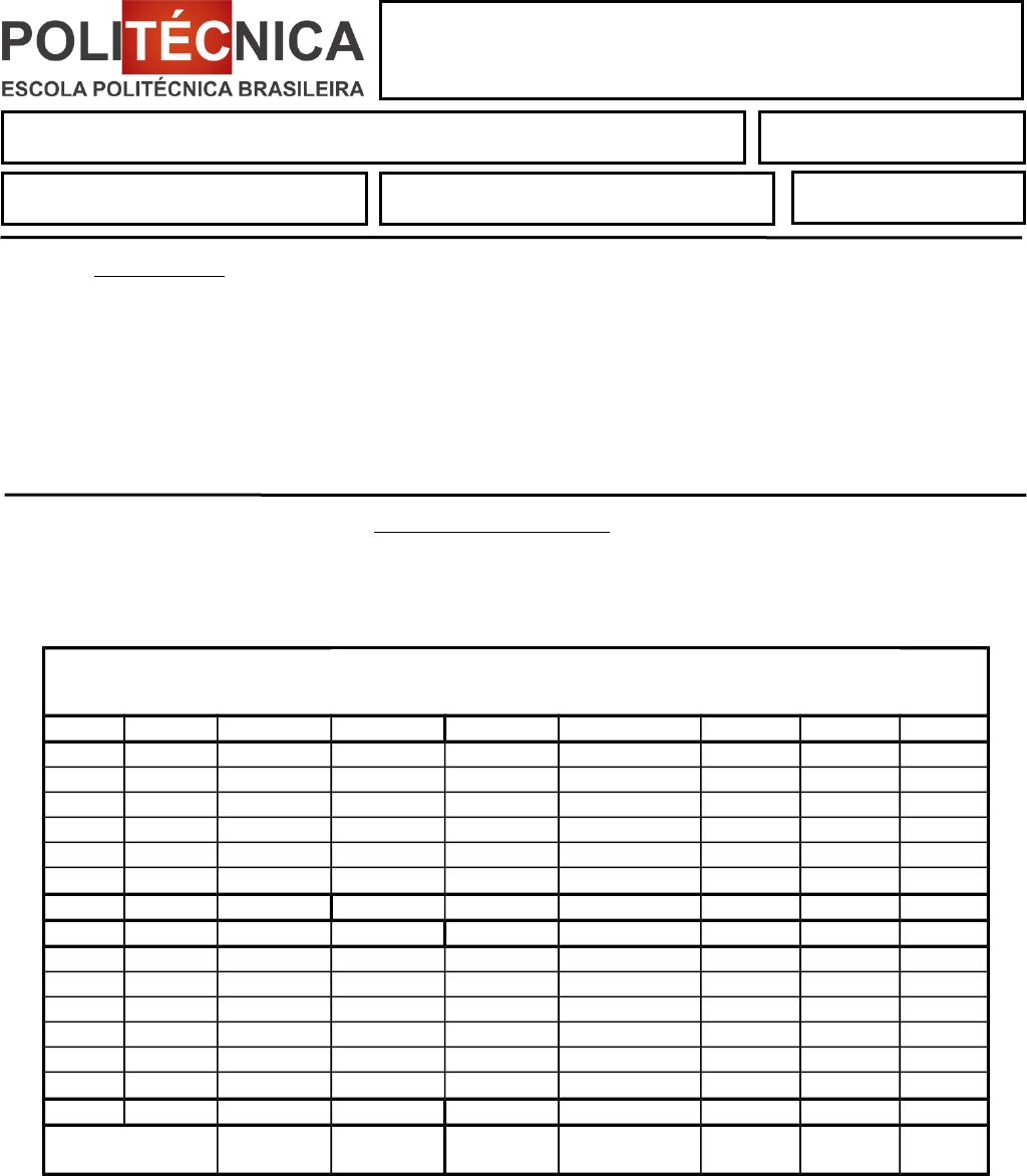 EXERCÍCIOS EXCEL 1. Elaborar o que se pede nesta atividade utilizando o Excel, fazendo-se o que se pede: Empresa Nacional S/A Código Produto Jan Fev Mar Total 1º Trim. Máximo Mínimo Média 1 Porca 4.500,00 5.040,00 5.696,00 2 Parafuso 6.250,00 7.000,00 7.910,00 3 Arruela 3.300,00 3.696,00 4.176,00 4 Prego 8.000,00 8.690,00 10.125,00 5 Alicate 4.557,00 5.104,00 5.676,00 6 Martelo 3.260,00 3.640,00 4.113,00 Totais Código Produto Abr Mai Jun Total 2º Trim. Máximo Mínimo Média 1 Porca 6.265,00 6.954,00 7.858,00 2 Parafuso 8.701,00 9.658,00 10.197,00 3 Arruela 4.569,00 5.099,00 5.769,00 4 Prego 12.341,00 12.365,00 13.969,00 5 Alicate 6.344,00 7.042,00 7.957,00 6 Martelo 4.525,00 5.022,00 5.671,00 Totais Total do Semestre FÓRMULAS: 1ª Tabela: Total 1º Trimestre: soma das vendas dos meses de Jan / Fev / Mar. Máximo: calcular o maior valor entre os meses de Jan / Fev / Mar. Mínimo: calcular o menor valor entre os meses de Jan / Fev / Mar. Média: calcular a média dos valores entre os meses de Jan / Fev / Mar. 2ª Tabela: Total 2º Trimestre: soma das vendas dos meses de Abr / Mai / Jun. Máximo: calcular o maior valor entre os meses de Abr / Mai / Jun. Mínimo: calcular o menor valor entre os meses de Abr / Mai / Jun. Média: calcular a média dos valores entre os meses de Abr / Mai / Jun. Totais: soma das colunas de cada mês (1ª e 2ª tabela). Total do Semestre: soma dos totais de cada trimestre. 2. Elaborar a planilha abaixo, fazendo-se o que se pede: CONTAS A PAGAR JANEIRO FEVEREIRO MARÇO ABRIL MAIO JUNHO SALÁRIO R$ 500,00 R$ 750,00 R$ 800,00 R$ 700,00 R$ 654,00 R$ 700,00 CONTAS ÁGUA R$ 10,00 R$ 15,00 R$ 15,00 R$ 12,00 R$ 12,00 R$ 11,00 LUZ R$ 50,00 R$ 60,00 R$ 54,00 R$ 55,00 R$ 54,00 R$ 56,00 ESCOLA R$ 300,00 R$ 250,00 R$ 300,00 R$ 300,00 R$ 200,00 R$ 200,00 IPTU R$ 40,00 R$ 40,00 R$ 40,00 R$ 40,00 R$ 40,00 R$ 40,00 IPVA R$ 10,00 R$ 15,00 R$ 14,00 R$ 15,00 R$ 20,00 R$ 31,00 SHOPPING R$ 120,00 R$ 150,00 R$ 130,00 R$ 200,00 R$ 150,00 R$ 190,00 COMBUSTÍVEL R$ 50,00 R$ 60,00 R$ 65,00 R$ 70,00 R$ 65,00 R$ 85,00 ACADEMIA R$ 145,00 R$ 145,00 R$ 145,00 R$ 145,00 R$ 100,00 R$ 145,00 TOTAL DE CONTAS SALDO FÓRMULAS: Total de Contas: soma das contas de cada mês. Saldo: Salário menos Total de Contas. 3. Elaborar as planilhas abaixo, fazendo-se o que se pede: Araras Informática - Hardware e Software Rua São Francisco de Assis, 123 – Resende - RJ Nº NOME Salário Bruto INSS Gratificação INSS R$ Gratificação R$ Salário Líquido 1 Eduardo R$ 853,00 10,00% 9,00% 2 Maria R$ 951,00 9,99% 8,00% 3 Helena R$ 456,00 8,64% 6,00% 4 Gabriela R$ 500,00 8,50% 6,00% 5 Edson R$ 850,00 8,99% 7,00% 6 Elisangela R$ 459,00 6,25% 5,00% 7 Regina R$ 478,00 7,12% 5,00% 8 Paulo R$ 658,00 5,99% 4,00% FÓRMULAS INSS R$: multiplicar Salário Bruto por INSS. Gratificação R$: multiplicar Salário Bruto por Gratificação. Salário Líquido: Salário Bruto mais Gratificação R$ menos INSS R$. Formatar os números para que eles apareçam de acordo com a planilha dada. 4. Elaborar as planilhas abaixo, fazendo-se o que se pede: Valor do Dólar R$ 2,94 Papelaria Papel Branco Produtos Qtde Preço Unit. Total R$ Total US$ Caneta Azul 500 R$ 0,15 Caneta Vermelha 750 R$ 0,15 Caderno 250 R$ 10,00 Régua 310 R$ 0,50 Lápis 500 R$ 0,10 Papel Sulfite 1500 R$ 2,50 Tinta Nanquim 190 R$ 6,00 FÓRMULAS: Total R$: multiplicar Qtde por Preço Unitário Total US$: dividir Total R$ por Valor do Dólar – usar $ nas fórmulas Alterar as colunas de acordo com a necessidade. 5. Elaborar a planilha abaixo, fazendo-se o que se pede: Projeção para o ano de 2010 Receita bruta Jan-Mar Abr-Jun Jul-Set Out-Dez Total do Ano 140.000,00 185.000,00 204.100,00 240.000,00 Despesa Líquida Jan-Mar Abr-Jun Jul-Set Out-Dez Total do Ano Salários 20.000,00 26.000,00 33.800,00 43.940,00 Juros 20.000,00 15.600,00 20.280,00 26.364,00 Aluguel 12.000,00 20.930,00 27.209,00 35.371,70 Propaganda 16.100,00 28.870,00 33.631,00 43.720,30 Suprimentos 19.900,00 39.000,00 50.700,00 65.910,00 Diversos 25.000,00 32.500,00 42.250,00 54.925,00 Total do Trim. Receita líquida Situação Valor Acumulado do ano de despesas FÓRMULAS: Total do Ano Receita Bruta: Soma das receitas anuais. Total do Ano Despesa Líquida: Soma das despesas anuais. Total do Trimestre: Soma das despesas trimestrais. Receita Líquida: Receita Bruta menos Total do Trimestre. Valor Acumulado do ano de despesas: Soma do Total do Ano de Despesas Situação: Se Receita Líquida for menor que R$ 1.000,00, "Prejuízo Total"; Se Receita Líquida for menor que R$ 5.000,00, "Lucro Médio"; Se Receita Líquida for maior que R$ 5.000,00, "Lucro Total'. Excel - CT Aluno (a): Data: / / Atividade 01 NOTA: INSTRUÇÕES: Esta Atividade contém 05 questões, totalizando 10 (dez) pontos. Você deve preencher dos dados no Cabeçalho para sua identificação Nome / Data de entrega Utilize o espaço abaixo destinado para realizar a atividade. Ao terminar grave o arquivo com o nome Atividade 01 (nome do aluno). Envie o arquivo pelo sistema.