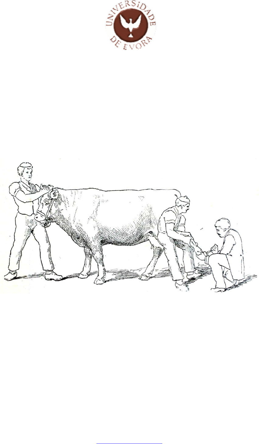 I CURSO DE PODOLOGIA BOVINA DA UNIVERSIDADE DE ÉVORA 5, 6 e 7 de Maio de 2006 HOSPITAL VETERINÁRIO DA UNIVERSIDADE DE ÉVORA ANATOMIA DA EXTREMIDADE DISTAL DOS BOVINOS RICARDO ROMÃO Departamento de Zootecnia Pólo da Mitra – Apartado 94, 7000-093 Évora rjromao@uevora.pt (Lagny et Gobert, 1902) Anatomia da extremidade distal dos bovinos I CURSO DE PODOLOGIA BOVINA DA UNIVERSIDADE DE ÉVORA ©RR MAIO 2006 1 ÍNDICE 1. Introdução.......................................................................................... 2 2. Nomenclatura exterior.......................................................................... 2 3. Osteologia .......................................................................................... 4 3.1. Metacarpo/metatarso........................................................................ 4 3.2. Dedo .............................................................................................. 5 3.2.1. Falange proximal ....................................................................... 5 3.2.2. Falange intermédia .................................................................... 5 3.2.3. Falange distal............................................................................ 5 3.2.4. Ossos sesamóides ..................................................................... 6 4. Articulações ........................................................................................ 7 5. Músculos ...........................................................................................11 6. Tegumento comum.............................................................................18 6.1. Casco ............................................................................................18 6.2. Derme ...........................................................................................19 6.3. Toro ungular...................................................................................20 7. Vascularização ...................................................................................21 7.1. Artérias..........................................................................................21 7.1.1. Membro torácico.......................................................................21 7.1.2. Membro pélvico ........................................................................22 7.2. Veias .............................................................................................23 7.2.1. Membro torácico.......................................................................23 7.2.2. Membro pélvico ........................................................................23 7.3. Linfáticos .......................................................................................24 8. Inervação ..........................................................................................25 8.1. Membro torácico .............................................................................25 8.2. Membro pélvico...............................................................................25 9. Bibliografia ........................................................................................27 Anatomia da extremidade distal dos bovinos I CURSO DE PODOLOGIA BOVINA DA UNIVERSIDADE DE ÉVORA ©RR MAIO 2006 2 1. Introdução O presente texto serve de apoio ao curso prático de podologia bovina e, por essa razão encontra-se estruturado essencialmente para uma sistematização da respectiva nomenclatura anatómica pelo que, para aprofundamento de alguns assuntos mais específicos, se recomenda uma leitura detalhada dos textos indicados na bibliografia. Abordaremos sobretudo a anatomia que interessa mais ao autopódio pelo que serão referidas essencialmente as estruturas anatómicas desta região ou, se extrínsecas, que terminem na mesma. No âmbito da podologia bovina muitas vezes são utilizados termos que descrevem o exterior pelo que serão muito sucintamente referidos antes dos demais. Os bovinos incluem-se na Ordem Artiodactila formada pelos ungulados que apresentam número par de dedos, que assentam no solo por intermédio de uma úngula ou casco. 2. Nomenclatura exterior Quer se trate do membro torácico quer do membro pélvico as porções distais quer ao carpo quer ao tarso possuem uma estrutura semelhante pelo que se utilizam as mesmas designações nas duas extremidades (Figura 1). CANELA: tem por base óssea o metacarpo ou o metatarso, designando-se por tendão a porção caudal onde passam os tendões dos músculos flexores dos dedos. A canela do membro anterior é mais curta que a do membro posterior. BOLETO: continua a canela. A face anterior chama-se dobra ou prega e a face posterior tem duas pequenas unhas correspondentes aos vestígios de dedos rudimentares (Figura 3 e 4). QUARTELA, TRAVADOURO ou MIUDO: está no prolongamento do boleto. Na face posterior situa-se a prega ou dobra da Figura 1: Regiões comuns dos membros nos bovinos. canela boleto quartela coroa unha ou casco Anatomia da extremidade distal dos bovinos I CURSO DE PODOLOGIA BOVINA DA UNIVERSIDADE DE ÉVORA ©RR MAIO 2006 3 quartela. Nos bovídeos é curta e grossa. COROA: Separa a quartela das unhas, sendo dupla em cada membro. UNHAS: Estes animais são ungulados, apresentando duas unhas ou úngulas principais em cada membro. Existem ainda em cada membro duas unhas rudimentares que se projectam caudalmente a nível da articulação metacarpo(metatarso)-falângica e que normalmente não chegam a alcançar o solo (Figura 3 e 3’). As unhas principais podem ser pretas, brancas, vermelhas ou castanhas; nos animais malhados têm por vezes mais que uma cor (Figura 3) A porção anterior designa-se por pinça e a porção posterior por talão. São formadas por três regiões: Taipa, parede, cinta ou muralha – forma a parede da unha, convexa abaxialmente e ligeiramente côncava axialmente. Palma ou sola – a face que assenta no solo (Figura 2). Ranilha, arnilha,