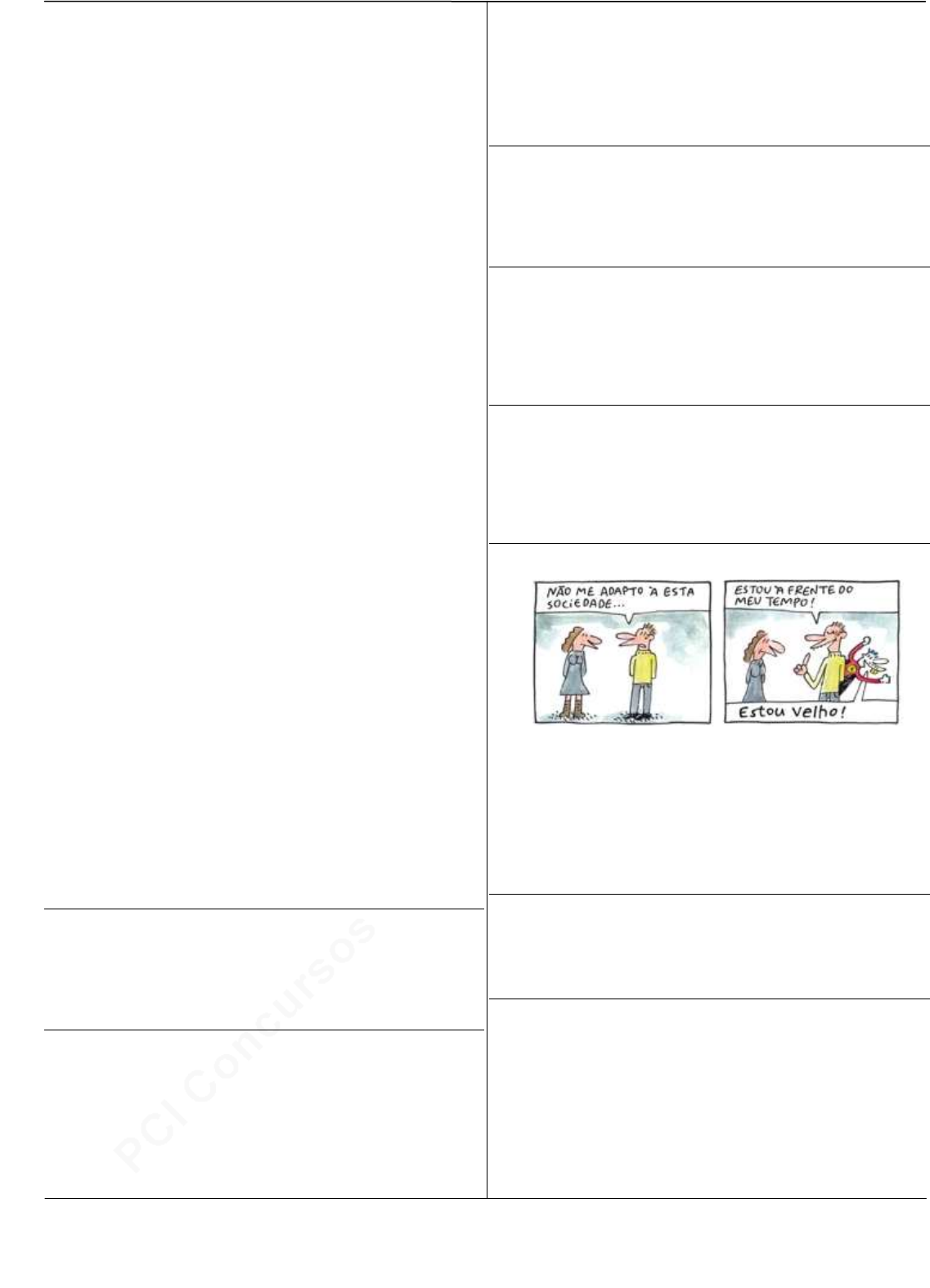 pcimarkpci MDAwMDowMDAwOjAwMDA6MDAwMDowMDAwOmZmZmY6YmQzNzpjMmIz:RnJpLCAyMSBGZWIgMjAyMCAxNDo0NDo0MCAtMDMwMA== Instituto Mais – Prefeitura de Santana de Parnaíba – 704 – Técnico em Enfermagem. LÍNGUA PORTUGUESA Leia o texto abaixo para responder às questões de 1 a 7. Uma parede no fundo Entro na farmácia e peço um remédio. A moça do balcão nem vacila. Volta-se para um computador à sua frente, digita o nome do produto e me informa: "A importação desse medicamento foi descontinuada". Foi interrompida, ela quis dizer. Des + continuar = interromper. Não é uma sorte que alguns de seus clientes saibam um pouco de português? Um dos ambientes mais desagradáveis hoje no Brasil são as farmácias. Quando se entra numa, atravessam-se longos corredores formados por estandes, os quais exibem fartas opções de xampus, sabonetes, desodorantes. Os outros setores são igualmente bem servidos. O de preservativos oferece camisinhas de todos os tipos, cores e tamanhos. Os bochechos bucais vêm em embalagens que permitem a um cidadão passar seis meses gargarejando sem parar um segundo. Mas nada supera o estoque de fraldas descartáveis - haja bebês para ensopar aquilo tudo. Tudo isso é formidável, exceto que o setor de remédios resume-se a uma parede no fundo da farmácia, e, em 90% dos casos, está desabastecido do medicamento que você procura. Não precisa ser algo complicado, como um dentifrício especial para boca seca, um anticonvulsivante que exige receita médica ou uma pomada para hemorroidas. Remédios muito mais simples, de fabricação nacional, vivem em falta. É lógico - não há capital que chegue para manter em dia o sortimento de fraldas. Na Europa, as farmácias ainda são lugares estreitos e largos, com três paredes de prateleiras de mogno cheias de caixinhas coloridas e, à frente delas, um senhor de branco, com os cabelos talvez idem e um jeito de quem conhece a fragilidade humana - o farmacêutico. No Brasil, as farmácias têm um visual de supermercado, inclusive nas fachadas, e empregados que parecem ter sido recrutados no McDonald's. Ruy Castro – Folha de S.Paulo – 12/9/12 1. De acordo com o texto, a vantagem em ser bom de português ao fazer um pedido em uma farmácia é a de (A) não passar vergonha diante do atendente. (B) decodificar o significado das palavras difíceis usadas pelos atendentes. (C) conseguir ler a bula sem a necessidade de pedir qualquer informação extra ao atendente. (D) contestar a informação que vem do computador do atendente. 2. Uma farmácia hoje é desagradável, segundo o autor, porque (A) o setor de remédios se resume a uma única parede. (B) só há fraldas e xampus, dos mais diversos modelos. (C) é muito difícil pedir qualquer tipo de informação. (D) é um lugar estreito, apertado e cheio de remédios. 3. O texto afirma que o setor mais bem servido de uma farmácia é o de (A) remédios. (B) xampus. (C) bochechos bucais. (D) fraldas. 4. Uma das ideias do texto é a de que o farmacêutico que hoje trabalha em uma farmácia passou a (A) assumir uma função automatizada. (B) ganhar um visual de supermercado. (C) manter a imagem ultrapassada do senhor de idade. (D) ser visto como incapaz de informar dúvidas básicas. 5. O autor nos informa que “descontinuar” significa também “interromper”. Um outro sinônimo para esses termos é (A) consentir. (B) desimpedir. (C) deter. (D) romper. 6. No terceiro parágrafo, o autor usa a palavra “exceto”. Assinale a alternativa em que o som de S também esteja corretamente grafado. (A) Ceção. (B) Excêntrico. (C) Submição. (D) Retenssão. 7. No último parágrafo, lê-se que “No Brasil, as farmácias têm um visual de supermercado”. Assinale a alternativa em que o verbo esteja também conjugado corretamente. (A) Meu pai vêm de uma família muito tradicional. (B) João disse que ele têm mais de dez brinquedos. (C) Os mercados aqui não tem remédios para vender. (D) Essas pedras vêm de longe. Leia a tirinha abaixo para responder às questões de 8 a 10. Adão – Mundo Monstro – Folha de S.Paulo – 12/9/12 8. O fato de o personagem não se adaptar à sociedade está ligado à informação de que ele (A) tem um outro personagem que fala por si. (B) está à frente de seu tempo. (C) não consegue se comunicar. (D) precisa ficar se explicando sempre. 9. O super-herói interrompe a fala do personagem para (A) dizer que ele (super-herói) é mais velho que o outro. (B) caçoar do discurso contido do personagem. (C) comparar a idade de todos os personagens. (D) inventar uma mentira sobre o personagem. 10. Há um erro gramatical nessa tirinha. Identifique-o. (A) A crase no primeiro quadro. (B) A crase no segundo quadro. (C) A conjugação do verbo “adaptar”. (D) O erro ortográfico em “sociedade”. www.pciconcursos.com.br pcimarkpci MDAwMDowMDAwOjAwMDA6MDAwMDowMDAwOmZmZmY6YmQzNzpjMmIz:RnJpLCAyMSBGZWIgMjAyMCAxNDo0NDo0MCAtMDMwMA== 3 Instituto Mais – Prefeitura de Santana de Parnaíba – 704 – Técnico em Enfermagem. MATEMÁTICA 11. Uma esfera tem um diâmetro de 30 pés. Sabe-se que um pé é igual a 12 polegadas e cada polegada corresponde a aproximadamente 25,4 mm. Se a esfera expandir o seu diâmetro para 36 pés, o aumento aproximado do volume dessa esfera expandida, em relação à esfera original com 30 pés de diâmetro, será de (A) 3,14% (B) 20% (C) 73% (D) 44% 12. O motorista de um automóvel vindo por uma rua de mão única a uma velocidade de 60 Km/h é surpreendido por uma moto que entra nessa rua na contramão a uma velocidade de 80 Km/h. Sendo a distância entre ambos de 30 metros, o tempo aproximado até a colisão se os freios não forem acionados será (A) menos de 1 segundo. (B) mais de 1 até 2 segundos. (C) mais de 2 até 5 segundos. (D) mais de 5 segundos. 13. O comprimento de um retângulo é igual ao dobro de sua largura e a sua área é igual a 450 cm2. Quais são os valores, em cm, do comprimento e da largura desse retângulo