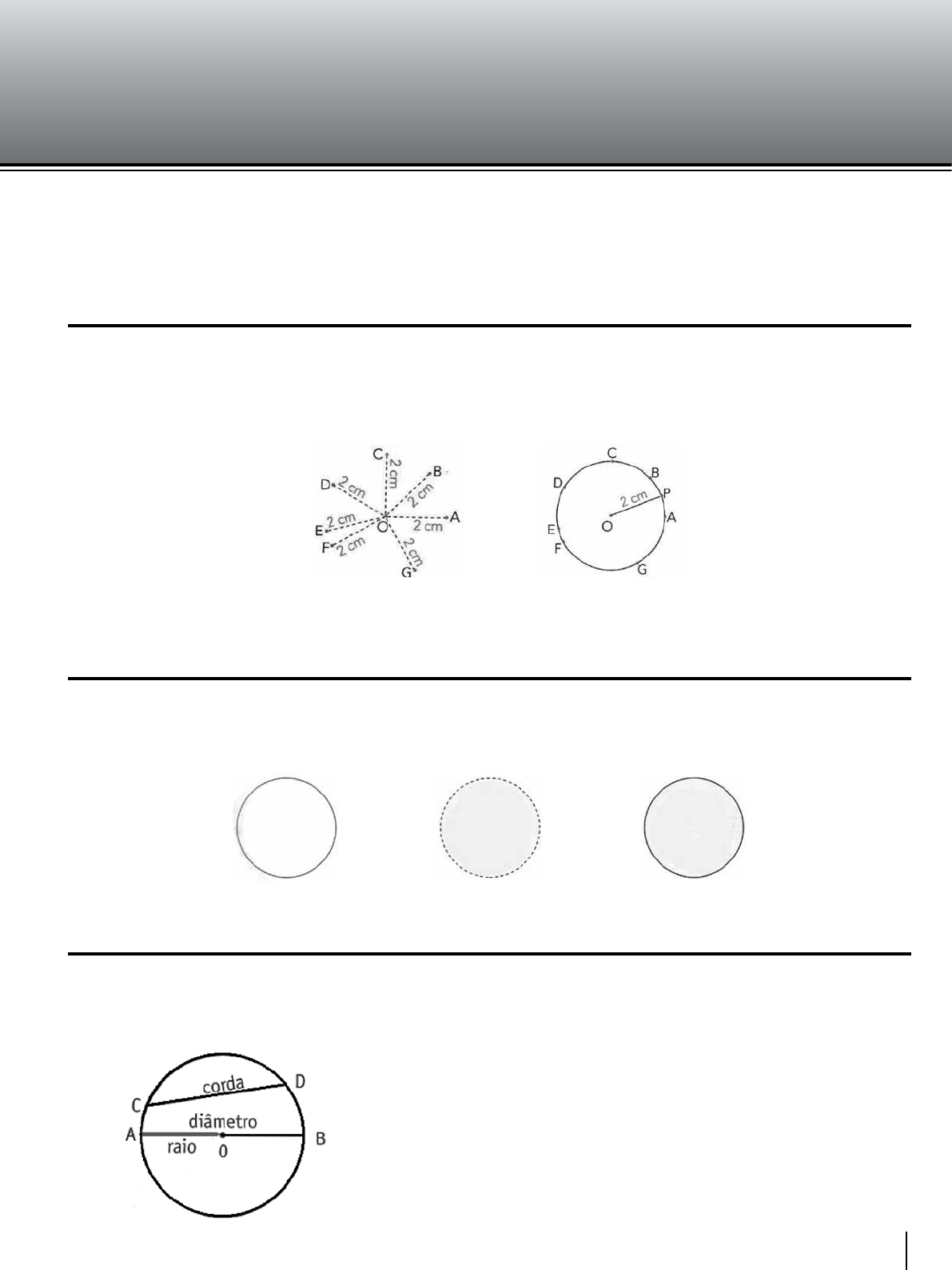 133V. 18 Matemática IIMatemática II Módulo 5 A CirCunferênCiA e o CírCulo A CirCunferênCiA Circunferência é o conjunto de pontos de um plano que estão a uma dada distância constante de um ponto fixo do plano chamado centro. Observe: Se considerarmos todos os pontos que estão a 2 cm do ponto O, eles vão formar uma curva chamada circunferência. A distância de O até um ponto P da circunferência é o raio. CírCulo Círculo á a reunião de uma circunferência e seu interior. Observe as figuras: Circunferência Conjunto dos pontos internos à circunferência (interior) Círculo elementos dA CirCunferênCiA Veja alguns elementos da circunferência e do círculo: • Raio é o segmento que une o centro a qualquer ponto da cir- cunferência. • Corda é o segmento cujas extremidades pertencem à circun- ferência. • Diâmetro é a corda que passa pelo centro da circunferência. Importante: O diâmetro mede o dobro do raio. 134 M AT EM ÁT IC A II 8º Ano Fundamental 4º Bimestre Posições relAtivAs de umA retA e umA CirCunferênCiA Veja as posições relativas de uma reta e uma circunferência: A reta e é externa à circunferência (não há ponto comum). A reta t é tangente à circunferência (um ponto comum). A reta s é secante à circunferência (dois pontos comuns). Propriedade Toda reta Tangente a uma circunferência é per- pendicular ao raio no ponto de tangência. Posições relAtivAs de duAs CirCunferênCiAs • Secantes, quando têm dois pontos comuns. • Tangentes, quando tem um ponto só em comum. Circunferências tangentes podem ser: Tangentes exteriores: Quando a distância entre os centros e igual à soma das medidas dos raios. Tangentes interiores: Quando a distância entre os centros e igual à diferença das medidas dos raios. d = r1 – r2 • Externas, quando não tem ponto em comum e a distância entre os seus centros é maior que a soma das medidas de seus raios; d > r1 + r2 135 M ATEM ÁTICA II 8º Ano Fundamental4º Bimestre Exemplos: a) Como PA = PB, temos: x = 21 cm b) Como a = 4 e b = 6 temos: X = 4 + 6 X = 10 Em todo quadrilátero circunscrito a uma circun- ferência as somas das medidas dos lados opos- tos são iguais. Observe: AB + CD AB + CD = + + + + = + + + = + a b c d BC AD b c a d Logo BC AD: Exemplo: 13 + x = 17 + 12 x = 17 + 12 – 13 x = 16 • Internas, quando não tem ponto em comum e a distância entre os seus centros é menor que a diferença das medidas de seus raios; d < r1 – r2 • concêntricas, é aquela em que as circunferên- cias têm o mesmo centro. ProPriedAdes imPortAntes • Propriedade dos segmentos tangentes a uma circunferência. Os segmentos tangentes traçados de um mesmo ponto exterior a uma circunferência são con- gruentes. Observe: PA PB≅ 136 M AT EM ÁT IC A II 8º Ano Fundamental 4º Bimestre exerCíCios de fixAção 1. Uma proposta de logomarca foi observada pela empresa YI. A seguir temos : Podemos perceber que existem algumas retas passando pela circunferência. Dentre elas: a) Quais são raios? ........................................................................................................................... b) Se a distância entre o ponto D até o ponto O, for de 5 cm, qual será a medida da distância entre o ponto E até o ponto C? ........................................................................................................................... 2. Uma empresa decidiu montar várias logomar- cas usando um círculo e várias retas juntamente com o círculo. Abaixo está a ideia de uma delas. Quanto a posição que as retas ficaram do círculo, as retas s,v e u serão respectivamente: a) Externa, secante e tangente b) Externa, tangente e tangente c) Secante, tangente e tangente d) Tangente, secante e tangente e) Externa, Secante e secante 3. Determine a medida do raio e do diâmetro da circunferência representada abaixo: ........................................................................................................................... ........................................................................................................................... ........................................................................................................................... ........................................................................................................................... 4. Uma reta dista 32 cm do centro de um círculo que tem 54 cm de diâmetro. Em relação ao cír- culo, a reta é: ........................................................................................................................... 5. Uma reta dista 10 cm do centro de um círculo que tem 20 cm de diâmetro. Em relação ao cír- culo, a reta é: ........................................................................................................................... 6. Uma reta dista 3 cm do centro de um círculo que tem 3,5 cm de raio. Em relação ao círculo, a reta é: ........................................................................................................................... 7. Nos exercícios a seguir, dizer a posição relativa das seguintes circunferências, considerando: d = distância entre os centros. R = raio do maior. r = raio do menor. a) d = 16 cm; R = 6 cm; r = 3 cm ........................................................................................................................... b) d = 10 cm; R = 14 cm; r = 4 cm ........................................................................................................................... c) d = 24 cm; R = 20 cm; r = 16 cm ........................................................................................................................... 137 M ATEM ÁTICA II 8º Ano Fundamental4º Bimestre d) d = 0; R = 9 cm; r = 6 cm ........................................................................................................................... e) d = 8 cm; R = 22 cm; r = 10 cm ...