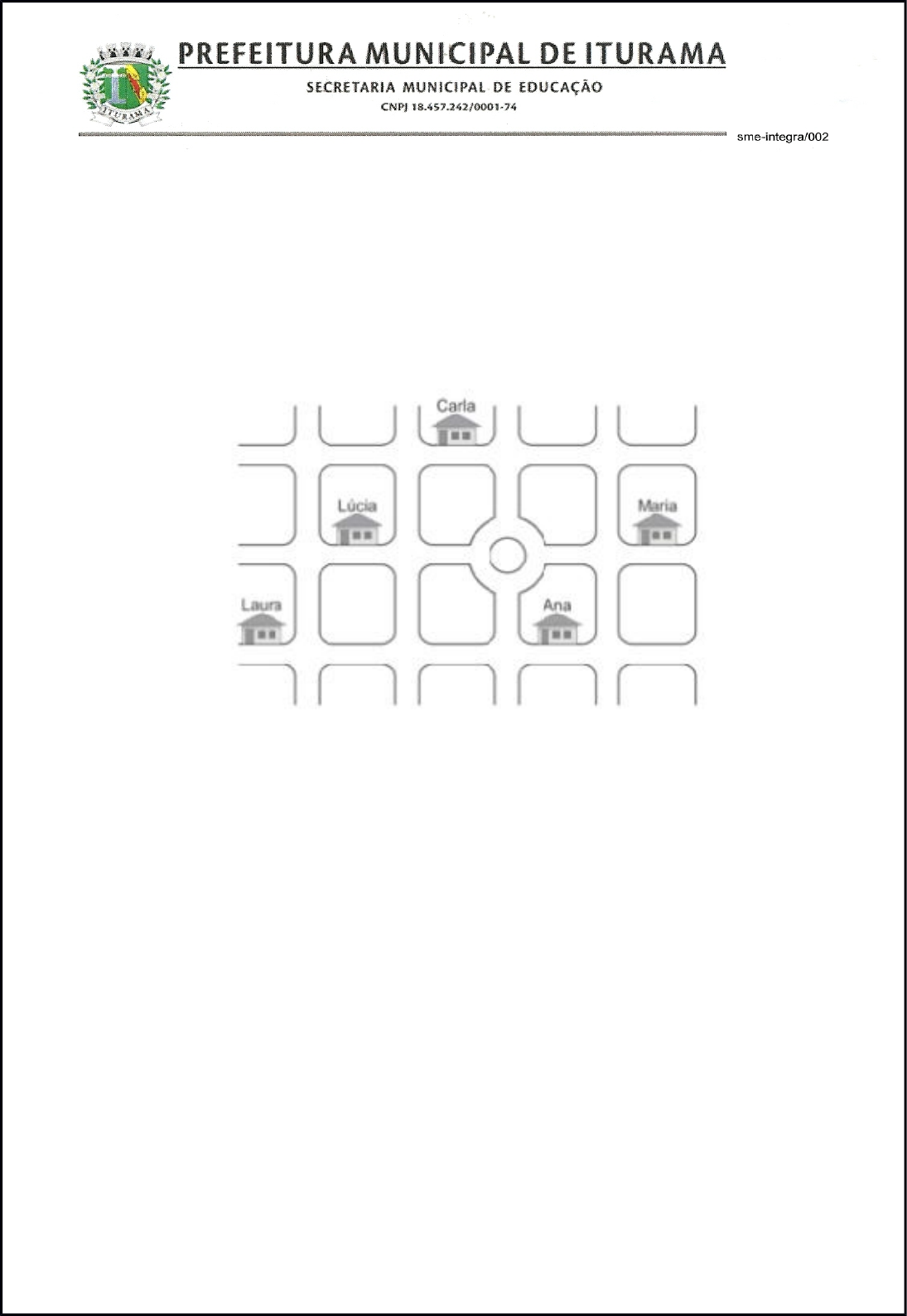 AVALIAÇÃO DIAGNÓSTICA DE MATEMÁTICA – 6º ANO ALUNO (A): ________________________________________________ ESCOLA: ___________________________________________________ 1-Carla fez o desenho de algumas ruas de seu bairro, próximas à sua casa. Localizou sua casa e marcou-a com seu nome. Localizou também a casa de 3amigas e marcou-as com o nome de cada uma e de sua escola. Veja abaixo o que ela fez. A casa que fica mais próxima da casa de Carla é da sua amiga A) B) ( ) Ana C) ( ) Laura D) ( ) Lúcia E) ( ) Maria 2-- Leia as informações e analise as embalagens a seguir. As embalagens são projetadas segundo as necessidades do fabricante. No caso de uma embalagem para se colocar cereal em flocos, geralmente ela tem o formato de um prisma e é confeccionada de papelão. Analise uma dessas embalagens e sua planificação. A) ( ) Prisma Quadrangular. B) ( ) Prisma Pentagonal. C) ( ) Prisma Triangular. D) ( ) Prisma Retangular. 3- Luiz usou linhas retas fechadas para fazer este desenho. Quantas figuras de três lados foram desenhadas? A) ( ) 1 C) ( )4 B) ( ) 3 D) ( ) 5 E) ( )6 4- Paula fez o seguinte desenho. Quantos retângulos aparecem neste desenho. A) ( ) 6 B) ( ) 4 C) ( ) 2 D) ( ) 0 5- Leia a charada feita pelo menino Maluquinho ao Bocão. Qual a resposta correta para essa charada. A) O chumbo. B) O algodão. C) Têm o mesmo “peso.”. D) Nenhum dos dois. 6- Leia o texto abaixo: O coração é o órgão responsável pelo bombeamento do sangue em nosso corpo. Localizado entre os dois pulmões, esse órgão começa a dar seus primeiros batimentos ainda no útero da mãe, por volta da 4ª semana de gestação, e continua a bater por toda a nossa vida. A frequência dos batimentos cardíacos em um adulto, quando está em repouso, é de aproximadamente 70 batimentos por minuto. Em 15 minutos um coração de um adulto bate: A) ( ) 1000 vezes B) ( ) 1020 vezes C) ( ) 1050 vezes D) ( ) 1100 vezes. 7- No show da dupla sertaneja “Bernardo e Arface”, observe o cartaz . SHOW COM “BERNARDO E ARFACE” NÃO PERCA! INGRESSO: R$12,00 Em um dia de exibição a dupla arrecadou R$3840,00. A dupla vendeu um total de A) ( ) 254 ingressos. B) ( ) 282 ingressos. C) ( ) 320 ingressos. D) ( ) 342 ingressos. VOCÊ É... ...O QUE VOCÊ COME. E também quanto e como você come. Os alimentos podem ajudar ou prejudicar sua saúde. Mas não é recomendável sentar-se à mesa como se vai a uma farmácia ou lançar-se a excessos como um condenado em sua última refeição. O prazer do equilíbrio é a chave de tudo. Já está provado que, das dez doenças que mais matam no mundo, cinco estão diretamente associadas a uma dieta de má qualidade: obesidade, infarto, derrame, diabetes e câncer – sobretudo o de mama, o de próstata e o de intestino. Ah, os refrigerantes, as batatas fritas, os hambúrgueres... Se eles não fossem tão gostosos, não teriam ganhado o planeta. Já as frutas, as verduras, os legumes... Bem, a verdade nua e crua (ou cozida, como queira) é que são alimentos difíceis de engolir para oito em cada dez pessoas (e para dez em cada dez crianças). *As informações dadas no gráfico estão expressas em quilos, per capita, por ano. Fonte: VEJA. São Paulo. 30 abr. 2008. p.116-121. 8- A quantidade de carne bovina, frutas e peixes consumidos no Japão, per capita, por ano é: A) ( ) 1,181 quilos B) ( ) 58,6 quilos C) ( )101,1 quilos D) ( ) 118,10 quilos 9 – A diferença de consumo de carne bovina, per capita, por ano, entre os países de maior e menor consumo mostrados no gráfico é B) A) 31,3 quilos C) B) 33,5 quilos D) C) 46,5 quilos E) D) 52,9 quilos 10– Sara, Paulo e Davi estão participando de uma mini maratona que tem um percurso total de 20 km, falta apenas 5 km para cruzarem a linha de chegada para saber quem será o vencedor. Esse percurso que resta em metros corresponde a: A) ( )5 metros B) ( ) 50 metros C) ( ) 500 metros D) ( ) 5 000 metros 11- Paula e Kátia foram ao cinema assistir o filme dos Smurfs o cartaz diz:” Abertura da sala – 10h00 e início da sessão 11h00”. A diferença da abertura da sala para o início da sessão corresponde a: A) ( ) 10 minutos B) ( ) 60 minutos C) ( ) 110 minutos D) ( ) 100 minutos 12- Observe a malha quadriculada abaixo. Cada lado do quadrinho mede 1 metro. O contorno dessa figura em metros é de: A) ( ) 10 B) ( ) 11 C) ( ) 20 D) ( ) 22 13-– Observando esse papel quadriculado verificamos a área da palavra “A” que é igual a: A) ( ) 10 B) ( ) 12 C) ( ) 14 D) ( ) 16 14- Mara entra na escola às 7 horas; saiu de sua casa atrasada e quando chegou na escola o relógio marcava, 7h e 15 minutos. Qual dos relógios abaixo mostra a hora em que ela chegou na escola? A) ( ) B) ( ) C) ( ) D) ( ) 15- Observe os algarismos das fichas: 4 2 5 8 Se utilizarmos todas as fichas para formar o maior número possível o algarismo que ficará na ordem dos milhares é: A) ( ) 2 B) ( ) 8 C) ( ) 4 D) ( ) 5 16- Paulo visitou uma loja de departamentos e separou alguns produtos. Tablet R$ 1.899,60 E-Reader- R$ 790,90 Samsung Galaxy Tab 3G R$ 2.700,00 Se ele optar pela compra do Tablet e o E-Reader ele pagará? A) ( ) R$2960,00 B) ( ) R$2690,00 C) ( ) R$2690,50 D) ( ) R$2960,50 17- Observe o cartaz de promoção da televisão: Preço Total: R$ 480,00 Entrada: R$ 60,00 O restante em 3 prestações iguais. Qual é o valor da prestação dessa televisão? A) ( ) R$ 140,00 B) ( ) R$ 180,00 C) ( ) R$ 190,00 D) ( ) R$ 240,00 18- LEIA O TEXTO ABAIXO: Litro O litro é uma das unidades de medidas usadas para medir os líquidos. O litro como unidade de medida é usado para medir: gasolina, leite, óleo, água, vinho, álcool, etc. A metade do litro é meio litro. 1 litro tem 2 meios litros. 1 litro tem 4 quartos de litro e 1 litro equivale a 1000 mililitros. Quantos mililitros têm em 2 litros? A) ( ) 1000 ml B) ( ) 2000 ml C) ( ) 3000 ml D) ( ) 4000 ml 19- Use os números abaixo para responder: 34,5 45,6 23,8 16,3 84,9 Qual a diferença entre o maior e o menor