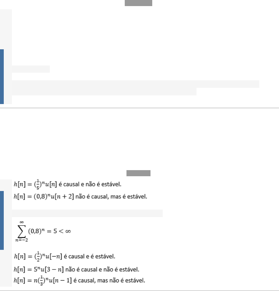 Questão 1/5 - Sinais e Sistemas Sinais podem ser representados por um conjunto de sinais simples, um exemplo disto é a representação por séries de Fourier, na qual o sinal é representado por uma sequência de senos e cossenos. Assinale a alternativa correta sobre representação de sinais: Nota: 20.0 A Autovalor é a função que multiplicada por um fator de amplitude gera uma saída. B Autofunção também chamada de fator de amplitude é um valor complexo que multiplica a função de entrada. C Componentes fundamentais são todas as componentes que constituem um sinal mais complexo. D Harmônicas são componentes que derivam do sinal da saída do sistema. E Período fundamental é o menor valor de T que satisfaz a equação x(t)=x(t+T). Você acertou! O período fundamental é o menor período necessário para verificar a periodicidade do sinal. A equação x(t)=x(t+T) descreve o comportamento de um sinal periódico. Questão 2/5 - Sinais e Sistemas A resposta ao impulso de um sistema LIT diz como o sistema irá interagir com um sinal de entrada, isto é válido para tempo contínuo e discreto. Avalie as alternativas que afirmam se o sistema discreto é causal/estável e assinale a alternativa correta: Nota: 0.0 A B Não é causal porque h[n]≠≠0 para n<0 e é estável porque: C D E Questão 3/5 - Sinais e Sistemas Qualquer sinal para ser filtrado precisa passar por um determinado filtro cuja resposta em frequência vai determinar quais frequências do sinal vão ser filtradas. Para isto o sistema realiza uma convolução de sinais. Levando em conta que a resposta ao impulso do filtro é dada pela função h[n] e o sinal de entrada é x[n]. O número marcado é o valor correspondente a n=0. Qual seria a resposta y[n] deste sistema entre n=-5 até n=5? Nota: 0.0 A B C D E Questão 4/5 - Sinais e Sistemas Considere o sinal discreto de entrada em um sistema, é descrito por: A resposta ao impulso do sinal é definida por: Calcule a convolução de x[n] por h[n], que é dada pela equação: O resultado da convolução é: Nota: 0.0 A B C D E Questão 5/5 - Sinais e Sistemas Considere as alternativas a seguir: Assinale a alternativa correta: Nota: 0.0 A Apenas a alternativa I está correta. B Apenas a alternativa II está correta. C As alternativas I e II estão corretas. D As alternativas II e III estão corretas. (III) Está correta, a convolução pode ser reconhecida como um processo de superposição das operações das cópias deslocadas de h[n]. Sendo a primeira operação que ocorrerá com alguma cópia, será no primeiro valor não zero de x[n]. Assim a primeira cópia ocorrerá em N1. A cópia de h[n] que ocorre em n=N1 terá sua primeira amostra com valor não zero na localização N1+N2. Por isso para qualquer valor de n menor que N1+N2 resultará em uma saída y[n] de zero. E As alternativas I, II e III estão corretas.
