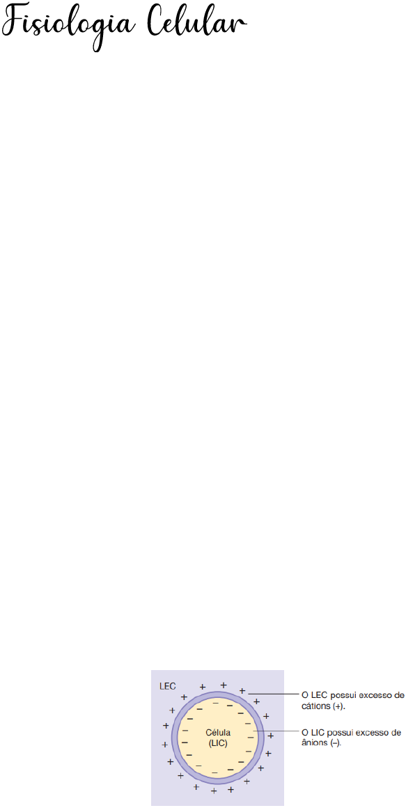 Potenciais de Membrana e Po- tenciais de Ação Existem potenciais elétricos através das membranas de praticamente to- das as células do corpo. Algumas cé- lulas, como as células nervosas e as dos músculos, geram impulsos ele- troquímicos que se modificam, com grande rapidez, em suas membranas, e esses impulsos são usados para transmitir sinais por toda a membrana dos nervos e músculos. Diversos solutos do corpo, incluindo componentes orgânicos, como o pi- ruvato e o lactato, são íons e, por- tanto, carregam uma carga elétrica líquida. O potássio (K) é o principal cátion no interior das células, e o só- dio (Na+) domina o líquido extracelu- lar. Entre os ânions, íons cloreto (Cl-) na maior parte permanecem com Na+ no líquido extracelular. Os íons fosfato e as proteínas negativamente carregadas são os principais ânions do líquido intracelular. Em geral, o corpo é eletricamente neutro: para todos os cátions, há um aníon cor- respondente. No entanto, os íons não são distribuídos uniformemente en- tre o LEC e o LIC . O compartimento intracelular contém alguns ânions que não possuem cátions correspondentes, o que confere às células uma carga líquida negativa. Ao mesmo tempo, o compartimento extracelular apresenta uma carga lí- quida positiva: alguns cátions do LEC não possuem ânions corresponden- tes. Uma consequência desta distri- buição desigual de íons é que os compartimentos intracelular e extra- celular não estão em equilíbrio elé- trico. Em vez disso, os dois comparti- mentos existem em um estado de desequilíbrio elétrico. Potencial de membrana O desequilíbrio elétrico que existe entre o líquido extracelular (LEC) e o líquido intracelular (LIC) de células vi- vas é chamado de diferença de po- tencial de membrana (Vm), ou po- tencial de membrana. O potencial da membrana resulta da distribuição de- sigual da carga elétrica (i.e., íons) en- tre o LEC e o LIC. Potencial de ação O potencial de ação é fenômeno de células excitáveis como neurônios e células musculares, e consiste na rá- pida despolarização, seguida pela re- polarização do potencial de mem- brana. Os potenciais de ação são o mecanismo básico de transmissão de informação no sistema nervoso e em todos os tipos de músculos. Estágio de Repouso O estágio de repouso é o potencial de repouso da membrana, antes do início do potencial de ação. Diz-se que a membrana está “polarizada” durante esse estágio, em razão do potencial de membrana de −90 mili- volts negativo existente. Estágio de Despolarização A esse tempo, a membrana fica su- bitamente muito permeável aos íons sódio, permitindo que grande nú- mero de íons sódio, positivamente carregados, se difunda para o interior do axônio. O estado normal de “pola- rização” de –90 milivolts é, de imedi- ato, neutralizado pelo influxo dos íons sódio com carga positiva, com o po- tencial aumentando rapidamente para valor positivo, um processo cha- mado despolarização. Hiperpolarização ↳Quando o potencial de membrana se torna mais negativo. ↳Período refratário absoluto: o axô- nio do neurônio não consegue dispa- rar um novo potencial de ação, por- que os canais de Na+ dependentes de voltagem encontram-se inativos. ↳Período refratário relativo: o axônio pode disparar um novo potencial de ação, mas para que isso possa ocor- rer é necessária a aplicação de um estímulo acima do potencial limiar desse axônio. Estágio de Repolarização Em alguns décimos de milésimos de segundo após a membrana ter ficado muito permeável aos íons sódio, os canais de sódio começam a se fe- char, e os canais de potássio se abrem mais que o normal. Então, a rápida difusão dos íons potássio para o exterior restabelece o potencial de repouso negativo da membrana que é referido como repolarização da membrana. Os canais de sódio e potássio regulados pela voltagem O agente necessário para provocar a depolarização e a repolarização da membrana nervosa durante o poten- cial de ação é o canal de sódio regu- lado pela voltagem. O canal de potás- sio regulado pela voltagem também tem participação importante por aumentar a rapidez da repolarização da membrana. Esses dois canais re- gulados pela voltagem atuam de forma adicional com a bomba de Na +-K+ e com os canais de vazamento de K+-Na +. Ativação do Canal de Sódio Quando o potencial de membrana se torna menos negativo que durante o estado de repouso, aumentando de –90 milivolts até zero, ele atinge a voltagem — em geral, de cerca de −70 a −50 milivolts —, o que pro- voca alteração conformacional ab- rupta da comporta de ativação, fa- zendo com que o canal fique total- mente aberto. Durante esse estado ativado, os íons sódio podem entrar pelo canal, aumentando a permeabili- dade da membrana ao sódio por 500 a 5.000 vezes. Inativação do Canal de Sódio O mesmo aumento da voltagem que faz com que a comporta seja ativada também faz com que essa comporta seja inativada. A comporta é desati- vada em poucos décimos de milési- mos de segundo após ter sido ati- vada. Isto é, a alteração conformacio- nal que provoca o fechamento da comporta de ativação é um pro- cesso mais lento que a alteração conformacional que abre a comporta de ativação. Assim, após o canal de sódio ter permanecido aberto por al- guns décimos de milésimos de se- gundo, o canal é inativado e se fecha, e os íons sódio não podem atraves- sar a membrana. Nesse momento, o potencial de membrana começa a retornar ou se aproximar de seu es- tado normal de repouso, que é o processo de repolarização. Outra ca- racterística importante do processo de inativação do canal de sódio é que a comporta inativada só vai reabrir quando o potencial de membrana re- tornar ou se aproximar do potencial de repouso na condição original. Por essa razão, usualmente não é possí- vel para o canal de s