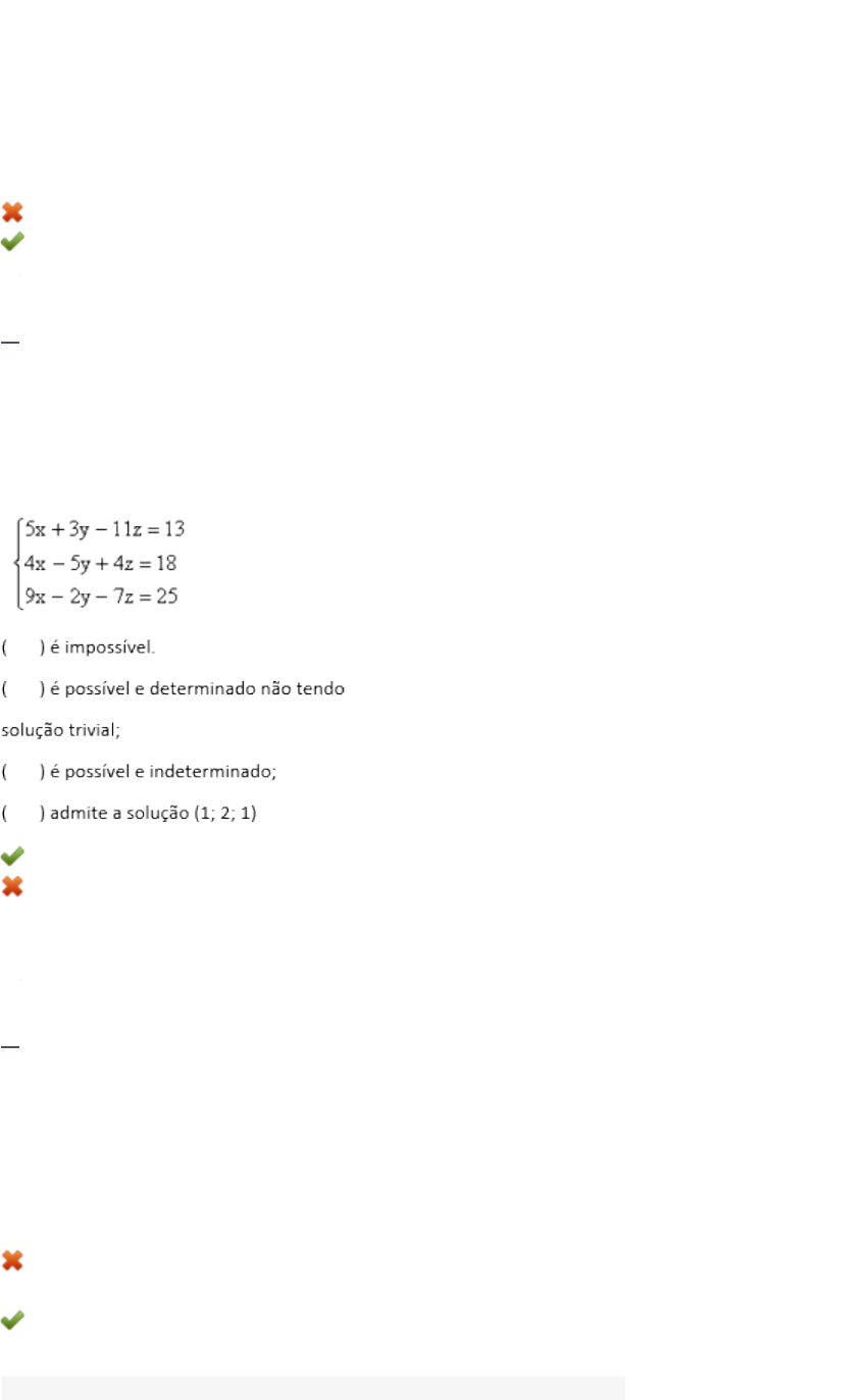 Matriz quadrada é a que tem o mesmo número de linhas e de colunas. Esse tipo especial de matriz possui um número real associado. A este número real, damos o nome de determinante da matriz. Baseado nisso, sabendo que o determinante de uma matriz é igual a 2, assinale a alternativa CORRETA que apresenta o valor do novo determinante, obtido pela troca de posição de linhas entre si: a) 1/2. b) 2. c) 4. d) -2. 2. Sistemas lineares é um conjunto de equações lineares, com m equações e n incógnitas. A solução de um sistema linear é a solução de todas as equações lineares. Existem muitas maneiras de resolver um sistema de equações lineares ou sistemas lineares, como quiser chamá-los. Dessa forma, o mais importante é conhecer suas principais características e propriedades. Com base no sistema apresentado, classifique V para as sentenças verdadeiras e F para as falsas e, em seguida, assinale a alternativa que apresenta a sequência CORRETA: a) V - F - F - F. b) F - F - V - F. c) F - V - F - F. d) F - F - F - V. 3. A função do 2º grau também é chamada de função quadrática, cuja expressão deriva da palavra latina quadratum, que significa quadrado, cuja área é x*x = x² que é exatamente a representação matemática da área de um quadrado de lado x. Geometricamente, esta função é descrita por uma parábola. Desta forma, nos remetemos aos conceitos de cônicas. Considere então, a parábola definida por y = x² - 4x +7 e a circunferência definida por (x-2)² + (y-3)² = 4. Sobre em quantos pontos estas duas curvas se interceptam, assinale a alternativa CORRETA: a) Três pontos. b) Um ponto. c) Nenhum ponto. d) Dois pontos. Você não acertou a questão: Atenção! Está não é a resposta correta. 4. Em Matemática, uma transformação linear é um tipo particular de função entre dois espaços vetoriais que preserva as operações de adição vetorial e multiplicação por escalar. Uma transformação linear também pode ser chamada de aplicação linear ou mapa linear. A respeito das transformações lineares, analise as opções a seguir: I- T(x,y) = (x² , y²). II- T (x,y) = (2x, - x + y). III- T (x,y) = (- x + y, x - 1). IV- T (x,y) = (x, x - y). Assinale a alternativa CORRETA: a) As opções II e IV estão corretas. b) As opções III e IV estão corretas. c) Somente a opção IV está correta. d) As opções I e III estão corretas. Parabéns! Você acertou a questão: Parabéns! Você acertou! 5. Considerando a função genérica da reta R x + y = k, e admitindo que k é uma constante real qualquer. Imagine agora uma circunferência C, cuja equação é x² + y² = 4, sendo que ambas estão situadas no mesmo sistema cartesiano de coordenadas. Sobre o menor valor real de k, aproximadamente, para que a reta R intercepte a circunferência C em apenas um ponto, assinale a alternativa CORRETA: a) -2*raiz de 2. b) -Raiz de 6. c) -2*raiz de 3. d) Raiz de 3. Você não acertou a questão: Atenção! Está não é a resposta correta. 6. Pela definição de vetor, sabemos que dados dois pontos e um sentido, podemos determinar o vetor que liga estes dois pontos e possui a direção indicada. Através deste processo podemos mais tarde ter um apoio no estudo das retas e planos no espaço. Baseado nisso, assinale a alternativa CORRETA que apresenta o vetor u definido pelos pontos A = (1,0,-3) e B = (2,4,1), no sentido de A para B: a) u = (1,4,2). b) u = (0,4,4). c) u = (1,4,4). d) u = (1,4,-2). 7. Antes de se analisar analiticamente os casos, é importante ter um olhar gráfico das situações para assim poder modelar analiticamente o problema com melhor qualidade. Nessa concepção, e utilizando essa dica, imagine que um vértice A de um triângulo está na origem do sistema de coordenadas, um outro vértice B está no ponto (2, 2) e o último vértice C no ponto (2,- 2). Observando qual delas representa a equação da reta que passa por A e pelo ponto médio de BC, analise as opções a seguir: I- y = 0. II- x = 0. III- x + y = 0. IV- y = 2. Assinale a alternativa CORRETA: a) Somente a opção II está correta. b) Somente a opção I está correta. c) Somente a opção IV está correta. d) Somente a opção III está correta. Você não acertou a questão: Atenção! Está não é a resposta correta. 8. Imagine que você queira empurrar um objeto. A força que você aplica sobre ele precisa estar na direção e sentido em que você pretende movimentá-lo ou não chegará ao resultado desejado: se desejar que o objeto vá para frente, logicamente não adiantará empurrá-lo para baixo. Isso porque a força é um exemplo de grandeza vetorial. Para descrevê-la, é preciso que se diga também o sentido e a direção em que ela é aplicada. Com relação ao vetor resultado (R) da operação -u + 2v, sendo u = (-1,2,0) e v = (-1,-2,3), analise as opções a seguir: I- R = (-3,0,6). II- R = (-1,6,-6). III- R = (-1,-6,6). IV- R = (3,0,6). Assinale a alternativa CORRETA: a) Somente a opção I está correta. b) Somente a opção IV está correta. c) Somente a opção II está correta. d) Somente a opção III está correta. Você não acertou a questão: Atenção! Está não é a resposta correta. 9. Um sistema linear é homogêneo quando os coeficientes, independente de todas as suas equações lineares, são iguais a zero. Esse tipo de sistema possui pelo menos uma solução possível, pois podemos obter como resultado o terno (0, 0, 0), que chamamos de solução nula ou trivial. O sistema dado pela multiplicação matricial a seguir é homogêneo. Assim, analise as sentenças a seguir e assinale a alternativa CORRETA: a) Somente a sentença I está correta. b) Somente a sentença II está correta. c) Somente a sentença IV está correta. d) Somente a sentença III está correta. 10. No estudo da Geometria Analítica, deparamo-nos com três seções cônicas que são oriundas de cortes efetuados em um cone: a hipérbole, a elipse e a parábola. O estudo da parábola,