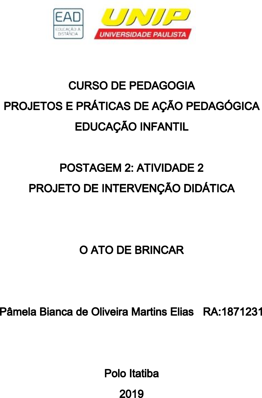 Título: O ato de brincar Tema: A importância dos jogos e brincadeiras na educação infantil Situação Problema: Há uma visão descontextualizada sobre o brincar na educação infantil, visto por muitas vezes somente como um ato de ocupar o tempo das crianças. Esse trabalho tem como propósito mostrar a importância dos jogos e brincadeiras no contexto pedagógico. Justificativa: O ato de brincar é um momento lúdico e necessário para interação da criança na educação infantil. É por ele que a criança troca experiências e ideias. Aprimora o raciocínio e constrói sua autoimagem. Essa ação é completamente significativa para a criança, é por ela que a criança forma seus elos afetivos e emocionais. Por isso é necessário conscientizar os pais, educadores e sociedade em geral, que o brincar faz parte da aprendizagem e do desenvolvimento da criança. É de extrema importância que o educador faça uso dos jogos e brincadeiras como recurso pedagógico. Público Alvo: Alunos da educação infantil de 3 a 4 anos. Objetivo Geral: Desenvolver as capacidades motoras, cognitivas e fortalecer o convívio social. Objetivo Especifico: ▪ Apresentar as regras em relação aos jogos. ▪ Estimular a cooperação em grupo. ▪ Promover o respeito mútuo entre alunos nas horas das brincadeiras. ▪ Motivar os alunos a aprender diferentes brincadeiras. Embasamento Teórico: De acordo com o volume 1 do Referencial Curricular Nacional de Educação Infantil: [...] nas brincadeiras, as crianças transformam os conhecimentos que já possuíam anteriormente em conceitos gerais com os quais brinca. Por exemplo, para assumir um determinado papel na brincadeira, a criança deve conhecer alguma de suas características. Seus conhecimentos provêm da imitação de alguém os algo conhecido. (Brasil, 1998, p.27). O ato de brincar é uma atividade espontânea e social, na qual a criança faz uso de seus conhecimentos prévios baseados no contexto social em que está inserida. O educador não precisa ensinar a criança a brincar, pois este é um ato que acontece espontaneamente, mas sim planejar e organizar situações para que as brincadeiras ocorram de maneira diversificada, propiciando às crianças a possibilidade de escolher os temas, papéis, objetos e companheiros com quem brincar. Dessa maneira, poderão elaborar de forma pessoal e independente suas emoções, sentimentos, conhecimentos e regras sociais (RCNEI, 1998, p. 29). Segundo Piaget (1978), a criança é um agente ativo em seu próprio desenvolvimento, construindo e adaptando - se ao ambiente e modificando, assim, seus esquemas básicos. Suas habilidades cognitivas não só dependem do conhecimento e perícia específicos, mas também do ambiente que facilitará o brincar da criança. É preciso que ambiente da educação infantil seja organizado e planejado para de facilite as brincadeiras da criança, deve se usar brinquedos variados para estimular a imaginação da criança. De acordo com Kishimoto, os brinquedos dão suporte para as brincadeiras, sendo eles estruturados ou não. Na instituição de educação infantil, pode-se oferecer às crianças condições para as aprendizagens que ocorrem nas brincadeiras e aquelas advindas de situações pedagógicas intencionais ou aprendizagens orientadas pelos adultos. É importante ressaltar, porém, que essas aprendizagens, de natureza diversa, ocorrem de maneira integrada no processo de desenvolvimento infantil. (RCNEI, pág. 23). Algumas principais ideias que o RCNEI aponta em relação ao brincar são: • o brincar é uma das atividades fundamentais para o desenvolvimento e a educação das crianças pequenas; • as crianças, quando brinca, buscam descobrir diversas possibilidades de resolver seus problemas que lhe são colocados, seja pela realidade imediata ou não, seja pela realidade externa ou interna; • brincar é uma atividade sociocultural que se origina nos valores, hábitos e normas de uma determinada comunidade ou grupo social; • tornar o brincar uma atividade lúdica dentro do ambiente escolar implica a possiblidade de escolhas, ou, seja, que a criança tenha certa autonomia para escolher seus companheiros, o papel a ser assumido no interior de um determinado tema, o enredo etc., sendo tais escolhas dependem unicamente da vontade de quem brinca. A brincadeira estimula na aprendizagem e no desenvolvimento cognitivo motor da criança. Além da aquisição do brincar na educação infantil é importante que o educador faça uso dos jogos adequando de cada faixa etária dos alunos. Kishimoto (1993) afirma que os jogos têm diversas origens e culturas que são transmitidas pelos diferentes jogos e formas de jogar. Este tem função de construir e desenvolver uma convivência entre as crianças estabelecendo regras, critérios e sentidos, possibilitando assim, um convívio mais social e democracia, porque “enquanto manifestação espontânea da cultura popular, os jogos tradicionais têm a função de perpetuar a cultura infantil e desenvolver formas de convivência social” (KISHIMOTO, 1993, p. 15). Para Kishimoto (1999), ao permitir que as crianças brinquem e se manifestem por meio de jogos, estaremos permitindo sua livre expressão. Assim, percebemos que o brincar é indispensável ao desenvolvimento cognitivo e afetivo da criança. A autora ainda enfatiza que os jogos podem ser utilizados nas escolas como recurso pedagógico, porque satisfazem a uma necessidade interior que cada criança tem, ou seja, o impulso natural para o lúdico. (Kishimoto, 1999). Friedman (1996, p. 56), afirma que é necessário dar atenção especial ao jogo, pois as crianças têm o prazer de realizar tarefas através da ludicidade. E quando isto a acontece vivência o mundo imaginário e assim se afasta da sua vida habitual. O brincar na escola é diferente do brincar em outro lugar, a brincadeira na escola tem como finalidade o aprendizado da criança envolvendo assim toda a equipe 