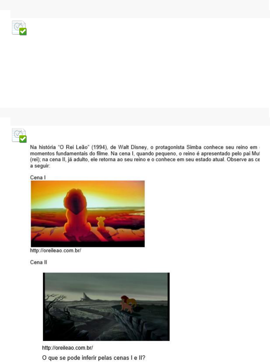 Pergunta 1 1 em 1 pontos Ao trabalhar filme em sala de aula, pressupõe-se que o professor: I. Faça um planejamento prévio, por meio do qual tenha clareza quanto aos objetivos relativos à utilização do filme. II. Decida se o filme será utilizado na íntegra ou apenas em alguns trechos (e quais seriam, nesse caso, as sequências selecionadas). III. Defina qual a relação entre o filme e os conteúdos que estão sendo trabalhados em sala de aula. Está(ão) correto(s): Resposta Selecionada: a. Todos os pressupostos são corretos. Pergunta 2 1 em 1 pontos Resposta Selecionada: b. Houve alteração no reino, percebida pela mudança de cores, com cores quentes na cena I e cores sombrias e escuras na cena II. Pergunta 3 1 em 1 pontos Resposta Selecionada: c. Verifica-se a relação entre cinema e atualidade pelas imagens tecnológicas de cada cena. Pergunta 4 0 em 1 pontos Nos filmes infantis, vemos a narrativa clássica, em que o papel feminino geralmente segue o padrão de comportamento e de beleza da época da história. Dos filmes a seguir, qual personagem feminina segue um papel clássico? Resposta Selecionada: d. Pergunta 5 1 em 1 pontos Sobre um filme brasileiro como “Os Trapalhões e o Mágico de Oróz” (1984) é correto afirmar que: I. recorre ao imaginário literário infanto-juvenil estrangeiro, imaginário também utilizado pelo cinema estrangeiro desde a época clássica; II. possui pretensões de uma certa crítica social, tendo como referência os temas nacionais; III. é uma realização inspirada no cinema contemporâneo, em suas temáticas e principalmente “efeitos”, procurando utilizar mais os recursos técnicos e as possibilidades de estúdio; IV. procura uma sintonia com um imaginário internacional e modernizado. Está(ão) correta(s): Resposta Selecionada: d. As afirmativas I, II, III e IV. Pergunta 6 1 em 1 pontos Resposta Selecionada: a. O cenário aqui é semelhante ao do ambiente da savana da qual faz parte o reinado de Mufasa. Pergunta 7 1 em 1 pontos A construção da imagem cinematográfica vai além do visual, tendo como apoio a estrutura de cenas, o trabalho de câmera, o som, os diálogos, as locações, entre outras. Todo esse conjunto que compõe a imagem do filme traz, além da narrativa propriamente dita, a intertextualidade construída por uma variedade de meios de representação. Assinale a alternativa em que se verifica que não há relação de intertextualidade entre as histórias. Resposta Selecionada: c. 101 dálmatas (filme de Walt Disney) – Madagascar (filme Eric Darnell e Tom McGrath). Pergunta 8 1 em 1 pontos Quanto à metodologia para trabalhar com filmes em sala de aula, a informação incorreta é: Resposta Selecionada: e. Deve-se manter a ideia original da história, sem relacioná-la com o ponto de vista atual do professor/aluno. Pergunta 9 1 em 1 pontos Leia as afirmações que podemos associar ao cinema na escola. I. Ver significa essencialmente conhecer, perceber pela visão, alcançar com as vista os seres, as coisas e as formas do mundo ao redor. Ver é também um exercício de construção perceptiva em que os elementos selecionados e o percurso visual podem ser educados. II. Observar é olhar, pesquisar, detalhar, estar atento, de diferentes maneiras, às particularidades visuais, relacionando-as entre si. III. O saber ver e observar podem ser trabalhados de maneira que a pessoa possa analisar, refletir, interferir e produzir visualmente por meio do entendimento da linguagem visual. Está(ao) correta(s) a(s) afirmativa(s): Resposta Selecionada: d. I, II e III; Pergunta 10 1 em 1 pontos Entre as características que marcam o filme infantil, não consta: Resposta Selecionada: a. Ser uma arte geralmente anônima, pois é resultado de várias colaborações, que passam de geração em geração ao longo do tempo, geralmente feita oralmente.