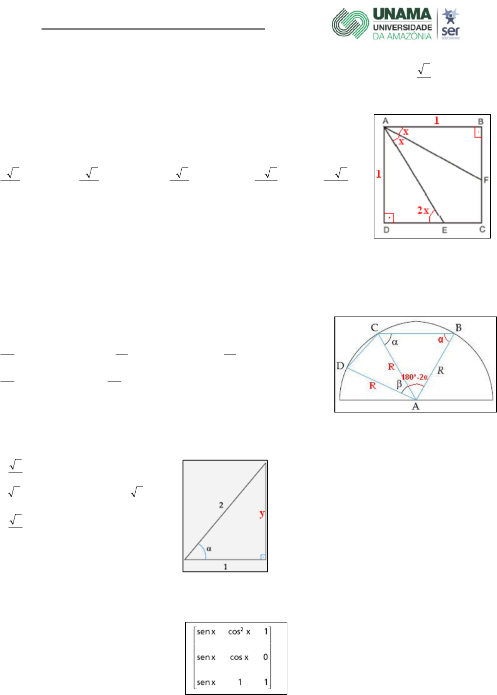 1 EXERCÍCIOS – TÓPICOS DE MATEMÁTICA 1) A figura representa um quadrado ABCD de lado 1. O ponto F está em BC, BF mede 4 5 , o ponto E está em CD e AF é bissetriz do ângulo BÂE. Nessas condições, o segmento DE mede: a) 40 53 b) 40 57 c) 40 59 d) 40 511 40 513 2) Na figura abaixo, o quadrilátero ABCD está inscrito numa semicircunferência de centro A e raio AB = AC = AD = R. A diagonal forma com os lados e ângulos α e β, respectivamente. Logo, a área do quadrilátero ABCD é: a) sen2sen 2 R2 b) 2sen2sen 2 R2 c) 2sen2cos 2 R2 d) cossen 2 R2 e) cos2sen 2 R2 3) Com relação ao ângulo α da figura, podemos afirmar que tg 2α vale: a) 2 3 b) 1 c) 3 d) 32 e) 3 3 4) Observe a matriz a seguir. Resolvendo seu determinante, será obtido o seguinte resultado: a) 1 b) sen x c) sen2 x d) sen3 x 2 5) Um holofote está situado no ponto A, a 30 metros de altura, no alto de uma torre perpendicular ao plano do chão. Ele ilumina, em movimento de vaivém, uma parte desse chão, do ponto C ao ponto D, alinhados à base B, conforme demonstra a figura a seguir. Se o ponto B dista 20 metros de C e 150 metros de D, a medida do ângulo CÂD corresponde a: a) 60° b) 45° c) 30° d) 15° 6) No esquema acima estão representadas as trajetórias de dois atletas que, partindo do ponto X, passam simultaneamente pelo ponto A e rumam para o ponto B por caminhos diferentes, com velocidades iguais e constantes. Um deles segue a trajetória de uma semicircunferência de centro O e raio 2R. O outro percorre duas semicircunferências cujos centros são P e Q. Considerando 4,12 , quando um dos atletas tiver percorrido 4 3 do seu trajeto de A para B, a distância entre eles será igual a: a) 0,4 R b) 0,6 R c) 0,8 R d) 1,0 R 7) A figura mostra um poste, cravado verticalmente no solo e sustentado por dois cabos, que formam com a horizontal ângulos α e β. Se os pontos de fixação dos cabos ao terreno, alinhados com a base do poste, distam uma medida d, a altura do poste pode ser calculada por: a) sen.sen.d b) coscos cos.cos.d c) tg.tg.d d) tg.tg tgtg.d e) tgtg tg.tg.d 8) A figura representa uma fileira de n livros idênticos, em uma estante de 2 metros e 20 centímetros de comprimento: AB = DC = 20 cm; AD = BC = 6 cm. Nas condições dadas, n é igual a: a) 32 b) 33 c) 34 d) 35 e) 36 3 9) Um atleta faz seu treinamento de corrida em uma pista circular que tem 400 metros de diâmetro. Nessa pista, há seis cones de marcação indicados pelas letras A, B, C, D, E e F, que dividem a circunferência em seis arcos, cada um medindo 60 graus. Observe o esquema mostrado. O atleta partiu do ponto correspondente ao cone A em direção a cada um dos outros cones, sempre correndo em linha reta e retornando ao cone A. Assim, seu percurso correspondeu a ABACADAEAFA. Considerando 7,13 , o total de metros percorridos pelo atleta nesse treino foi igual a: (A) 1480 (B) 2960 (C) 3080 (D) 3120 10) O topo de uma torre e dois observadores, X e Y, estão em um mesmo plano. X e Y estão alinhados com a base da torre. O observador X vê o topo da torre segundo um ângulo de 45°, enquanto Y, que está mais próximo da torre, vê o topo da torre segundo um ângulo de 60°. Se a distância entre X e Y é 30,4m, qual o inteiro mais próximo da altura da torre, em metros? (Dados: use as aproximações tg(45°) = 1 e tg(60°) ≅ 1,73). a) 72 m b) 74 m c) 76 m d) 78 m e) 80 m 11) Na figura mostrada, 5 1 i 5 1 i )b(sen )acos( é igual a: a) 1 b) 3 5 c) 2 3 d) 2 2 e) 2
