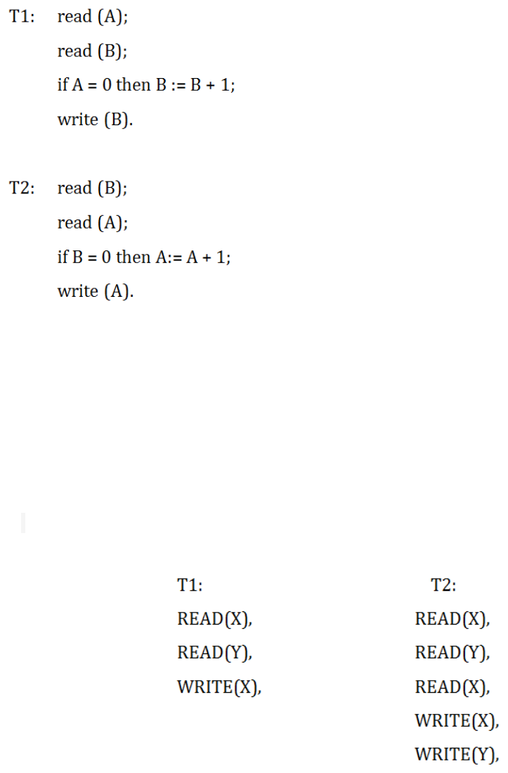8COP 018 – Banco de Dados Prof. Vitor Valerio de Souza Campos Unidade 5 - Concorrência e falhas EXERCÍCIO 1 Considere as duas transações a seguir: (a) Adicione instruções de bloqueio e desbloqueio às transações, T1 e T2, para que eles observem o protocolo de bloqueio em duas fases. (b) A execução dessas transações pode resultar em um impasse? EXERCÍCIO 2 Considere um banco de dados com os objetos X e Y e assuma que existam duas transações T1 e T2. A transação T1 lê os objetos X e Y e depois grava o objeto X. A transação T2 lê os objetos X e Y, depois lê X mais uma vez e finalmente grava os objetos X e Y. Ou seja: 1. Dê um exemplo de schedule com as ações das transações T1 e T2 nos objetos X e Y que resulta em um conflito de gravação e leitura. 2. Dê um exemplo de schedule com as ações das transações T1 e T2 nos objetos X e Y que resulta em um conflito de leitura e gravação. 3. Dê um exemplo de schedule com as ações das transações T1 e T2 nos objetos X e Y que resulta em um conflito de gravação / gravação. 4. Para cada um dos três schedules, mostre que o 2PL estrito não permite o schedule. EXERCÍCIO 3 Schedules, Serialização e Bloqueios. (a) Considere as duas transações e o schedule a seguir. É este schedule serializável de conflito? Explique por que ou por que não. (b) Mostre como o 2PL pode garantir um schedule serializável de conflito para as mesmas transações acima. Usar a notação Locki [A] para indicar que a transação i adquire o bloqueio no elemento A e Unlocki [A] para indica que a transação i libera seu bloqueio em A. (c) Mostre como o uso de bloqueios sem 2PL pode levar a um schedule que NÃO é serializável de conflito. EXERCÍCIO 4 Schedules, Serialização e Bloqueios. Considere um banco de dados com os objetos X e Y e assuma que existam duas transações T1 e T2. T1 primeiro lê X e Y e depois escreve X e Y. T2 lê e escreve X depois lê e escreve Y. (a) Dado o exemplo de schedule não serializável abaixo. Explique por que não é serializável. (b) Mostre que o 2PL estrito não permite este schedule.