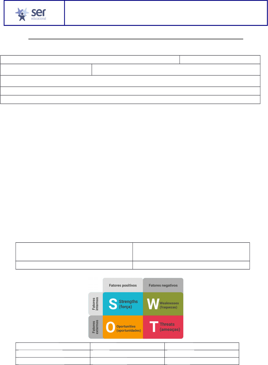 ATIVIDADE CONTEXTUALIZADA – EMPREENDEDORISMO Avaliação On-Line 6 (AOL 6) - Atividade Contextualizada de Empreendedorismo DADOS DO(A) ALUNO(A): NOME: MATRÍCULA: CURSO: Nutrição POLO: Disciplina: Empreendedorismo Tutor: Paulo Leopoldino PROFESSORA EXECUTORA: Tayana Vago Análise SWOT é uma ferramenta de gestão que serve para fazer o planejamento estratégico de empresas e novos projetos. A sigla SWOT significa: Strengths (Forças), Weaknesses (Fraquezas), Opportunities (Oportunidades) e Threats (Ameaças) e também é conhecida como Análise FOFA ou Matriz SWOT. Análise SWOT, ou FOFA, é uma ferramenta de planejamento estratégico na gestão de projetos, usada para analisar cenários e embasar a tomada de decisões. Ela costuma ser usada pelas empresas antes de implementar algum projeto de impacto para o negócio. A análise proporciona um diagnóstico completo da situação da própria empresa e dos ambientes que estão no seu entorno, de maneira que ajude a correr menos riscos e aproveitar as oportunidades. Acredita-se que esse método foi criado na década de 1960 pelo consultor de empresas Albert S. Humphrey, ao integrar um projeto do instituto de pesquisa de Stanford que foi financiado pelas maiores empresas da época. Albert conta essa história neste documento, publicado em 2005, após a sua morte. A sigla tem origem em termos do inglês, e também é conhecida como análise FOFA em português: S - Forças (Strengths) W - Fraquezas (Weaknesses) O - Oportunidades (Opportunities) T - Ameaças (Threats) Fatores SWOT Positivos Negativos Ambiente Interno Forças Fraquezas Ambiente Externo Oportunidade Ameaças MATRIZ SWOT MODA FASHION FORÇAS FRAQUEZAS · Preços competitivos; · Qualidade do produto; · Variedade de produtos; · Localização desprivilegiada; · Instabilidade no fornecimento; · Funcionários sem qualificação; OPORTUNIDADES AMEAÇAS · Vendas online. · Abertura para exportações; · Novos tipos de serviços; · Queda no comércio varejista. · Crise econômica no país; · Alta taxa de juros; · Concorrência. REFERENCIAS https://m.sebrae.com.br/Sebrae/Portal%20Sebrae/Anexos/ME_Analise-Swot.PDF https://www.treasy.com.br/blog/matriz-swot-analise-swot-matriz-fofa/ https://www.scopi.com.br/blog/planejando-com-matriz-swot/ http://www.sobreadministracao.com/matriz-swot-analise-guia-completo/