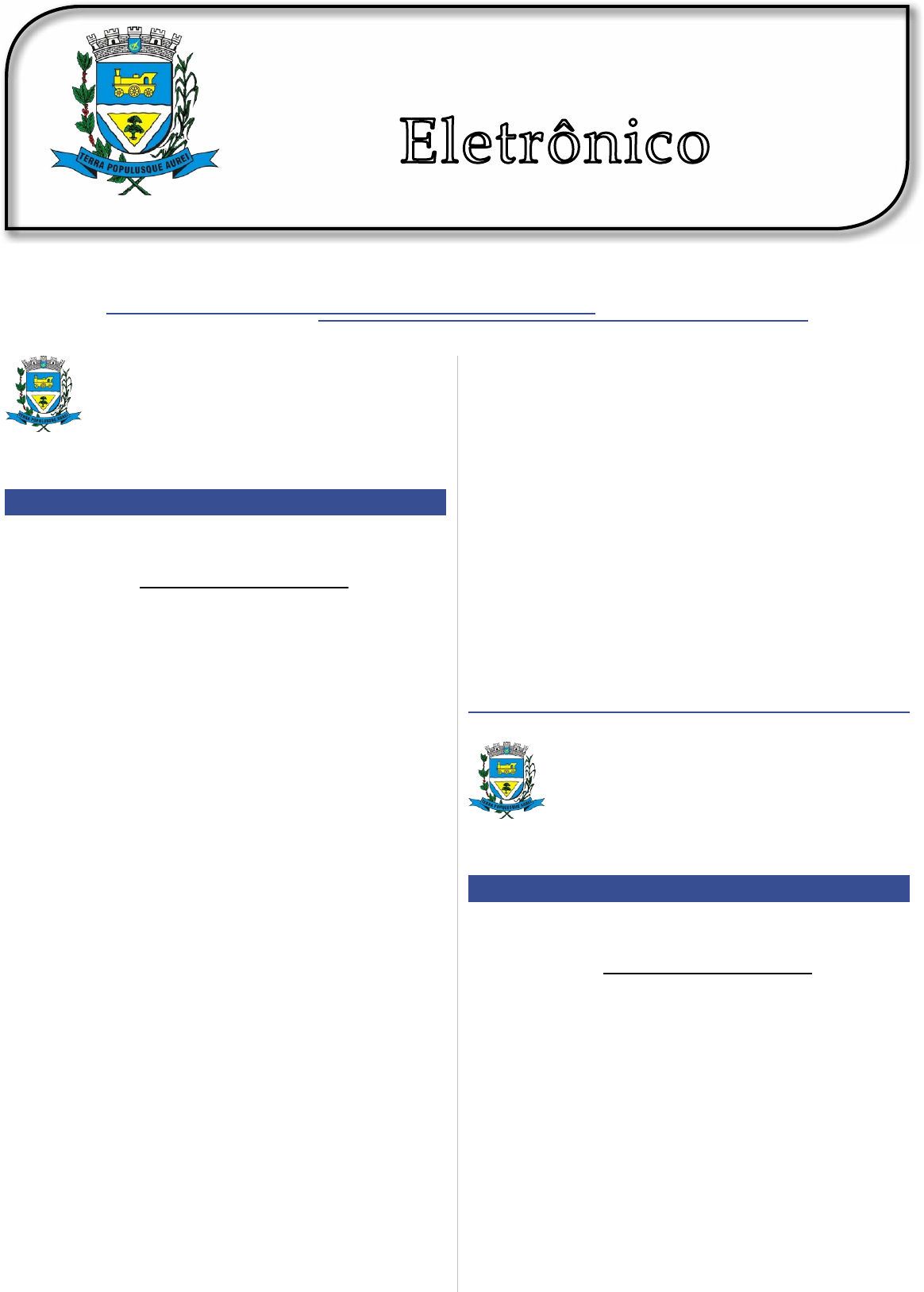 Diário Oficial do Município de Ourinhos Lei Complementar no. 955, de 30 de março de 2.017 Estado de São Paulo Eletrônico Ano XV | Edição no 1286 | www.ourinhos.sp.gov.br | Sexta-feira, 10 de maio de 2019. PREFEITURA MUNICIPAL DE OURINHOS SECRETARIA MUNICIPAL DE ADMINISTRAÇÃO Estado de São Paulo LEI COMPLEMENTAR Nº. 1.035 DE 09 DE MAIO DE 2019 Altera as Leis Complementares nºs 906, de 07 de julho de 2015, 935, de 26 de abril de 2016 e 949, de 21 de março de 2017 que dispõe sobre a doação de área em favor da OAB – Ordem dos Advogados do Brasil São Paulo, 58ª Subseção Ourinhos, desti- nado à construção de sua sede e dá outras providências. A Câmara Municipal de Ourinhos, aprovou em sessão do dia 06 de maio de 2019 eu, Prefeito Municipal, sanciono a seguinte Lei Complementar: Art. 1º. O art. 2º da Lei Complementar nº. 906, de 07 de julho de 2015, Lei Complementar nº. 935 de 26 de abril de 2016 e Lei Complementar nº. 949, de 21 de março de 2017, que dispõe sobre a doação de área em favor da OAB – Ordem dos Advogados do Brasil São Paulo, 58ª Subseção Ourinhos, destinado à construção de sua sede, passa a vigorar com a seguinte redação: “Art. 2º. O início da edificação a que se refere esta Lei Complementar deverá ocorrer no prazo má- ximo de 12 (doze) meses e sua conclusão no prazo máximo de 02 (dois) anos, contados de 10 de março 2019, sob pena de revogação da doação.” Art. 2º. Esta Lei Complementar entra em vigor na data de sua publicação. Prefeitura Municipal de Ourinhos, 09 de maio de 2019. LUCAS POCAY ALVES DA SILVA Prefeito Municipal Publicada e registrada na Secretaria Municipal de Administração, na data supra. JOAQUIM LUIS VASSOLER Secretário Municipal de Administração PREFEITURA MUNICIPAL DE OURINHOS SECRETARIA MUNICIPAL DE ADMINISTRAÇÃO Estado de São Paulo LEI Nº. 6.508 DE 09 DE MAIO DE 2019 Dispõe sobre denominação de próprio municipal (Praça Estelita Felisbino Mo- reira “Dona Santa”). A Câmara Municipal de Ourinhos, aprovou em sessão do dia 06 de maio de 2019 eu, Prefeito Municipal, sanciono a seguinte Lei de autoria do Vereador José Carlos Vieira dos Santos: Art. 1º. Passa a se denominar Praça Estelita Felisbino Moreira “Dona Santa” a atual Praça B, locali- zada entre as Ruas Osvaldo Godinho Sant’anna e Paulo Diário Oficial Eletrônico do Município de Ourinhos Sexta-feira, 10 de maio de 20192 Contém 26 páginas Lei Complementar no. 955, de 30 de março de 2.017 | On-line Estado de São Paulo Diário Oficial Eletrônico do Município de Ourinhos www.ourinhos.sp.gov.br | diariooficialpmo@gmail.com EXPEDIENTE SECRETARIA MUNICIPAL DE COMUNICAÇÃO Rua do Expedicionário, 627 - Centro - Ourinhos-SP - CEP: 19.900-041 - 14 3302-6116 Secretário Municipal de Comunicação: Felipe Chamorro Amaral Santos, da Vila Nossa Senhora de Fátima. § 1º. Quando da realização da solenidade de descerramento da placa denominativa serão convidados os familiares e amigos para participarem do evento. § 2º. A identificação da denominação da referida praça deverá ser efetuada no prazo máximo de 60 (ses- senta) dias após a publicação da presente Lei. Art. 2º. Esta Lei entra em vigor na data da sua publicação. Prefeitura Municipal de Ourinhos, 09 de maio de 2019. LUCAS POCAY ALVES DA SILVA Prefeito Municipal Publicada e registrada na Secretaria Municipal de Administração, na data supra. JOAQUIM LUIS VASSOLER Secretário Municipal de Administração PREFEITURA MUNICIPAL DE OURINHOS SECRETARIA MUNICIPAL DE ADMINISTRAÇÃO Estado de São Paulo LEI Nº. 6.509 DE 09 DE MAIO DE 2019 Dispõe sobre denominação de próprio municipal (Quadra Poliesportiva “Odilon Pasqual”). A Câmara Municipal de Ourinhos, aprovou em sessão do dia 06 de maio de 2019 eu, Prefeito Municipal, sanciono a seguinte Lei de autoria do Vereador José Carlos Vieira dos Santos: Art. 1º. Passa a se denominar Quadra Polies- portiva “Odilon Pasqual” a atual quadra poliesportiva do Centro Comunitário da Vila Odilon, integrante do Con- junto Poliesportivo Jayr Conti. § 1º. Quando da realização da solenidade de descerramento da placa denominativa serão convidados os familiares e amigos para participarem do evento. § 2º. A identificação da denominação da referi- da quadra deverá ser efetuada no prazo máximo de 60 (sessenta) dias após a publicação da presente Lei. Art. 2º. Esta Lei entra em vigor na data da sua publicação. Prefeitura Municipal de Ourinhos, 09 de maio de 2019. LUCAS POCAY ALVES DA SILVA Prefeito Municipal Publicada e registrada na Secretaria Municipal de Administração, na data supra. JOAQUIM LUIS VASSOLER Secretário Municipal de Administração Diário Oficial Eletrônico Diário Oficial Eletrônico do Município de Ourinhos Sexta-feira, 10 de maio de 20193 Contém 26 páginas PREFEITURA MUNICIPAL DE OURINHOS SECRETARIA MUNICIPAL DE ADMINISTRAÇÃO Estado de São Paulo DECRETO Nº. 7.121 DE 06 DE MAIO DE 2019 Permite o uso de bens público pelo LAR SANTA TERESA JORNET e dá outras providências. LUCAS POCAY ALVES DA SILVA, Prefeito Mu- nicipal de Ourinhos, Estado de São Paulo, no uso das atribuições que lhe são conferidas por Lei, e CONSIDERANDO o disposto no Processo nº. 17.292, de 12 de abril de 2019 da Secretaria Municipal de Assistência Social; CONSIDERANDO que a Lei Orgânica do Muni- cípio, em seu artigo 215 e § 1º. autoriza o Poder Execu- tivo Municipal, permitir o uso de qualquer bem público, a terceiros, mediante permissão de uso, a título precário, gratuito e por tempo determinado, DECRETA: Art. 1º. Fica permitido o uso, pelo LAR SANTA TERESA JORNET, sito na Rua Duque de Caxias, nº. 1.115 – Vila Recreio – Ourinhos, Estado de São Paulo, os bens públicos abaixo discriminados: DESCRIÇÃO QUANTIDADE PATRIMONIO Bebedouro; Compressor; Com duas torneiras de pressão. Em latão cromado; Ajuste de temperatura automática. Atendimento mínimo 20 pessoas 2 71146/