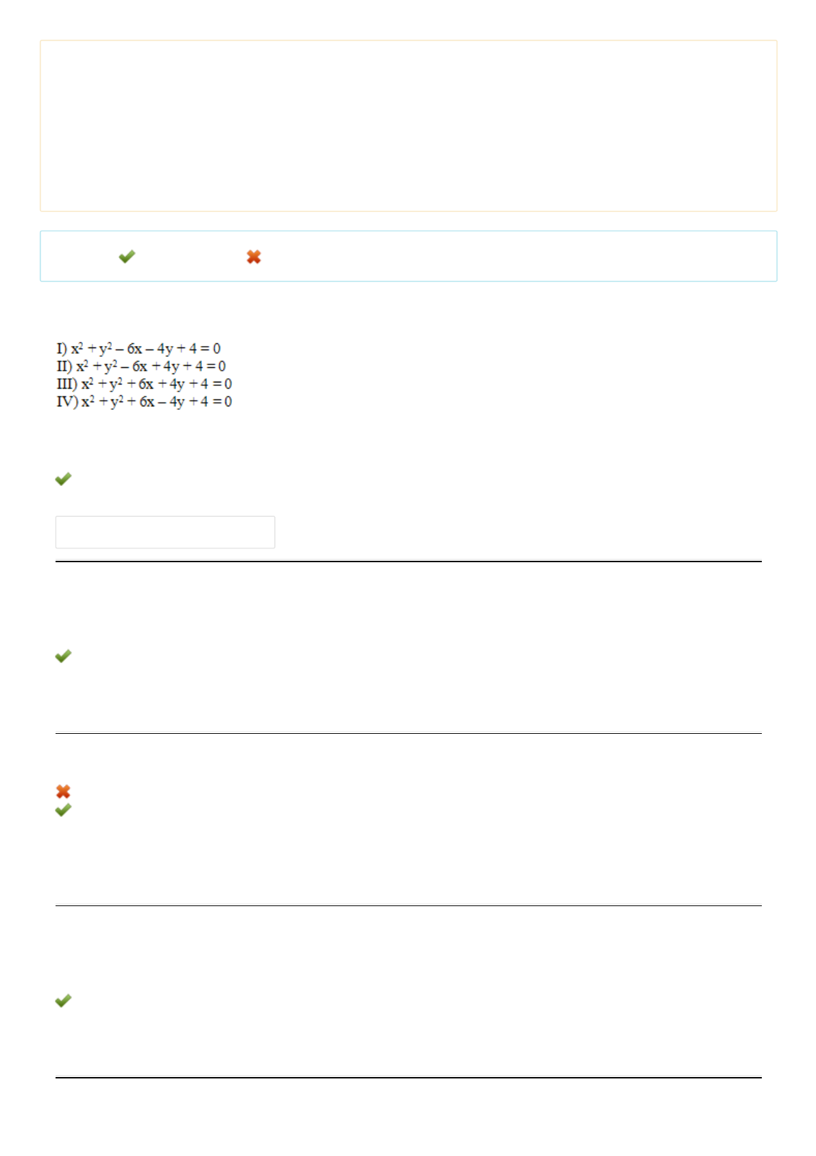 21/03/2020 UNIASSELVI - Centro Universitário Leonardo Da Vinci - Portal do Aluno - Portal do Aluno - Grupo UNIASSELVI https://portaldoalunoead.uniasselvi.com.br/ava/notas/request_gabarito_n2.php 1/3 Acadêmico: Tamiris Moreira de Carvalho (1180072) Disciplina: Geometria Analítica (MAT20) Avaliação: Avaliação II - Individual FLEX ( Cod.:444659) ( peso.:1,50) Prova: 11379567 Nota da Prova: 8,00 Legenda: Resposta Certa Sua Resposta Errada 1. Os pontos A(0, 2) e B(6, 2) são as extremidades do diâmetro de uma circunferência de centro C(a, b) e raio r. Determine a equação dessa circunferência e assinale a alternativa CORRETA: a) A opção III está correta. b) A opção IV está correta. c) A opção II está correta. d) A opção I está correta. Anexos: Geometria Analítica - Formulário 2. Para determinarmos o perímetro de uma região, somamos as medidas dos lados. No caso das circunferências, esse perímetro é determinado pelo comprimento da circunferência. Assim, a prefeitura está para construir uma praça que disporá de uma pista de corrida em forma circular. Sabendo que a praça mede de uma extremidade a outra 250 metros e que a pista terá um raio de 50 metros, qual será o comprimento dessa pista? Utilize Pi = 3,14. a) A pista terá 314 metros de comprimento. b) A pista terá 628 metros de comprimento. c) A pista terá 1570 metros de comprimento. d) A pista terá 785 metros de comprimento. 3. Círculo é a porção de superfície limitada por uma circunferência. A posição relativa entre as equações das circunferências a seguir correspondem a: b: x² - 6 x + y² - 27 = 0 e c: x² - 4 x + y² - 2 y - 3 = 0. a) Secantes. b) Internas. c) Externas. d) Tangentes. Você não acertou a questão: Atenção! Está não é a resposta correta. 4. No dia a dia, encontramos diversas formas geométricas, como os hexágonos de uma colmeia, o cone da casquinha de sorvete, o formato do círculo de alguns relógios, entre outras. Suponha que um relógio na forma de um círculo apresenta sua área, cuja circunferência é dada pela equação x² + y² - 4x - 2y+ 4=0. Portanto, sua área corresponde a: a) 3,14 cm² b) 1,57 cm² c) 6,28 cm² d) 9,42 cm² https://portaldoalunoead.uniasselvi.com.br/extranet/layout/request/imag_prova_ead_anexo_n2.php?action1=MTEzNzk1Njc=&action2=MTU5MzA3 21/03/2020 UNIASSELVI - Centro Universitário Leonardo Da Vinci - Portal do Aluno - Portal do Aluno - Grupo UNIASSELVI https://portaldoalunoead.uniasselvi.com.br/ava/notas/request_gabarito_n2.php 2/3 5. Circunferência é uma figura geométrica que contém infinitos pontos que estão localizados a uma mesma distância do seu centro. a) Secante. b) Externa. c) Tangente. d) Concêntrica. Anexos: GA - formulario2 6. Com relação às posições relativas entre ponto e circunferência, temos que um ponto pode ser interno, externo ou pertencer à circunferência. Qual o valor de k de modo que o ponto P (4,2) pertença à circunferência representada pela equação a seguir? a) K = 15. b) K = 9. c) K = -16. d) K = -13. Anexos: GA - formulario2 GA - formulario2 7. Sabemos que a área do círculo é proporcional ao seu raio. Sendo assim, determine qual a área circular de uma mesa cujo comprimento de sua circunferência é de 157 metros. a) A área é de 1.962,50 m². b) A área é de 490,62 m². c) A área é de 19.349,65 m². d) A área é de 77.397,86 m². 8. Na figura a seguir, o segmento (OA) mede 9 cm. O segmento (OB) mede 4 cm. Deste modo, calcule a área da coroa circular que está pintada. Utilize pi = 3,14. a) 204,20 cm2. b) 206,20 cm2. c) 204,10 cm2. d) 205,20 cm2. https://portaldoalunoead.uniasselvi.com.br/extranet/layout/request/imag_prova_ead_anexo_n2.php?action1=MTEzNzk1Njc=&action2=MTU5MzA4 https://portaldoalunoead.uniasselvi.com.br/extranet/layout/request/imag_prova_ead_anexo_n2.php?action1=MTEzNzk1Njc=&action2=MTU5MzA4 https://portaldoalunoead.uniasselvi.com.br/extranet/layout/request/imag_prova_ead_anexo_n2.php?action1=MTEzNzk1Njc=&action2=MTU5MzA4 21/03/2020 UNIASSELVI - Centro Universitário Leonardo Da Vinci - Portal do Aluno - Portal do Aluno - Grupo UNIASSELVI https://portaldoalunoead.uniasselvi.com.br/ava/notas/request_gabarito_n2.php 3/3 9. Como estudamos, toda circunferência pode ser expressa por uma equação com suas propriedades geométricas, através da qual é possível determinar sua exata posição no plano cartesiano. Qual o raio da circunferência determinada pela equação a seguir? a) O raio da circunferência é 5. b) O raio da circunferência é 8. c) O raio da circunferência é 3. d) O raio da circunferência é 4. Anexos: GA - formulario2 GA - formulario2 GA - formulario2 10. Em uma praça de formato circular com área de 25.000 m², está contida uma pista de corrida de raio 5 metros. Calcule a área dessa pista e indique qual o espaço livre da praça. Utilize Pi = 3,14. a) O espaço livre é de 24.968,60 m². b) O espaço livre é de 31,40 m². c) O espaço livre é de 78,5 m². d) O espaço livre é de 24.921,50 m². Prova finalizada com 8 acertos e 2 questões erradas. https://portaldoalunoead.uniasselvi.com.br/extranet/layout/request/imag_prova_ead_anexo_n2.php?action1=MTEzNzk1Njc=&action2=MTU5MzA4 https://portaldoalunoead.uniasselvi.com.br/extranet/layout/request/imag_prova_ead_anexo_n2.php?action1=MTEzNzk1Njc=&action2=MTU5MzA4 https://portaldoalunoead.uniasselvi.com.br/extranet/layout/request/imag_prova_ead_anexo_n2.php?action1=MTEzNzk1Njc=&action2=MTU5MzA4