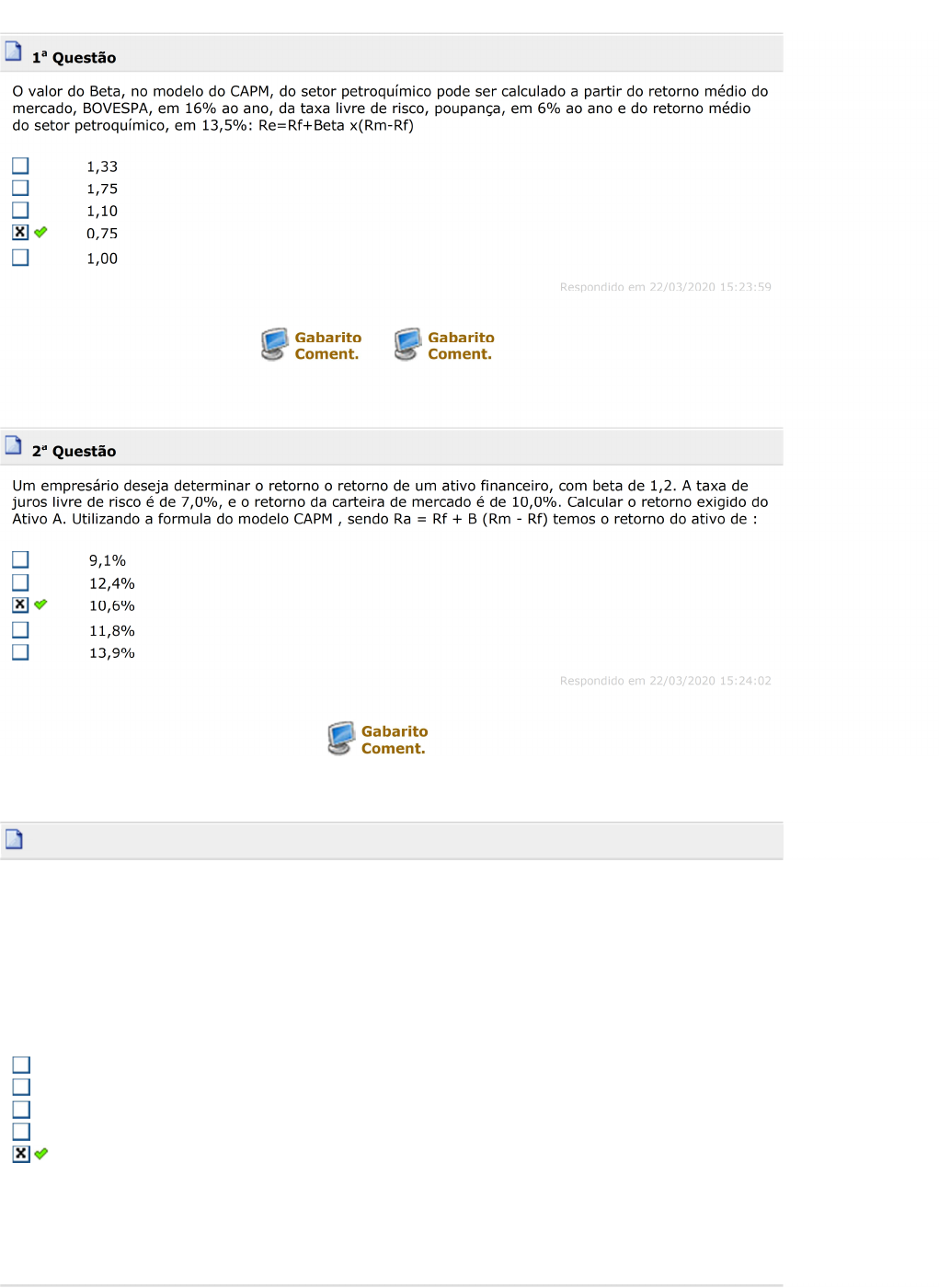 ADM FINANCEIRA AULA 5 1a Questão O valor do Beta, no modelo do CAPM, do setor petroquímico pode ser calculado a partir do retorno médio do mercado, BOVESPA, em 16% ao ano, da taxa livre de risco, poupança, em 6% ao ano e do retorno médio do setor petroquímico, em 13,5%: Re=Rf+Beta x(Rm-Rf) 1,33 1,75 1,10 0,75 1,00 Respondido em 22/03/2020 15:23:59 Gabarito Coment. Gabarito Coment. 2a Questão Um empresário deseja determinar o retorno o retorno de um ativo financeiro, com beta de 1,2. A taxa de juros livre de risco é de 7,0%, e o retorno da carteira de mercado é de 10,0%. Calcular o retorno exigido do Ativo A. Utilizando a formula do modelo CAPM , sendo Ra = Rf + B (Rm - Rf) temos o retorno do ativo de : 9,1% 12,4% 10,6% 11,8% 13,9% Respondido em 22/03/2020 15:24:02 Gabarito Coment. 3a Questão Uma empresa detém uma ação A com participação de 50% na carteira e beta de 1,6, e a ação B com participação de 50% na carteira e beta de 1,2. A taxa de juros livre de risco é de 6,0%, e o retorno da carteira de mercado é de 9,0%. Calcular o retorno exigido da carteira da empresa. Re=Rf+Beta x(Rm-Rf) 9,8% 6,4% 2,1% 7,4% 10,2% Respondido em 22/03/2020 15:24:07 4a Questão Determinado investidor possui uma carteira com 3 ações. A primeira ação possui peso de 50% no portfolio e Beta igual a 1,5. O segundo possui uma participação de 30% e Beta igual a 2,0 e o último um Beta igual a 3,0. Desta forma, qual seria o beta da carteira do investidor em função dessa composição: Ra = Rf + B (Rm - Rf) 2,15 1,95 1,75 1,50 2,00 Respondido em 22/03/2020 15:24:21 Gabarito Coment. Gabarito Coment. 5a Questão Estudamos como se aplica o perfil de risco utilizando o Beta das carteiras, o risco sistemático e não sistemático, e o seu reflexo no retorno do investimento. Com relação ao coeficiente Beta : Ele nunca pode ser positivo Não serve para indicar qual será a variação de um ativo O seu valor é obtido a partir de dados de retorno Ele nunca pode ser negativo É uma medida de risco diversificável Respondido em 22/03/2020 15:24:23 Gabarito Coment. Gabarito Coment. 6a Questão A Empresa Sistemas de Computação, fabricante de programas para computador, deseja determinar o retorno exigido sobre um ativo - Ativo A - que tem um beta de 2,0. Os analistas da empresa determinaram que a taxa de retorno livre de risco encontrada é de 8% e o retorno sobra a carteira de ativos de mercado é 12%. Calcular o retorno exigido pelo ativo A (Provão 2000 - Administração).Utilizando a formula do modelo CAPM , sendo Ra = Rf + B (Rm - Rf) temos o retorno do ativo de : 10% 16% 8% 12% 14% Respondido em 22/03/2020 15:24:26 7a Questão Quando o retorno do ativo equivale ao retorno livre de risco, esse tende a apresentar um beta: positivo menor que um maior que um igual a zero negativo Respondido em 22/03/2020 15:24:33 Gabarito Coment. 8a Questão Um empresário deseja determinar o retorno o retorno de um ativo A, com beta de 1,3. A taxa de juros livre de risco é de 6,0%, e o retorno da carteira de mercado é de 9,0%. Calcular o retorno exigido do Ativo A. Ra = Rf + B (Rm - Rf) 2,1% 9,9% 7,8% 13,8% 6,4%