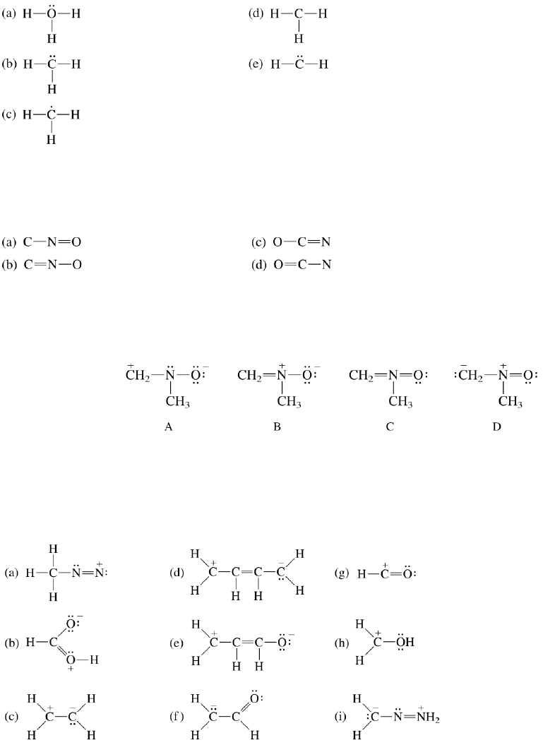 1ª Lista de exercícios 1. Determine a carga formal para cada átomo, assim como a carga total das espécies abaixo. 2. Represente estruturas de Lewis para isômeros do CH3NO que apresentam a unidade estrutural indicada abaixo. (Nenhum dos átomos nas estruturas finais deve possuir carga) 3. Dentre as quatro estruturas abaixo, indique qual não é uma forma de ressonância possível, explicando por que ela está incorreta. 4. Mantendo a mesma conectividade atômica e movendo somente elétrons, represente uma estrutura de Lewis mais estável para cada uma das mostradas abaixo. Especifique as cargas formais das novas estruturas. 5. Faça o que se pede em cada item abaixo. a) Explique o fato de que BeF2 é apolar enquanto OF2 é polar. b) O ângulo da ligação O-S-O, no SO2 é de 116º e todos os ângulos da ligação O-S-O, no SO3 são de 120º. Como você explica esta diferença? c) Qual molécula apresenta momento de dipolo maior que zero, SO2 ou SO3? 6. Aplicando o modelo da Repulsão dos Pares de Elétrons na Camada de Valência, deduza a geometria de cada uma das seguintes espécies: 7. Dentre os hidrogênios assinalados qual é o mais ácido? Justifique. 8. Coloque os seguintes carbocátions em ordem crescente de estabilidade. 9. Considere o composto abaixo, que possui três átomos de bromo em sua estrutura. Qual das ligações C- Br você espera que seja quebrada de forma heterolítica com maior facilidade? Justifique sua resposta. 10. Os álcoois abaixo apresentam os seguintes valores de pKa: 12,4; 9,3; 15,5; 5,4 (não, necessariamente, nessa ordem). Atribua os valores de pKa a cada estrutura e discuta a grande diferença de acidez apresentada na série. 11. Coloque os álcoois abaixo em ordem decrescente de acidez e justifique sua resposta. 12. Coloque os seguintes compostos ou ânions de cada grupo em ordem crescente de basicidade. Para cada grupo, apresente uma explicação para a ordem estabelecida. 13. Os compostos nitrogenados abaixo apresentam os seguintes valores de pKa para seus ácidos conjugados: 10,7; 9,2; e 4,6, respectivamente. Coloque os compostos em ordem crescente de basicidade e apresente uma explicação para a ordem estabelecida. 14. Os compostos N,N-dimetilanilina (1), piridina (2) e 4-(N,N-dimetilamino)piridina (3), apresentam os valores de pKb 8,9; 8,7; e 4,3, respectivamente. Identifique o nitrogênio mais básico no composto 3 e sugira uma explicação para o grande aumento de basicidade desse composto quando comparado com os anteriores. 15. Considere as reações ácido-base abaixo. Identifique o ácido e a base para cada uma e, por meio de setas curvas, represente seus mecanismos. Indique para qual lado tende o equilíbrio, apresentando uma explicação para sua escolha.