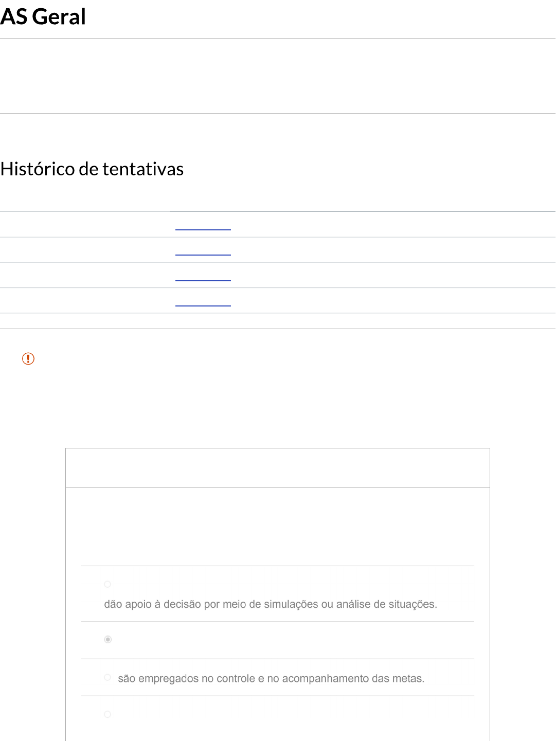 Entrega Sem prazo Pontos 10 Perguntas 20 Disponível 20 mar em 0:00 - 1 abr em 1:00 12 dias Limite de tempo Nenhum Tentativas permitidas 3 Tentativa Tempo Pontuação MANTIDO Tentativa 3 41 minutos 9,5 de 10 MAIS RECENTE Tentativa 3 41 minutos 9,5 de 10 Tentativa 2 64 minutos 9,5 de 10 Tentativa 1 108 minutos 8,5 de 10 As respostas corretas estão ocultas. Pontuação desta tentativa: 9,5 de 10 Enviado 22 mar em 15:57 Esta tentativa levou 41 minutos. 0,5 / 0,5 ptsPergunta 1 Assinale a alternativa que traz a definição do sistema em nível operacional dentro das organizações. controlam toda a operação das organizações. AS Geral: BUSINESS INTELLIGENCE (BI) https://cruzeirodosul.instructure.com/courses/5510/quizzes/16556 1 of 18 22/03/2020 15:59 0,5 / 0,5 ptsPergunta 2 Analise as afirmativas e selecione a alternativa correta. I. Sistemas que possibilitavam aos fabricantes o controle do fluxo de componentes e matérias-primas, que permitiam o planejamento antecipado. II. Sistemas que se relacionam a todo o fluxo de materiais, informações e serviços de fornecedores, que procuram reduzir os riscos e as incertezas nas redes de fornecimento, controlando os níveis de armazenamento e processos negociáveis. III. Sistemas desenvolvidos nos anos 1990, que passavam a cobrir todas as atividades do negócio da Empresa. A afirmativa I descreve os sistemas MRP e MRPII, a afirmativa II descreve os sistemas SCM e a afirmativa III descreve os sistemas ERP. AS Geral: BUSINESS INTELLIGENCE (BI) https://cruzeirodosul.instructure.com/courses/5510/quizzes/16556 2 of 18 22/03/2020 15:59 0,5 / 0,5 ptsPergunta 3 Assinale a alternativa que traz a definição dos sistemas ERP. controlam toda a operação das organizações e atendem a todas as áreas. AS Geral: BUSINESS INTELLIGENCE (BI) https://cruzeirodosul.instructure.com/courses/5510/quizzes/16556 3 of 18 22/03/2020 15:59 0,5 / 0,5 ptsPergunta 4 Assinale alternativa traz a correta definição para Business Intelligence. BI é um conjunto de conceitos, métodos e tecnologias que propõe-se a transformar o conjunto de dados em uma organização em informação ou conhecimento útil. AS Geral: BUSINESS INTELLIGENCE (BI) https://cruzeirodosul.instructure.com/courses/5510/quizzes/16556 4 of 18 22/03/2020 15:59 0,5 / 0,5 ptsPergunta 5 Assinale alternativa traz a correta relação com os sistemas OLTP. Armazenam milhares ou milhões de transações individuais, diariamente, seus objetivos são, principalmente, fornecer consistência nas informações e capacidade de suportar inserção e atualizações nos dados oriundos das diversas transações. AS Geral: BUSINESS INTELLIGENCE (BI) https://cruzeirodosul.instructure.com/courses/5510/quizzes/16556 5 of 18 22/03/2020 15:59 0,5 / 0,5 ptsPergunta 6 Assinale a alternativa que traz a correta definição do processo ETL. processo que resgata os dados, faz um processamento inicial e posteriormente os insere no data warehouse. AS Geral: BUSINESS INTELLIGENCE (BI) https://cruzeirodosul.instructure.com/courses/5510/quizzes/16556 6 of 18 22/03/2020 15:59 0,5 / 0,5 ptsPergunta 7 Assinale a alternativa que traz a definição de mineração de dados. é o processo de descobrir informações relevantes, como padrões, associações, mudanças, anomalias e estruturas em grandes quantidades de dados armazenados em bancos de dados, depósitos de dados ou outros depósitos de informação. AS Geral: BUSINESS INTELLIGENCE (BI) https://cruzeirodosul.instructure.com/courses/5510/quizzes/16556 7 of 18 22/03/2020 15:59 0,5 / 0,5 ptsPergunta 8 Analise as afirmativas e assinale a alternativa correta: I - é um conceito de utilização de banco de dados que armazena dados correntes e históricos de potencial interesse para os tomadores de decisão de toda a empresa. II - facilita o formato de visualização dos dados, ou seja, não está mais próximo de como um analista vê, mas sim, como um gerente ou executivo prefere observar os dados, simplificando a apresentação e permitindo que o usuário altere a visão facilmente. III - exemplos são dinheiro, volume de vendas, número de funcionários, estoque; observe que essa tabela de fatos deve possuir uma grande quantidade de chaves para relacionamentos. I – Data warehouse, II – modelagem dimensional, III – medidas ou fatos. AS Geral: BUSINESS INTELLIGENCE (BI) https://cruzeirodosul.instructure.com/courses/5510/quizzes/16556 8 of 18 22/03/2020 15:59 0 / 0,5 ptsPergunta 9Incorreta De acordo com a descrição do processo KDD, selecione a alternativa que traz a fase do processo KDD que se relaciona com a execução que tratam da uniformização dos dados, cálculos de medidas e métricas intrínsecas ao negócio. Mineração de dados. AS Geral: BUSINESS INTELLIGENCE (BI) https://cruzeirodosul.instructure.com/courses/5510/quizzes/16556 9 of 18 22/03/2020 15:59 0,5 / 0,5 ptsPergunta 10 Analise as afirmativas e assinale a alternativa correta. I – armazena o conjunto completo de dados da organização. II – tende a ser menor e armazenar os dados de áreas específicas da organização ou associadas a uma unidade de negócio. III – sistemas que resgatam os dados, cria outras áreas de dados e gerem os dashboards e relatórios analíticos. I – data warehouse, II – data mart, III – processo OLAP. AS Geral: BUSINESS INTELLIGENCE (BI) https://cruzeirodosul.instructure.com/courses/5510/quizzes/16556 10 of 18 22/03/2020 15:59 0,5 / 0,5 ptsPergunta 11 Selecione a alternativa que não traz um aspecto importante da fase de levantamento de requisitos. tipo de SGBD AS Geral: BUSINESS INTELLIGENCE (BI) https://cruzeirodosul.instructure.com/courses/5510/quizzes/16556 11 of 18 22/03/2020 15:59 0,5 / 0,5 ptsPergunta 12 Um data warehouse possui os tipos de modelagem dimensional, relacional e modelagem em rede. False 0,5 / 0,5 ptsPergunta 13 A análise preditiva usa algoritmos sofisticados projetados para analisar os dados em um data warehouse e identificar? AS Geral: BUSINESS INTELLIGENCE (B