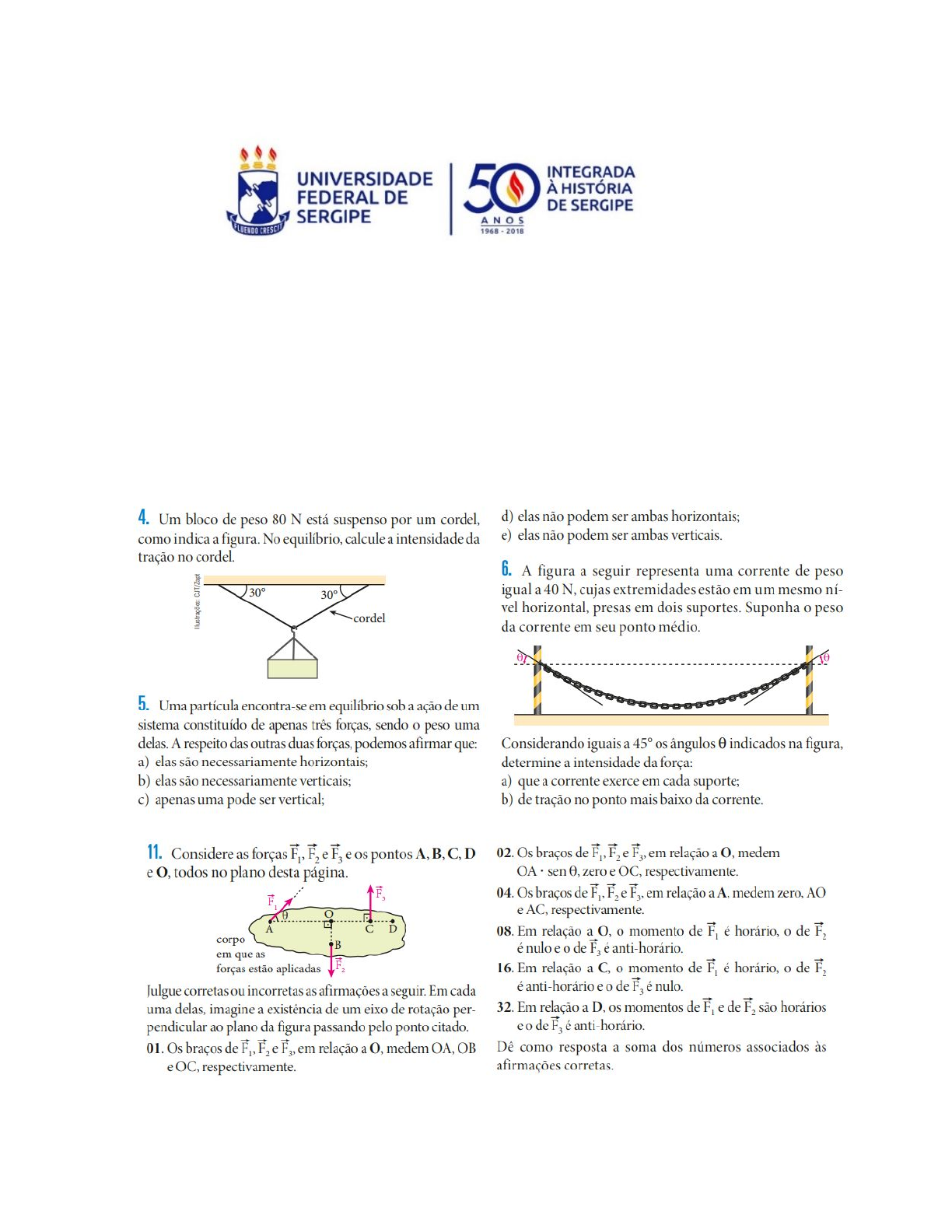Disciplina: FISI0142-Física Básica Prof. Dr. Diogo Martins Souto 5a Lista de Exercícios Estática dos sólidos Gabarito, 4- 80N, 5- alternativa d é correta, 6a - 20√2 N, 6b - 20N, 11- Só a 01 está incorreta. Todas as demais afirmações estão corretas. A soma é: (02 1 04 1 08 1 16 1 32) 5 62 13 - 50cm 14 - 300N Estática dos fluidos Gabarito 3- 1/3 5a- μgh, 5b - μghA 6- 7N 8- a 17 - 1atm 18 - 24cm 20a - 1000N, 20b - T1 = T2 = 30000J 21a - 8000N, 21b - 3.2 10^5 Pa Hidrodinâmica 1 - Demonstre a equação de Torricelli Gabarito???