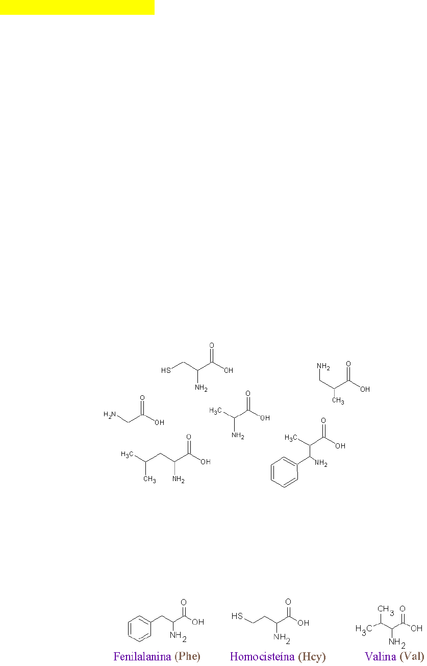 Lista Aminoácidos & Proteínas 01. Uma das mais interessantes formas de classificação das proteínas é através de sua função biológica. Abaixo estão algumas classes e suas definições e alguns exemplos.. Associe corretamente as colunas. (a) Enzimas (b) Músculos (c) Hormônios (d) Proteínas de transporte (e) Proteínas estruturais (f) Proteínas de proteção ( ) mantém a forma de células e tecidos ( ) responsáveis pelo movimento de órgãos e tecidos ( ) carregam moléculas de um lugar para outro, no organismo ( ) alteram o comportamento fisiológico de outras células ( ) auxiliam na manutenção da integridade física do organismo ( ) catalisam reações biológicas ( ) miosina e actina ( ) queratina e colágeno ( ) hemoglobina ( ) hexoquinase ( ) anticorpos ( ) insulina 02. Dentre os compostos listados abaixo, há duas moléculas que não são exemplos de aminoácidos que formam proteínas nos seres vivos. (a) qual são estes dois aminoácidos? (b) como você pode dizer isto sem necessitar do uso de nenhuma lista ou tabela? 03. As 3 substâncias abaixo são aminoácidos presentes em muitas das proteínas de nosso organismo. Os peptídeos são compostos formados pela ligação peptídica entre o grupamento ácido do primeiro e a amina do segundo aminoácido. Escreva a fórmula estrutural dos peptídeos: (a) Phe-Hcy (b)Val-Phe (c) Hcy-Val 04. (a) Quais dos aminoácidos abaixo possui uma cadeia lateral hidrofóbica? 05. O que é a desnaturação de uma proteína? Quais são os agente desnaturantes? 06. Defina estrutura primária, secundária, terciária e quaternária de uma proteína. 07. O que é a estrutura αααα-hélice de uma proteína? Que tipo de forças mantém esta estrutura? Como é a estrutura Folha-ββββ? 08. Os aminoácidos são compostos quirais. Mostre os dois isômeros do aminoácido alanina, e indique qual é o único que ocorre nos seres vivos. 09. O que são proteínas fibrosas e globulares? Que experimento simples pode distinguir uma da outra? 10. Dentre os elementos abaixo, qual está presente apenas em alguns dos aminoácidos constituintes das proteínas? a) carbono. b) hidrogênio. c) nitrogênio. d) oxigênio. e) enxofre. 11. Que tipo de cadeia lateral está em geral, presente nos resíduos de aminoácidos situados no interior de proteína hidossolúvel? E na sua superfície? DESAFIO 12. As proteínas podem ser conjugadas, pois formam complexos com outros tipos de compostos, orgânicos ou inorgânicos. Estes compostos são chamados de grupos prostéticos. Associe corretamente as colunas abaixo: Proteína Conjugada Grupo prostético (a) Lipoproteínas (b) Glicoproteínas (c) Fosfoproteínas (d) hemoproteínas (e) flavoproteínas (f) metaloproteínas ( ) íons ferro, cálcio, zinco, cobre ( ) porfirina de ferro ( ) carbohidratos ( ) lipídeos ( ) grupos fostato ( ) nucleotídeos flavonóides Para auxiliar na realização dos exercícios, segue a tabela com as estruturas dos 20 aminoácidos que compõem nossas proteínas.