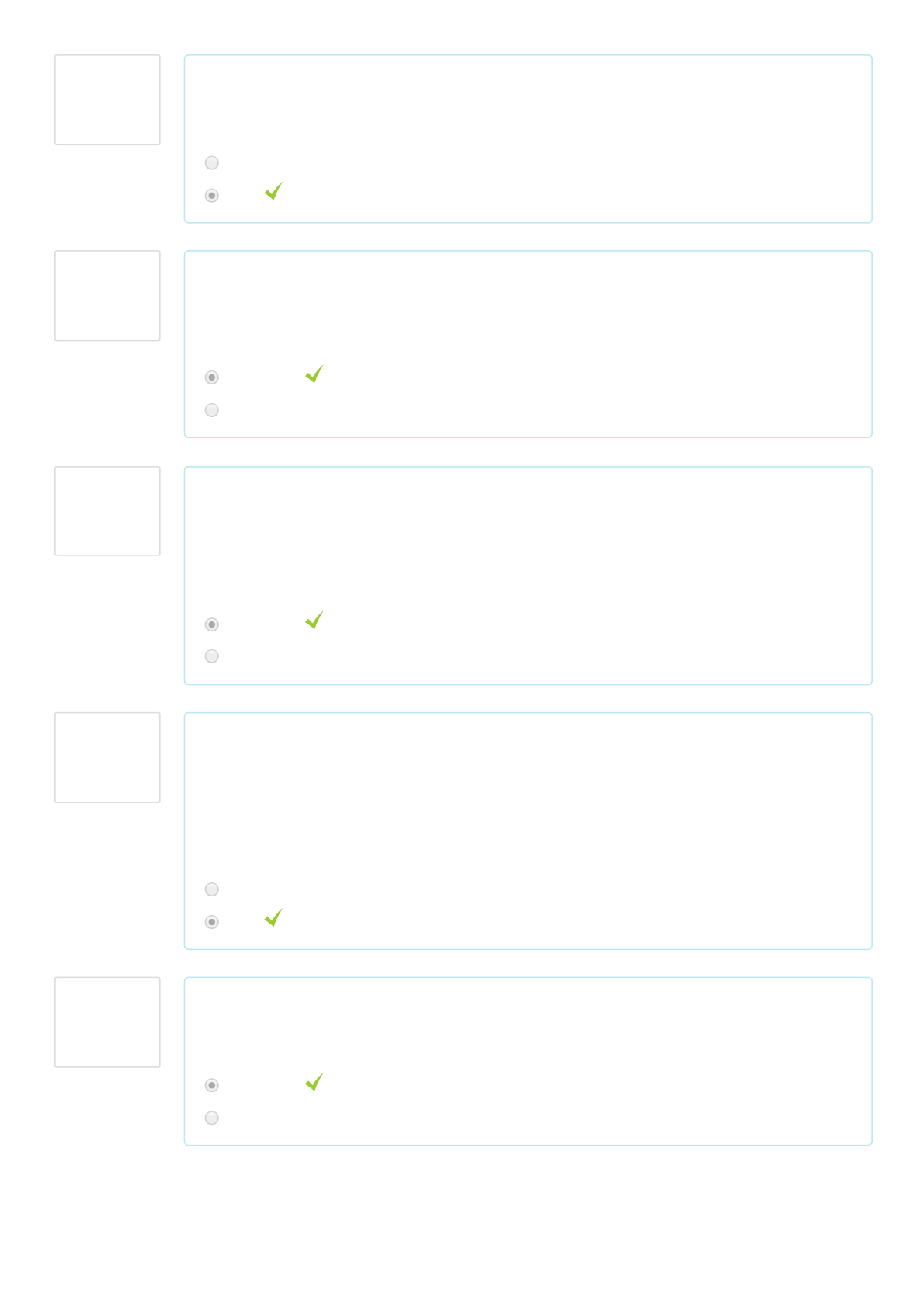 10/03/2020 Atividade 07 https://www.certificacaotecnica.com.br/mod/quiz/review.php?attempt=680310 1/2 Questão 1 Correto Atingiu 1,00 de 1,00 Questão 2 Correto Atingiu 1,00 de 1,00 Questão 3 Correto Atingiu 1,00 de 1,00 Questão 4 Correto Atingiu 1,00 de 1,00 Questão 5 Correto Atingiu 1,00 de 1,00 Quando o condutor for rígido, deve-se tornar flexível a sua extremidade, ou então, usar um terminal apropriado. Escolha uma opção: Verdadeiro Falso Ao ser efetuada a ligação de um condutor em um terminal com parafuso, deve-se fazer a volta no condutor no mesmo sen�do da rotação do parafuso ao ser apertado, para evitar que o condutor escape debaixo da cabeça do parafuso. Escolha uma opção: Verdadeiro Falso Emendas e Derivações devem garantir a continuidade elétrica e a resistência mecânica do circuito elétrico, podendo ser: Os condutores de pequeno diâmetro usa-se torcer um condutor sobre o outro; Escolha uma opção: Verdadeiro Falso Emendas e Derivações devem garantir a continuidade elétrica e a resistência mecânica do circuito elétrico, podendo ser: Quando se trata de condutores menores, usa-se um fio mais grosso enrolado sobre a emenda, a fim de melhorar a resistência mecânica. Escolha uma opção: Verdadeiro Falso Os Materiais e Componentes a serem u�lizados na instalação elétrica, devem ser de qualidade, garan�dos e adequados para a função específica etc. Escolha uma opção: Verdadeiro Falso 10/03/2020 Atividade 07 https://www.certificacaotecnica.com.br/mod/quiz/review.php?attempt=680310 2/2 Questão 6 Correto Atingiu 1,00 de 1,00 quanto a limpeza, recomenda-se que após o acabamento geral, os disposi�vos deverão ser destampados, limpos novamente e em seguida finalizar o acabamento, colocando as placas das caixas e fazendo um teste final do funcionamento dos circuitos elétricos. Escolha uma opção: Verdadeiro Falso