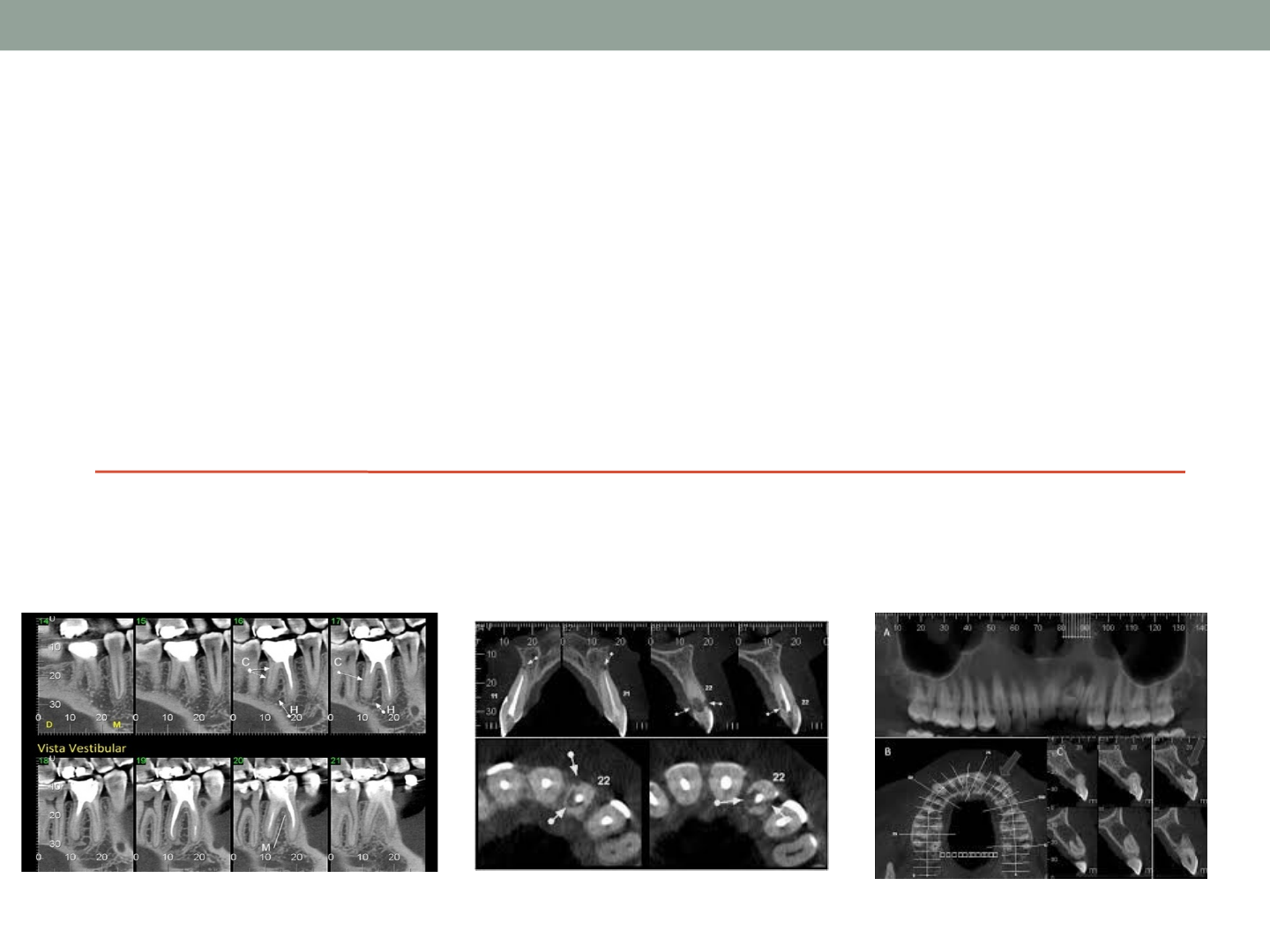 Tomografia computadorizada de feixe cônico em endodontia Equipe Alessandra Cruz Amanda Maria Ana Beatriz Ana Caroline Antônio Edson Iohanna Introdução Endondotia: ramo da odontologia que trata da etiologia, diagnóstico, terapêutica e profilaxia das doenças e lesões que afetam a polpa dentária e a raiz dentária, bem como o tecido periapical. Radiografia panorâmica não é tão utilizada para esta especialidade; Limitações da radiografia convencional e Indicações da TCFC • Aumento do espaço do ligamento periodontal; • Rompimento de cortical óssea; • Fraturas e perfurações radiculares; • Perda óssea em região de furca; • Estudo da anatomia dentária; • Estabelecimento do comprimento de trabalho; • Confirmação da colocação do cone principal de guta-percha; • Avaliação do sucesso do tratamento; Tomografia computadorizada por feixe cônico em endodontia Indicações da radiografias intrabucais: Estudo da anatomia dentária da cavidade pulpar e da região óssea circundante; Estabelecimento do comprimento de trabalho; Confirmação da colocação do cone principal de guta-percha; Avaliação do sucesso do tratamento; Bidimensionalidade (observador cria mentalmente em 3 dimensões); Sobreposição de estruturas anatômicas, ex: raízes superiores com processo zigomático, raízes divergentes; Alta resolução; Suplanta as limitações das técnicas convencionais; Informações desapercebidas na rotina da endodontia; Radiografia Periapical Tem como função diagnosticar lesões e alterações em regiões de periapice, onde na endodontia as estruturar bidimensionais da radiografia tem que reproduzir estruturas tridimensionais. Periapicopatias Periapicopatias As lesões periápice constituem grande parte das afecções tratadas pela endodontia, e para um plano de tratamento adequado são necessárias informações precisas. Lesões periapicais observadas por exame de TCFC apresentam aspectos de hipodensidade. Reabsorções dentarias; Afecção sinusais por infecções endodônticas (dentes posteriores); aspecto de hiperdensidade; Fig 2- nos cortes axiais (A e D), coronal (B e E) e sagital (C e F), notam-se os condutos radiculares da raiz distal do dente 36 e extravasamento de material obturador nessa raiz. Fig 2- Rompimento da cortical vestibular na região entre os elementos dentários 12 e 13, fig3- Reconstrução em 3D demonstrando a destruição dos corticais fig3- Sisunopatia inflamatória de origem dentaria. Indicações da TCFC Estudo de anatomia dentaria; Casos de sobreposição das estruturas; caso em que o exame convencional não detectou a doença periapical, contradizendo os testes clínicos; Analise radiográfica de tratamento endodôntico com sintomatologia persistente; Acompanhamento radiográfico de lesoes periapicais; Planejamento e acompanhamento de cirurgias parendodôntica; Correlação clínica entre sintomatologia sinusal e periapicopatias; Fraturas Radiculares Fraturas Radiculares Fraturas horizontais e verticais; Fraturas horizontais são tipicamente de origem traumáticas; Fraturas verticais tendem a uma origem iatrogenica, em consequência do ''efeito cunha'‘; TCFC tem mostrado maior grau de confiabilidade, visualização 3D e alta resolução; Sinais clínicos podem aparecer somente 1 a 2 anos apos a lesão; fig1- sinusopatia inflamatória em tomografica computadorizada por feixe cônico, causada por pericoapatia. (A) lesão periapical no elemento 15, promovendo abaulamento e rompimento da cortical inferior do seio maxilar direito. nota-se também um cisto de retenção de muco. (B) rompimento da cortical inferior do seio maxilar fig2- (A) radiografia panorâmica sugestiva de alteração nos dentes 25 e 26, com dificuldade de visualização do contorno das raízes do dente 26. (B) imagem axial de tomografia computadorizada da raiz meiovestibular do dente 26. (C e D) imagens coronal e sagital: ponto de descontinuidade do assoalho do seio maxilar esquerdo e extravasamento de material intralesional para o seio maxilar ipsilateral. fig3- (A) na radiografia periapical ve-se o tratamento endodontico do dente 26 apenas na raiz distal. (B) corte axial com imagem hipodensa adjacente as raizes vestibulares, compativel com reabsorção ossea. (C e D) ausencia da cortical do assoalho do seio maxilar esquerdo correspóndente ao dente 26. fig4- (A) radiografia periapical: observa-se tratamento endodôntico no dente 14 com aumento do espaço pericementário. (B) imagem axial evidenciando fratura intrarradicular no dente 14. (C) imagem coronal salientando a fratura e a fenestração da tabua óssea vestibular. (D) na imagem sagital não é possível ver a fratura, visto se tratar no sentido longitudinal. fig5- (A) radiografia periapical: veem-se tratamento endodôntico e núcleo metálico na raiz distal do dente 36 e aumento do espaço pericementário na raiz mesial. (B) imagem axial podendo representar fratura na raiz mesial do dente 36. (C) na imagem coronal, nota-se ausência de dois terços da cortical vestibular do dente. (D) na imagem sagital, a mesma imagem representada em B o que pode ser compatível com fratura, adicionado importante informação em relação a axial. O dente 36 apresenta rarefação óssea periapical na raiz mesial. Artefatos Metálicos Reabsorção Radiculares Reabsorção Radiculares A reabsorção radicular é causada por traumatismos dentários, periapicopatias e movimentos ortodônticos. TCFC determina uma imagem precisa do tamanho e localização da área de reabsorção. Reabsorção invasiva cervical é um tipo de reabsorção externa agressiva e incomum na região cervical da raiz. Hipodensa. A pressão do folículo dentário causando reabsorção radicular. Canais Acessórios Canais Acessórios Qualquer ramo do canal principal ou câmara pulpar que se comunica com a superfície externa da raiz. Eles são uma das principais causas de reinfecção do canal radicular e de fracassos do tratamento endodôntico. 
