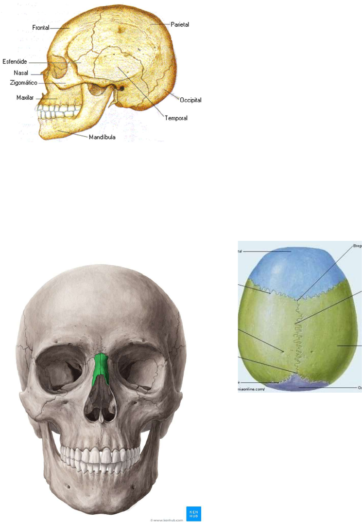 SOBRE A NORMA LATERAL: todos que foram destacados em negrito são LIMITES. Cabeça Ossea 1. Neurocrânio (cranio) – 2 ossos Frontal Parental Temporal Occipital Etmoide Esfenoide 2. Viscerocrânio (ossos da face) - 14 ossos Nasal(2) Lacrimais (2) Zigomático (2) Maxila (2) Palatino (2) *ossos em forma de L Colcha nasal (2) Vôlmer (1) *parte do septo nasal Mandibula *único osso movel, articulavel, atm Acidentes anatomicos da cabeça ossea Calvaria Superficie externa Base do cranio Exocranio ou norma externa Norma frontal/plano frontal Norma lateral Norma occipital Calvaria OSSOS: Frontal Parietais(forames variados) *veias emissárias Occipital SUTURAS: Coronal ou frontal Sagital Lambdoidea PONTOS CRANIOMETRICOS: Pontos determinados na cabeça ossea para fazer mediçoes afim de um tratamento SOBRE A NORMA LATERAL: todos que foram destacados em negrito são LIMITES. Bregma Lambda Nos Recem nascidos há a ausencia de PC, criando por volta dos 2 anos. Essa ausencia é justificada para a passagem do bebe no canal vaginal. Norma lateral Fossa temporal É uma região Com excessão do zigomático, os demais ossos formam o PTÉRIO (PC) 1. Osso frontal - Crista temporal - linha temporal superior 2. Osso parietal - linha temporal superior - linha tenporal inferior (musculo temporal * origem) 3. Osso temporal - crista supramastoidea - arco zigomatico; processo zigomatico 4. Osso zigomatico -Arco zigomático; processo temporal - Margem posterior forame zigoamatico temporal 5. Osso esfenoidal -Asa maior 6. Meato acustico externo (osso temporal) 7. Mastoide (osso temporal) * pode ou não existir forames Astério (PC) Encontro dos ossos : parietal, occipital, temporal Região infratemporal LIMITES: Superior - nivel do arco zigomático Inferior - Aberto Anterior e posterior - abertos Lateral – ramo da mandibula Medial – tuber ou tuberosidade (maxila) Lamina lateral do processo pterigoide (esfenoide) Fissura pterigomaxilar Fossa pterigopalatina (medial a fissura pterigomaxilar) - plexo venoso - arteria maxilar - N. maxilar e seus ramos SOBRE A NORMA LATERAL: todos que foram destacados em negrito são LIMITES. - Gordura Fossa pterigopalatina – mais larga superiormente, passa o N. maxilar, a anaestedia atua em toda a hemiarcada - comunicações (6) Medial c/ cavidade nasal Forame esfenopalatino(abertura) – vasos e nervos de mesmo nome Anterior C/ cav. Orbital, fissura inferior ou fenda esfenomaxila – passa o N. maxilar (ramos), há vasos que acompanham esse ramo. Lateral c/ parede posterior do seio maxilar - forames alveolares superiores posteriores - vasos e nervos com o mesmo nome, cruzam com a fissura piterigomaxilas INFERIOR c/ cav. Oral - canal palatino - nervos palatinos Posterior c/ endocranio - firane redondo, o qual passa o N. maxilar - C anal pterigoideo – vasos e nervos de mesmo nome Norma frontal Osso frontal - Bossas frontais - arcos superciliares - sutura frontal - glabela - Margem supraorbital – forame ou incisura supraorbital – v. e N. de mesmo nome - forame ou incisura frontal ou supratroclear (medial) - processo maxilar do frontal (margem medial da orbita) - processo zigomatico - processo zigomatico – lateral da orbita Osso Nasal - sutura internasal - sutura fronto-nasal - NASIO(pc) - incisura nasolobular Osso Zigomático - Forame zigomaticotemporal - Processo maxilar do zigomático – margem infraorbital - processo frontal do zigomático (margem lateral da orbita) – participa das margens lateral e e inferior (infraorbital) da orbita. Osso Maxila -Processo frontal da maxila (margem medial da orbita) - processo zigomatico da maxila (margem infraorbital) - Sutura zigomaticomaxilar - forame infraorbital - processo alveolar – eminencia alveolar – superf. Vestibular – eminencia canina; fossa canina; via de acesso cirurgicodo serio maxilar -Sutura intermaxilar - espinha nasal anterior (PC) MAXILA + NASAIS = ABERTURA PERIFORME (Abertura ossea anterior das cav, nasais) SOBRE A NORMA LATERAL: todos que foram destacados em negrito são LIMITES. Cavidades nasais SEPTO OSSEO vomer lamina perpendicular do etmoide CONCHAS NASAIS suprema , superior e média. – Inferior Apenas a media e a inferior da para enchergar, as duas primeiras são variaveis. Cavidades orbitais (7 ossos) Osso frontal Fossa lacrimal Fovea troclear (medial) Zigomatico Forame zigomatico orbital Maxila Sulco infraorbital Canal infraorbital Lacrimal -Sulco lacrimal ou fossa so saco lacrimal -Conduto lacrimonasal Etmoide -Forame etmoidal anterior -// // posterior Esfenoide -Forame optico – A. oftalmica e n. optico -Fissura orbital superior – fenda esfenoidal - fissura orbital inferior – N. infraorbital Palatino Mandibula SOBRE A NORMA LATERAL: todos que foram destacados em negrito são LIMITES. Corpo. (face externa) Sinfise da mandibula Protuberancia mentual Eminencias mentuais (2) Processo alveolar – eminencia alveolar Forame mentual (2) Linha obliqua Superfice interna – linha milo-hioidea Anterior – fovea sublingual Posterior - // submandibular Espinhas geninanas 2 superiores 2 inferiores Forame retromentual (varia) Fossa digastrica Ranos da mandibula SUPERIORES Processo coronoide Processo condilar Colo da mandibula Cabeça da mandibula Incisura da mandibula INFERIOR E POSTERIOR Livres O ângulo da mandibula gera o gonion (PC) ANTERIOR Linha obliqua RAMOS EXTERNOS Tuberosidade mesentérica SOBRE A NORMA LATERAL: todos que foram destacados em negrito são LIMITES. RAMOS INTERNOS Fovea pterigoidea – colo da mandibula Forame da mandibula – canal da mandibula (corpo e ramo) Lingula Sulco milo-hiloideo Crista temporal Fossa retromolar Trigono retromolar seio maxilar